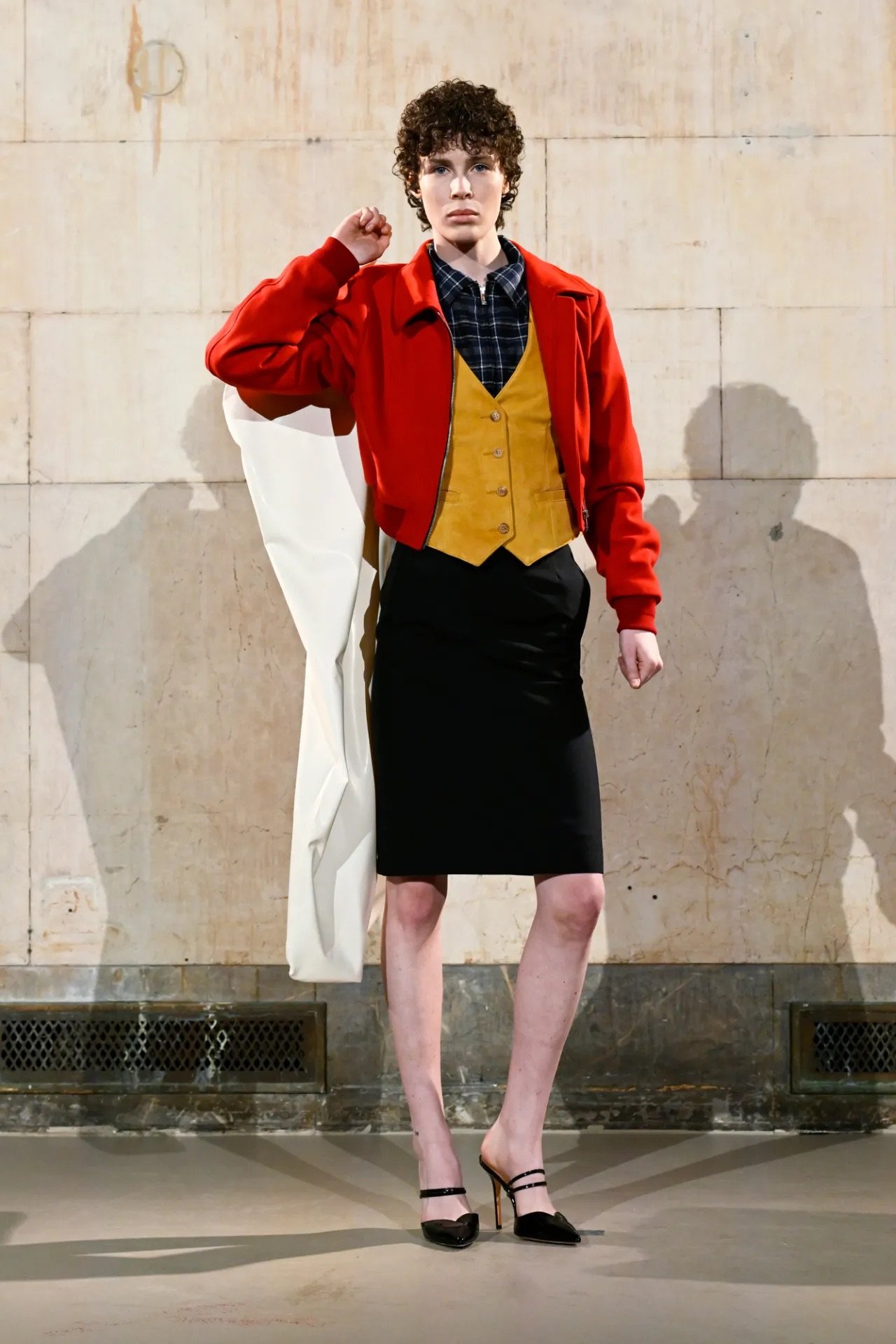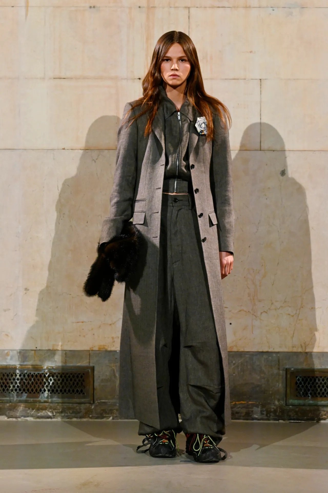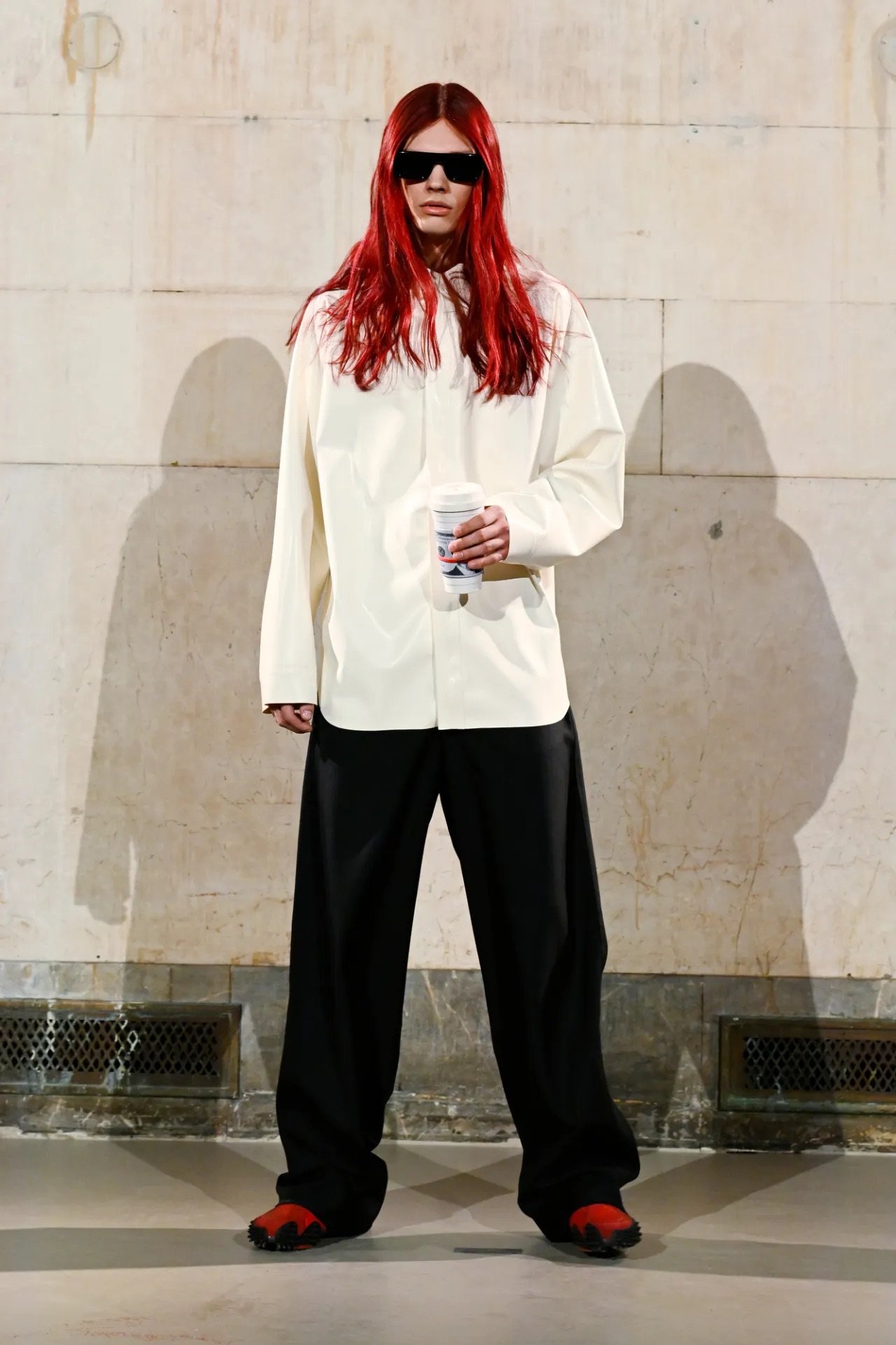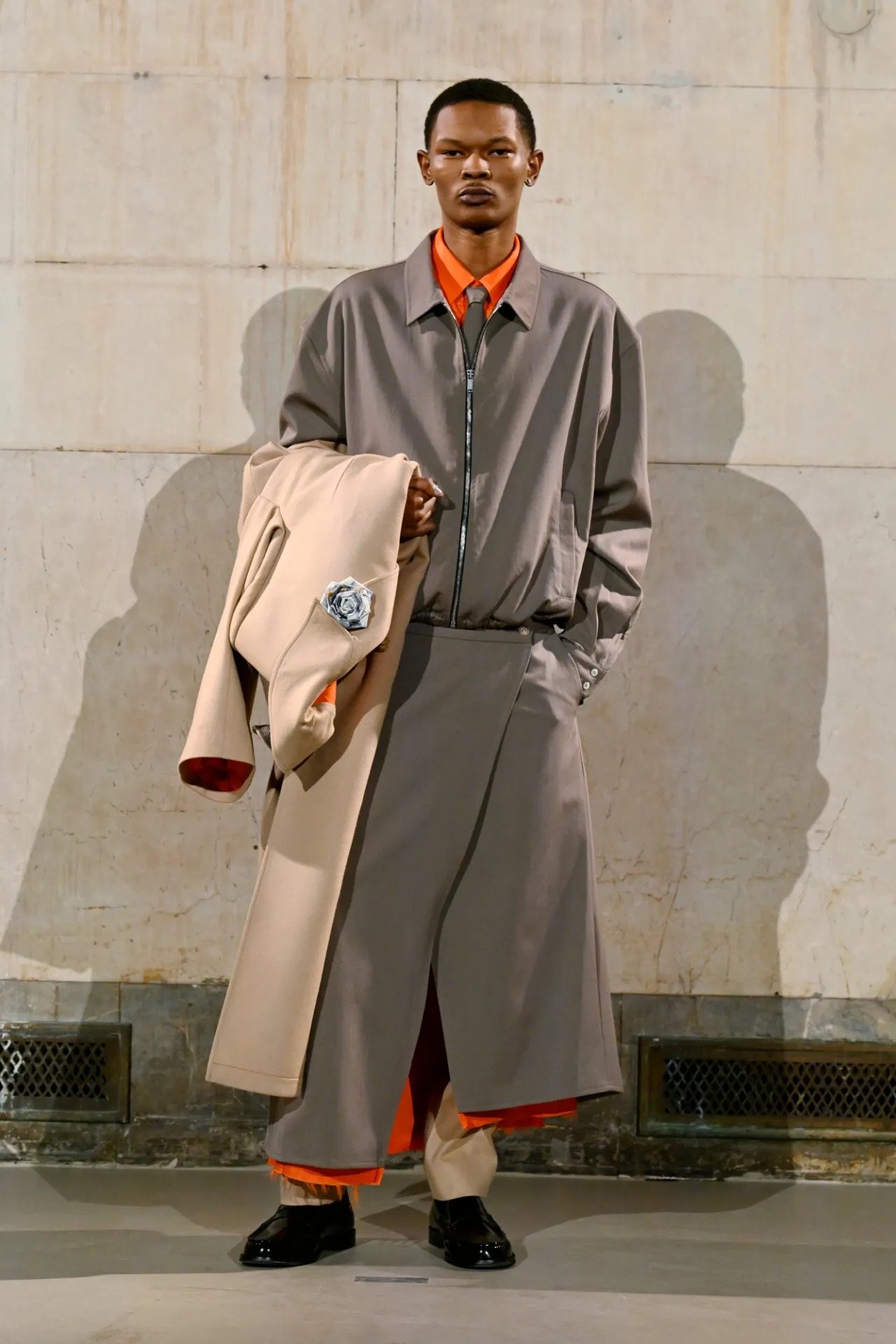 The show itself broke from convention. Guests were brought into the backstage world, with makeup stations set up directly on the runway and a live feed projecting behind-the-scenes preparations across the walls of a grand former bank space. Rocky said he wanted people to see the process, including its imperfections.