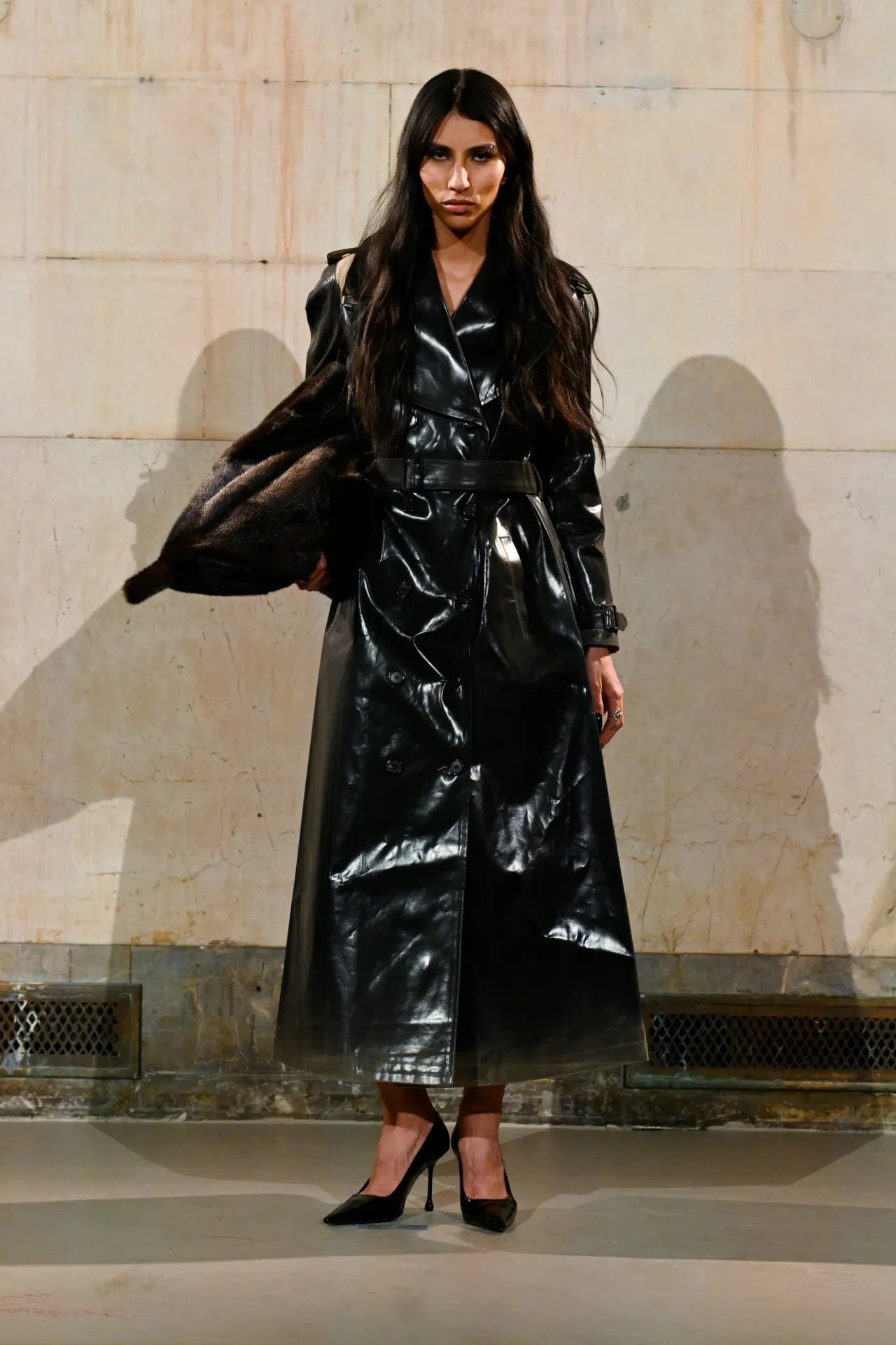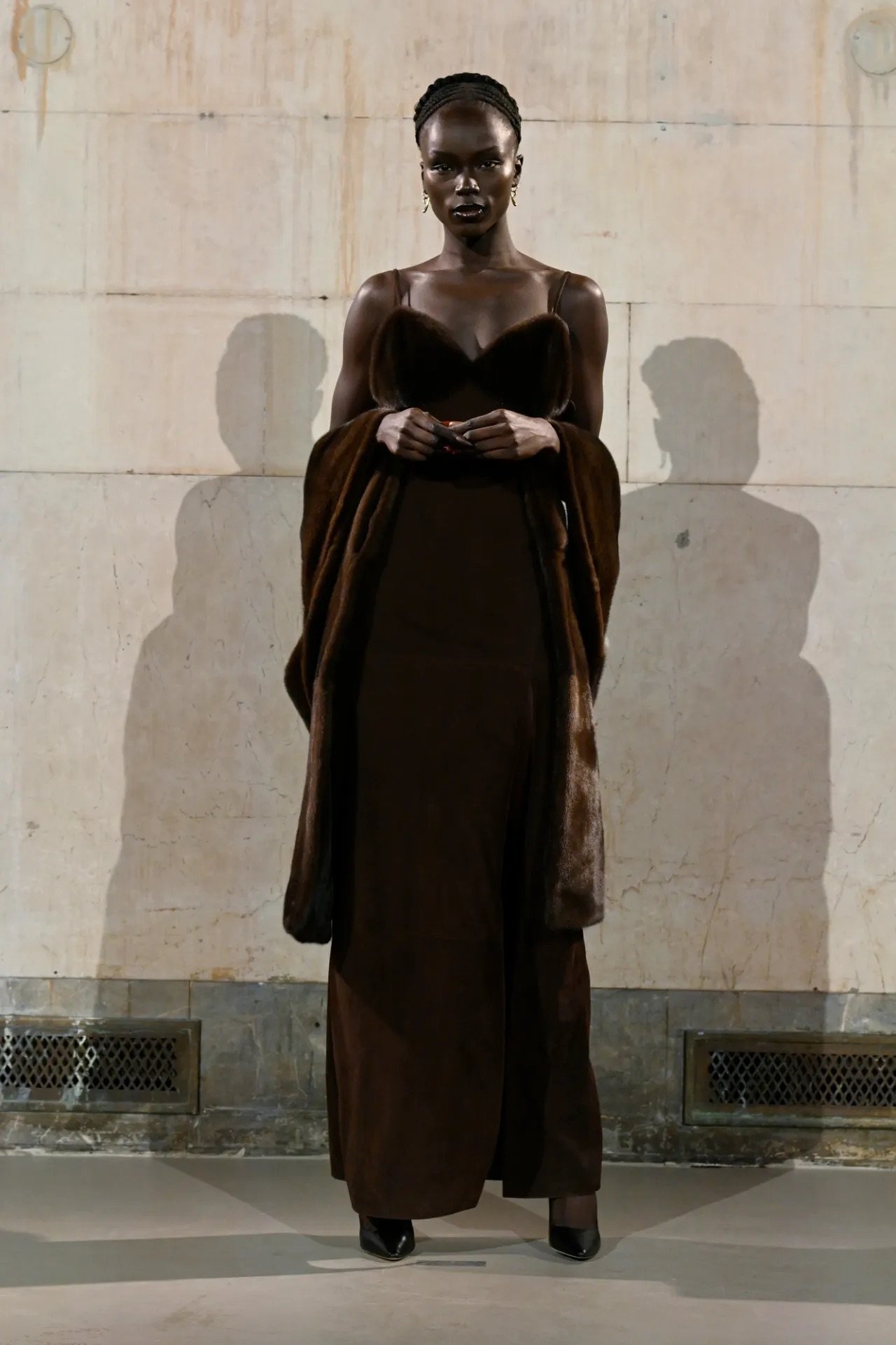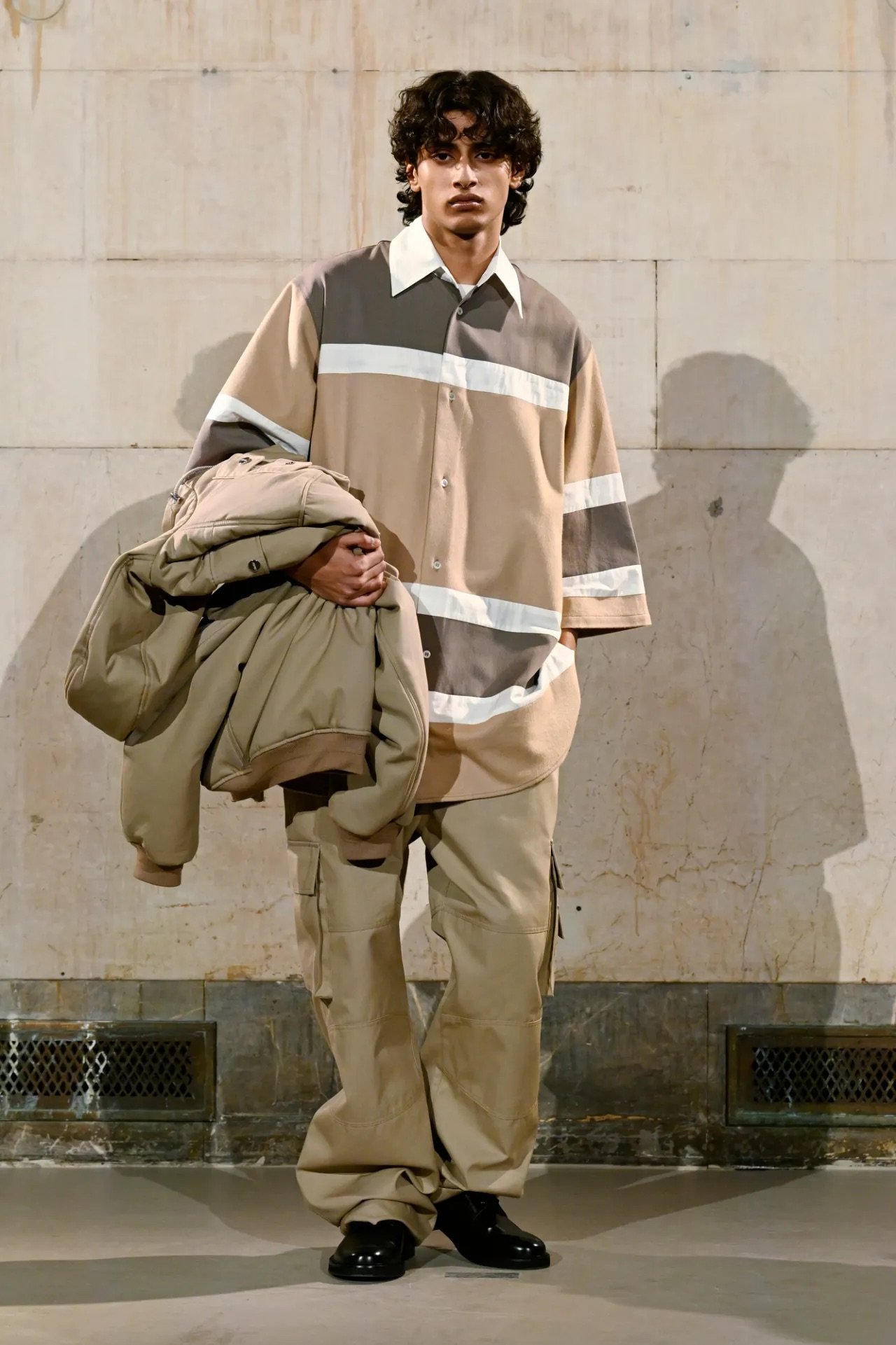 The show itself broke from convention. Guests were brought into the backstage world, with makeup stations set up directly on the runway and a live feed projecting behind-the-scenes preparations across the walls of a grand former bank space. Rocky said he wanted people to see the process, including its imperfections.