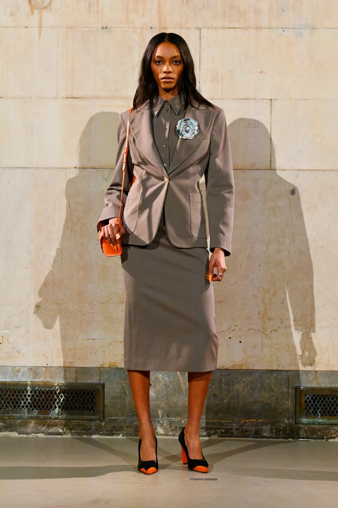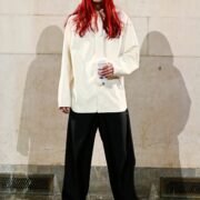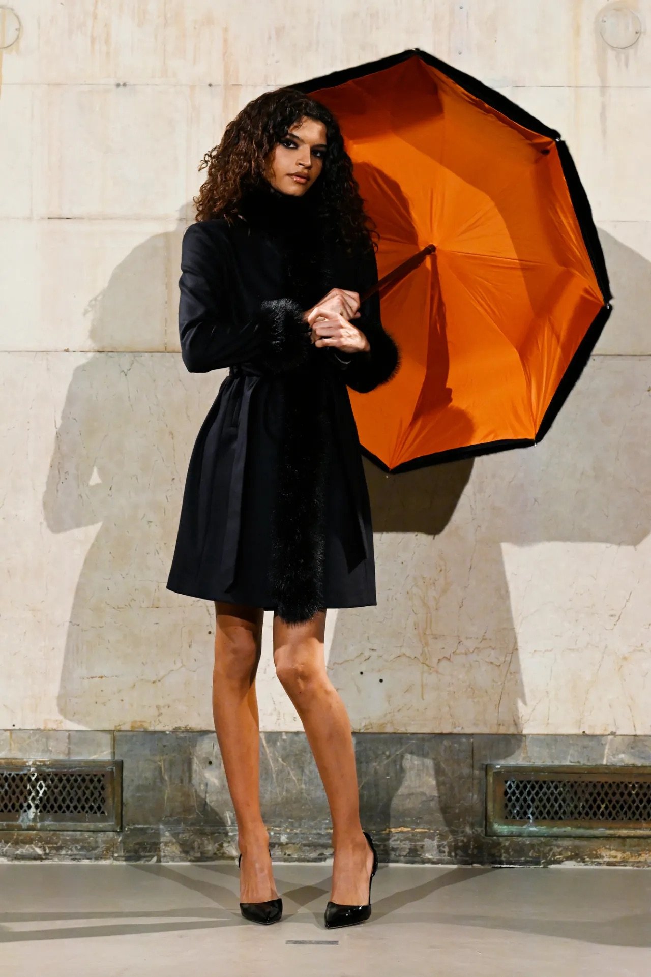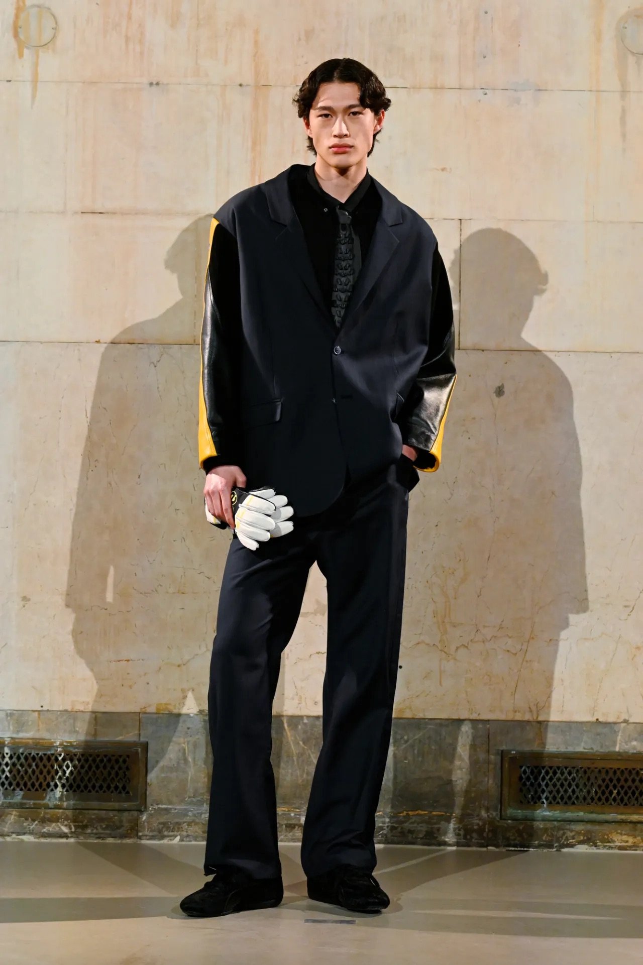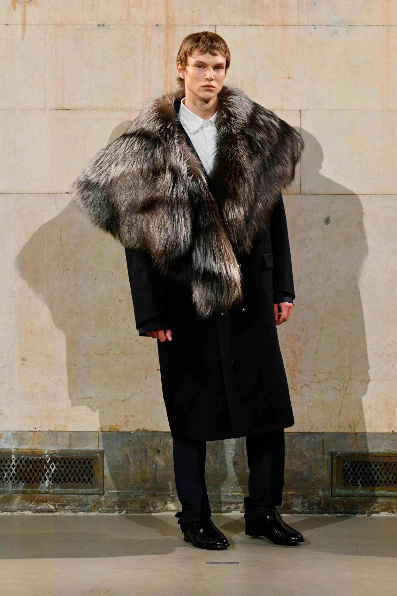 The show itself broke from convention. Guests were brought into the backstage world, with makeup stations set up directly on the runway and a live feed projecting behind-the-scenes preparations across the walls of a grand former bank space. Rocky said he wanted people to see the process, including its imperfections.
