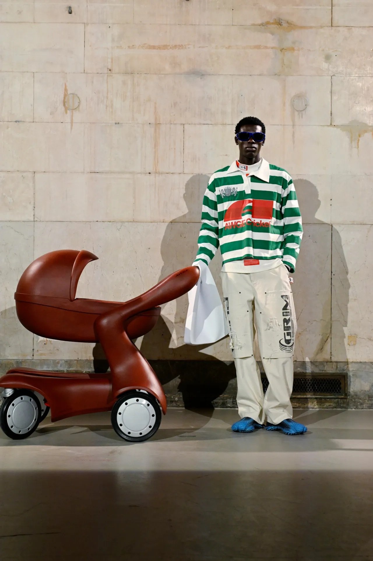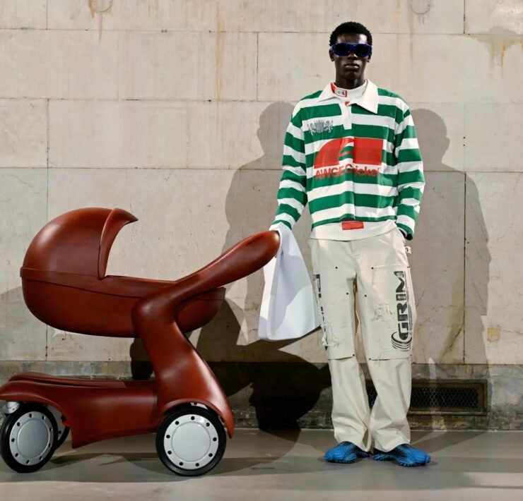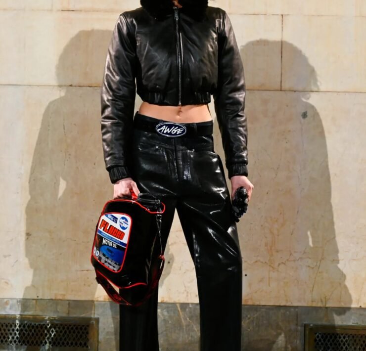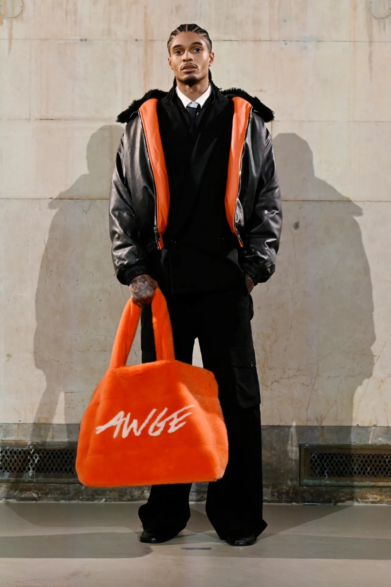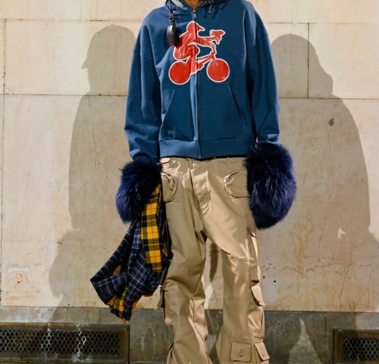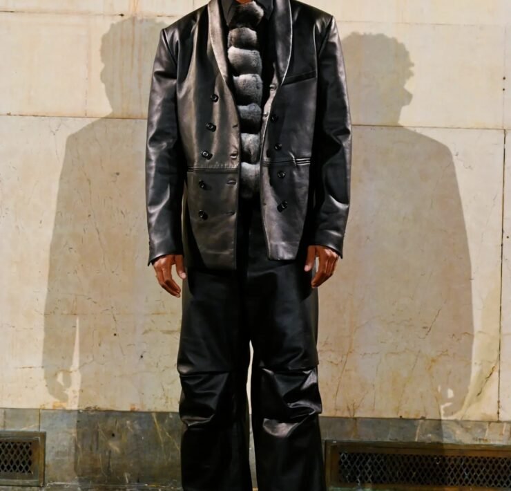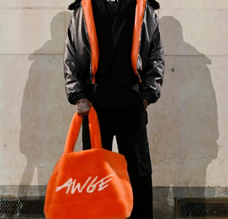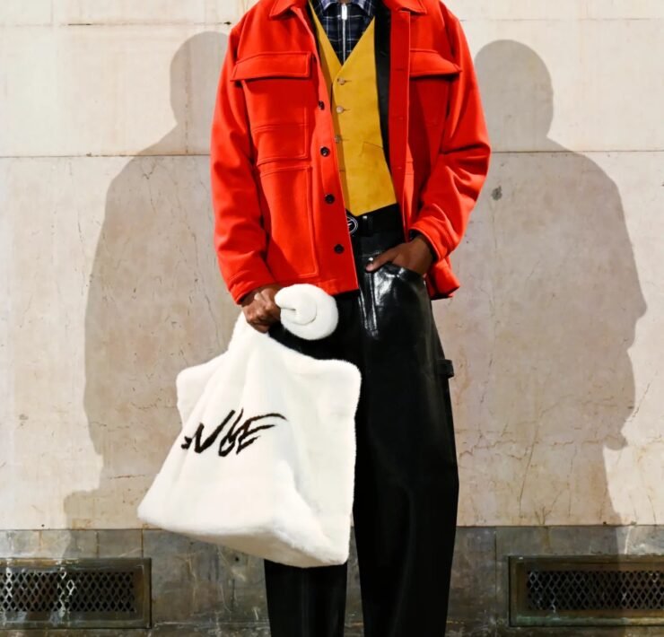 Accessories carried much of the collection’s conceptual weight. Oversized, deliberately impractical bags framed fashion as attitude over function. Fur baby pouches and a large leather baby carriage extended that idea further, with Rocky using fatherhood as a styling statement — putting men visibly and stylishly in caregiving roles. “I just wanted to put it under a different scope and show urban people doing it, swagging it up,” he said.