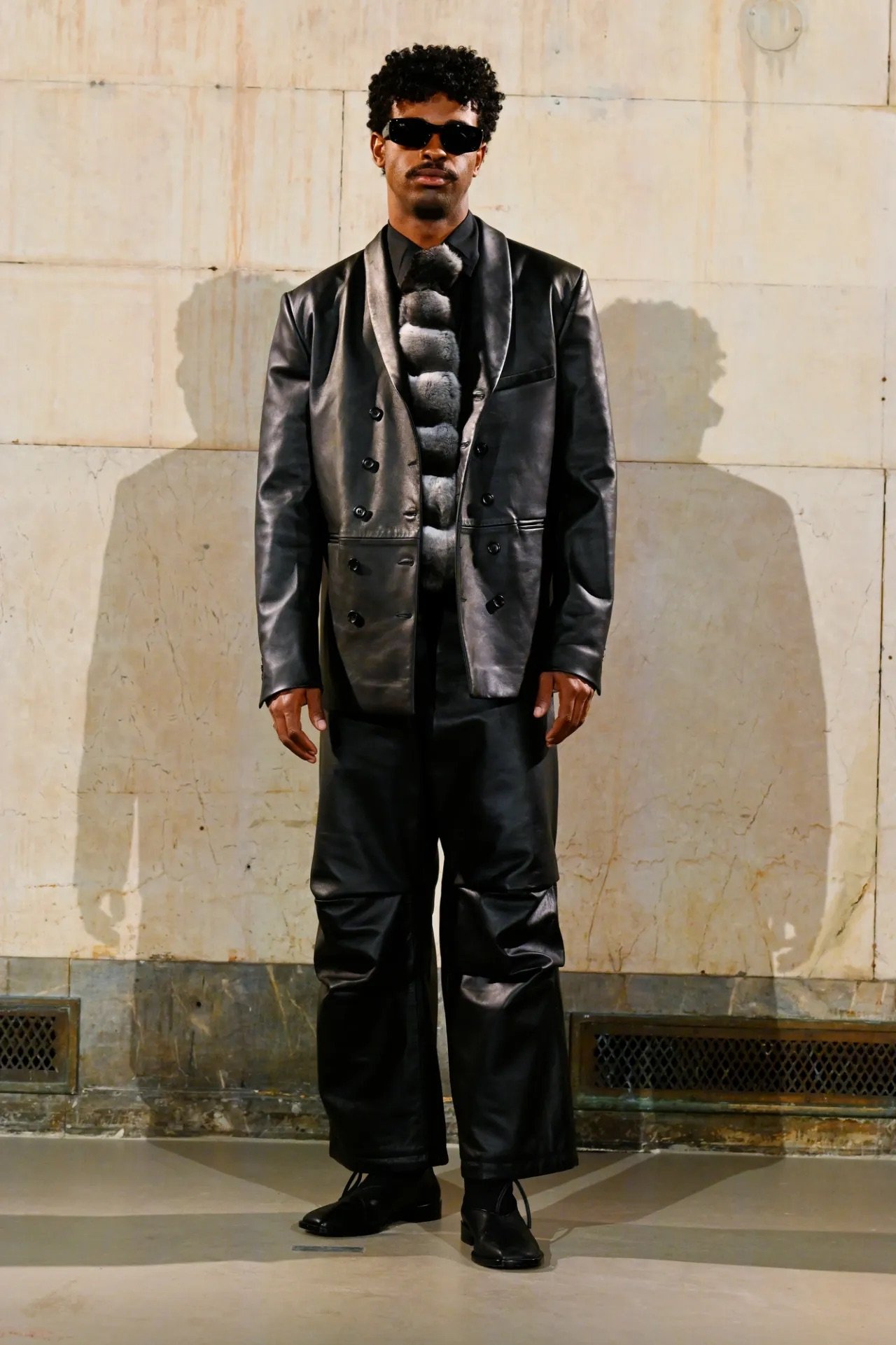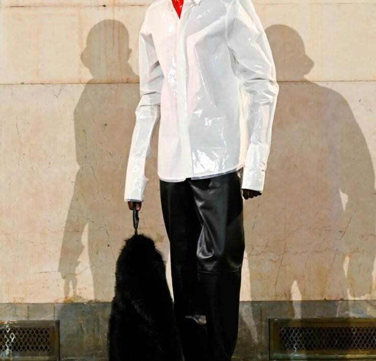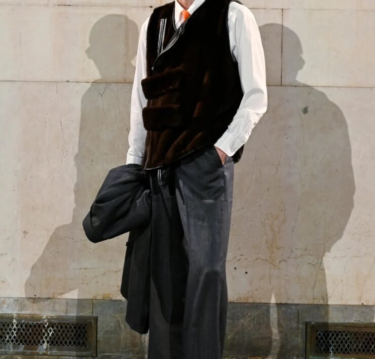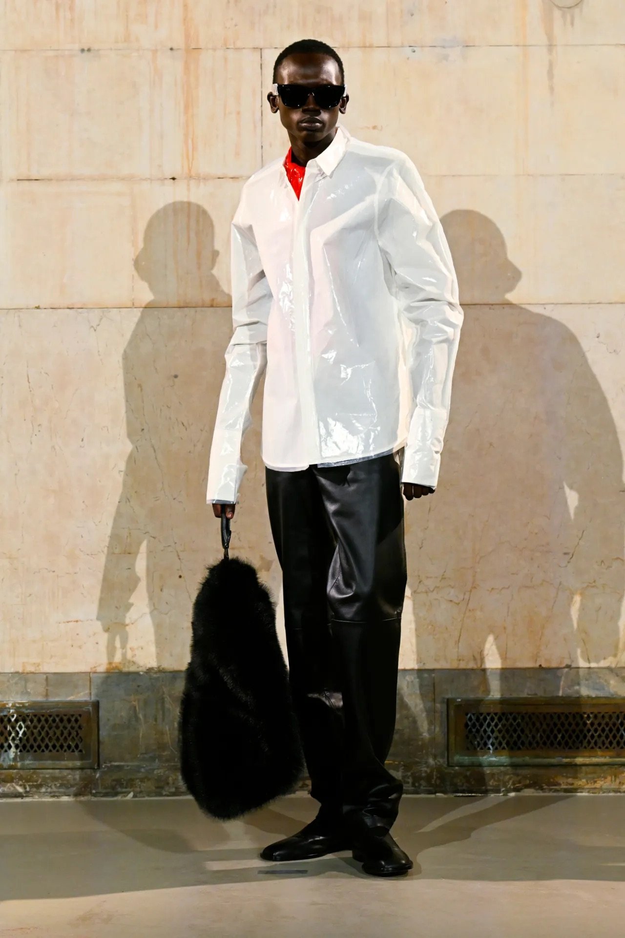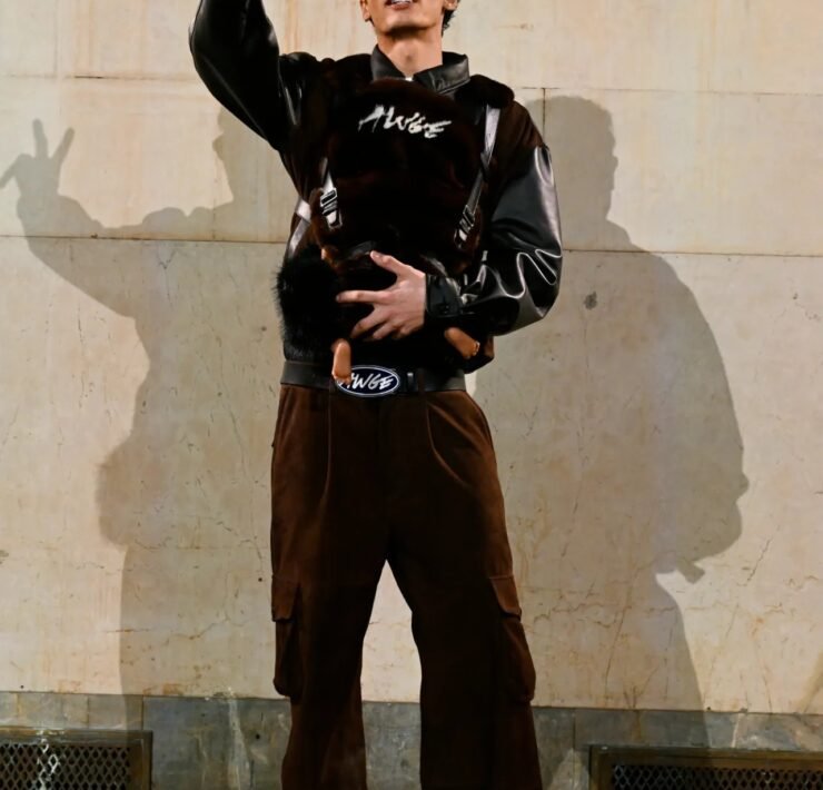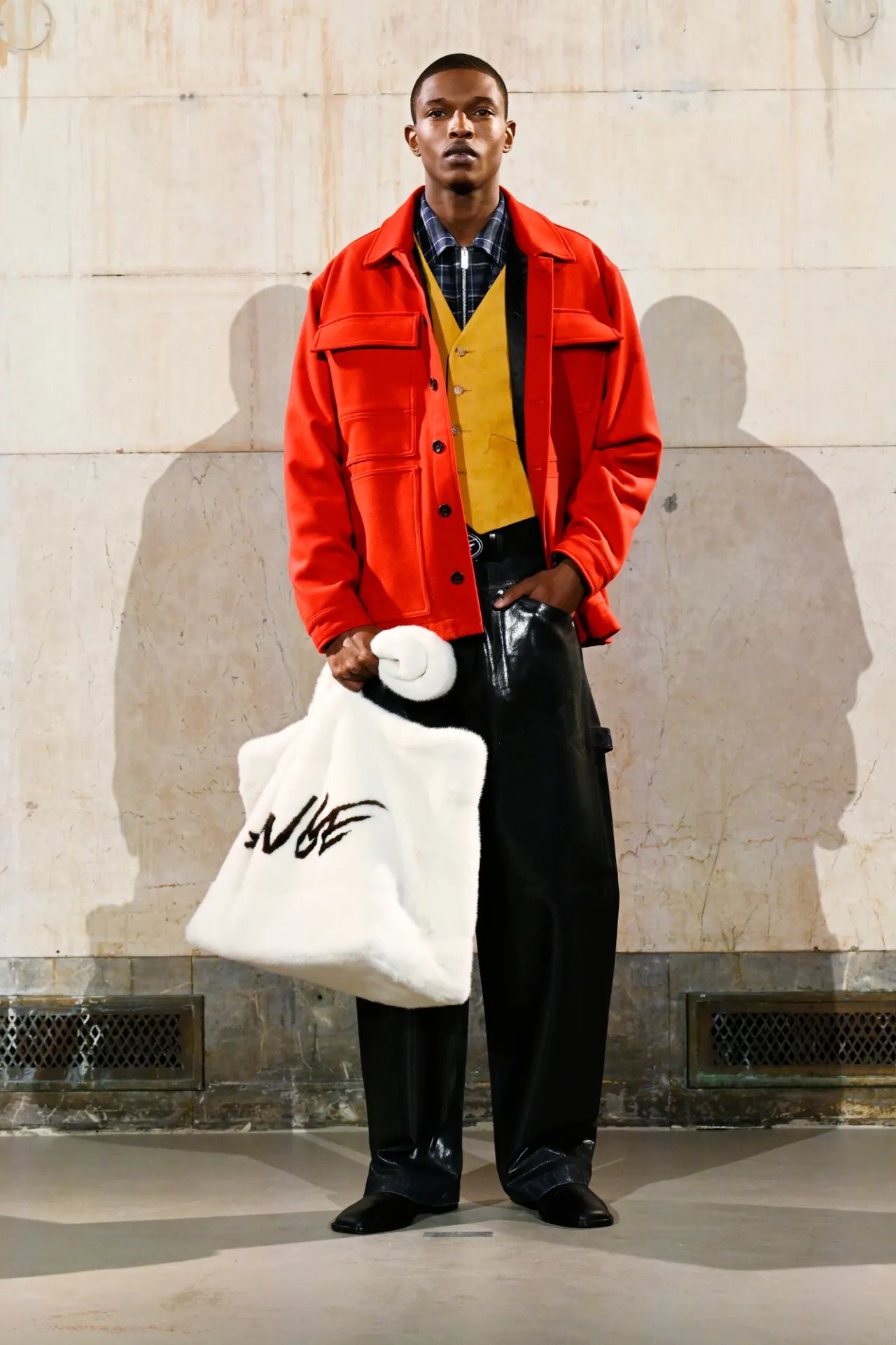 Accessories carried much of the collection’s conceptual weight. Oversized, deliberately impractical bags framed fashion as attitude over function. Fur baby pouches and a large leather baby carriage extended that idea further, with Rocky using fatherhood as a styling statement — putting men visibly and stylishly in caregiving roles. “I just wanted to put it under a different scope and show urban people doing it, swagging it up,” he said.