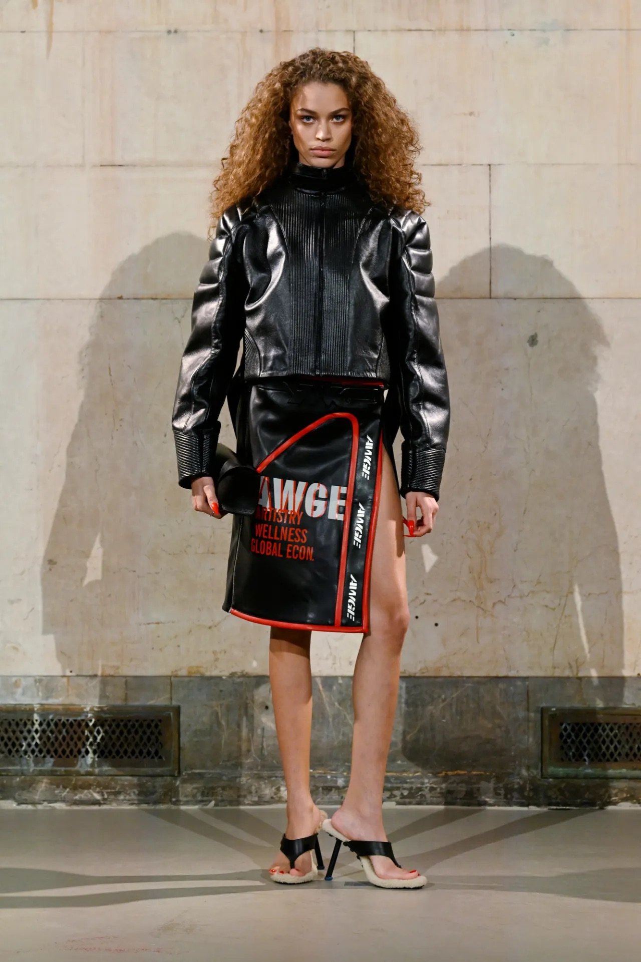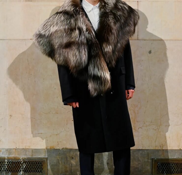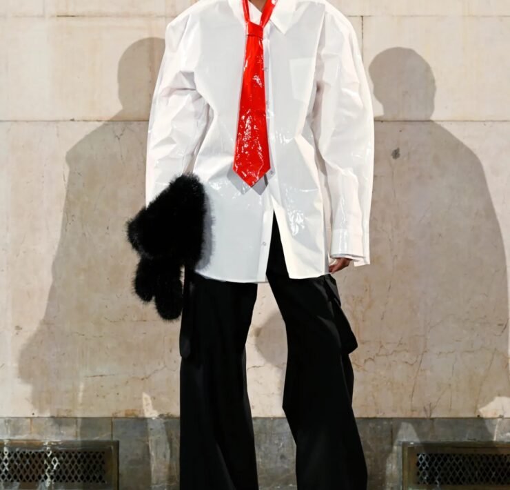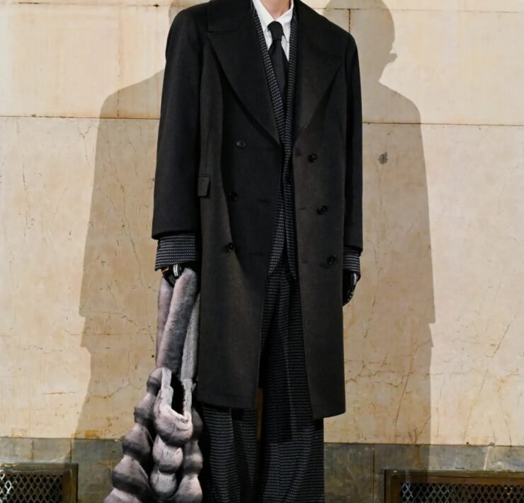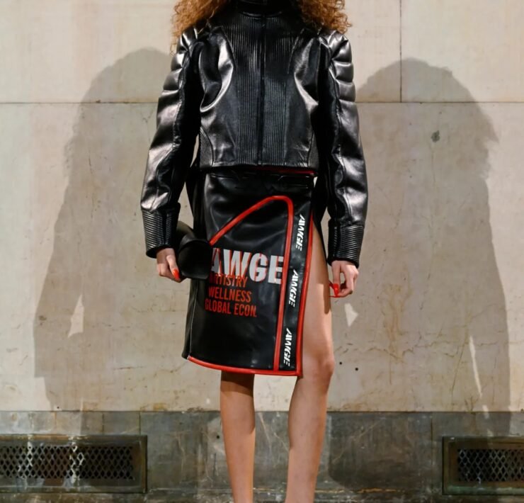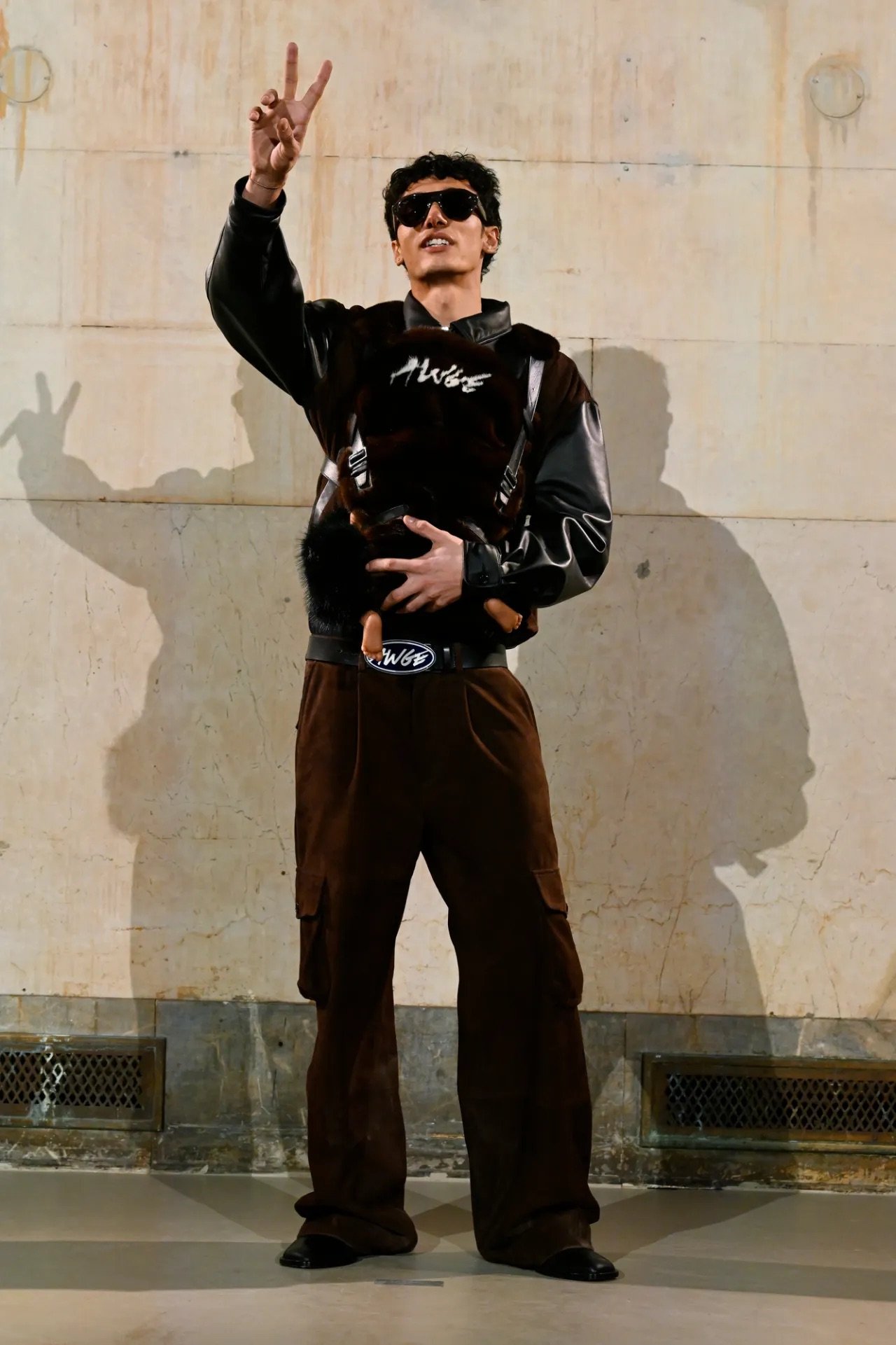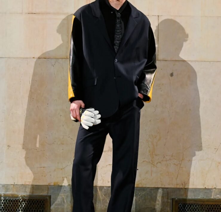 Accessories carried much of the collection’s conceptual weight. Oversized, deliberately impractical bags framed fashion as attitude over function. Fur baby pouches and a large leather baby carriage extended that idea further, with Rocky using fatherhood as a styling statement — putting men visibly and stylishly in caregiving roles. “I just wanted to put it under a different scope and show urban people doing it, swagging it up,” he said.