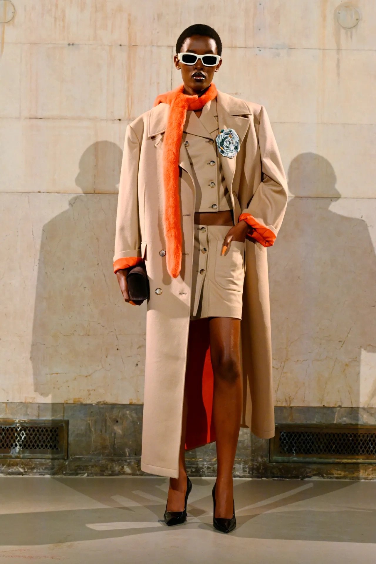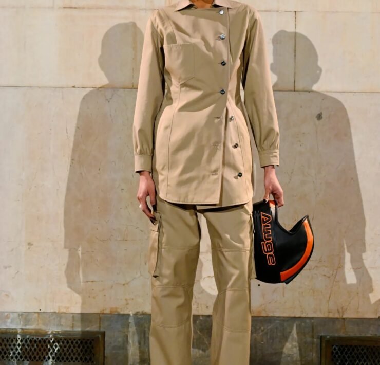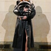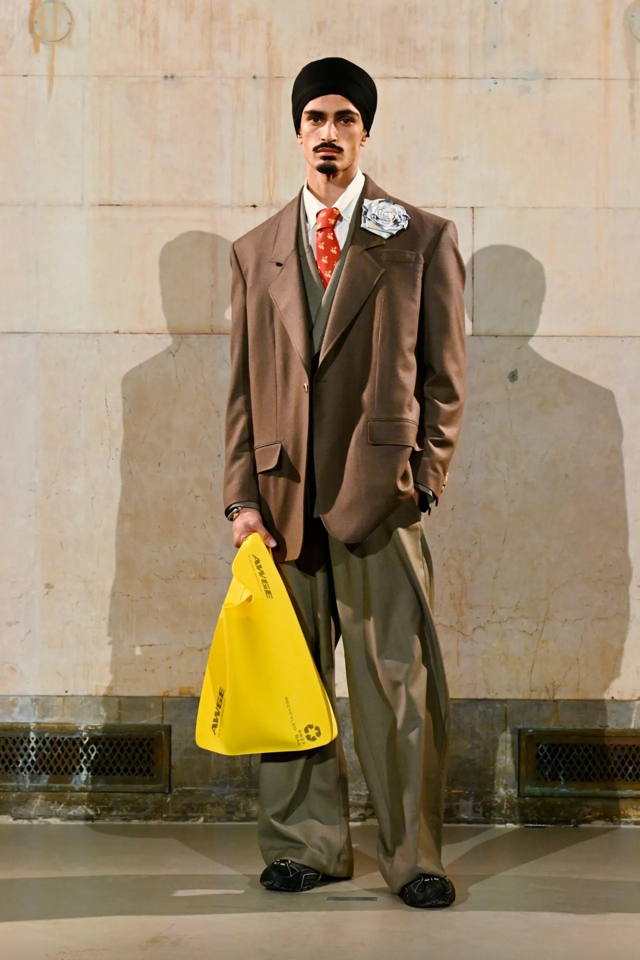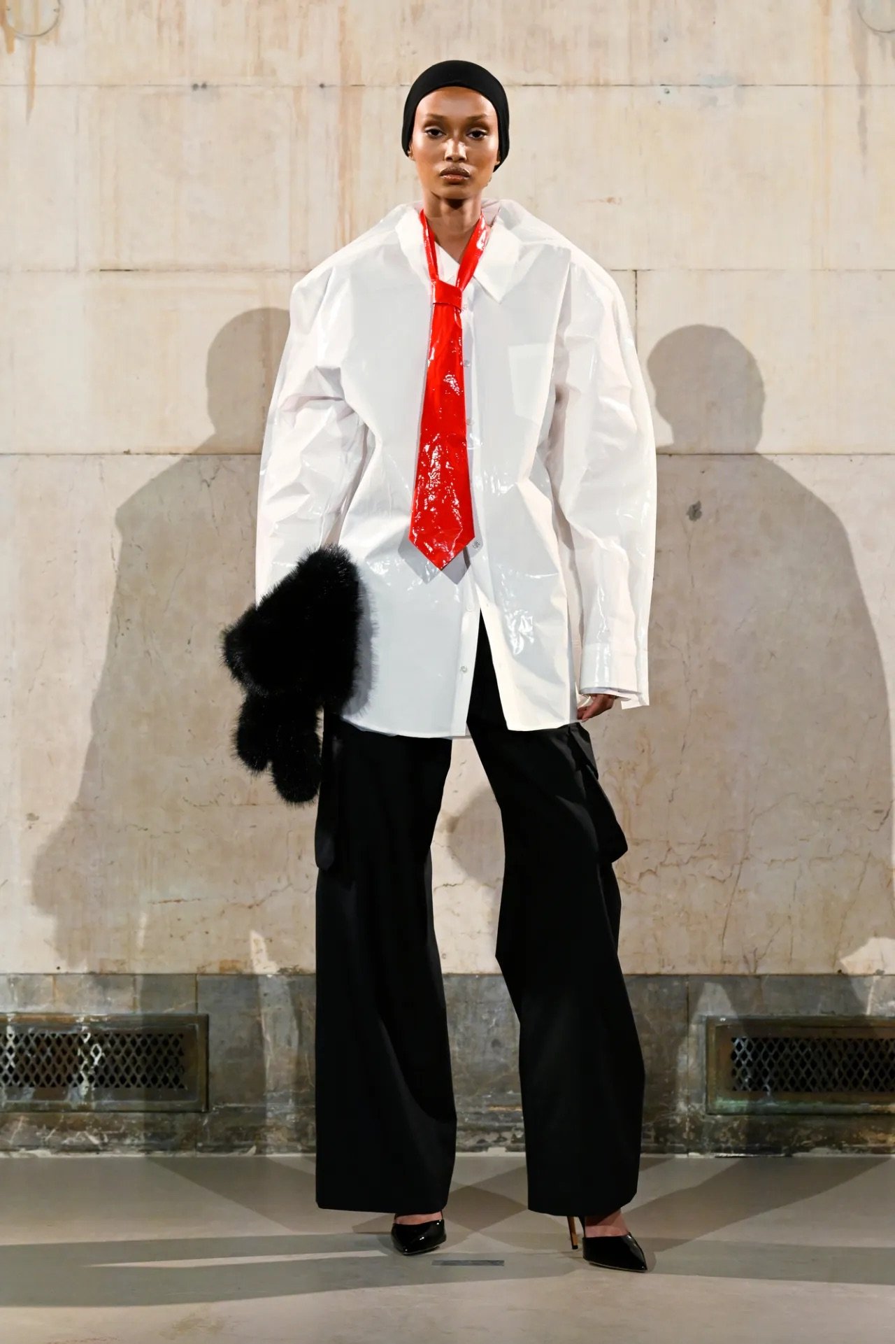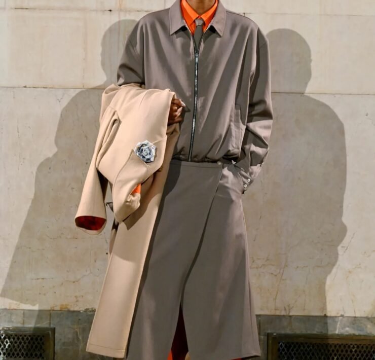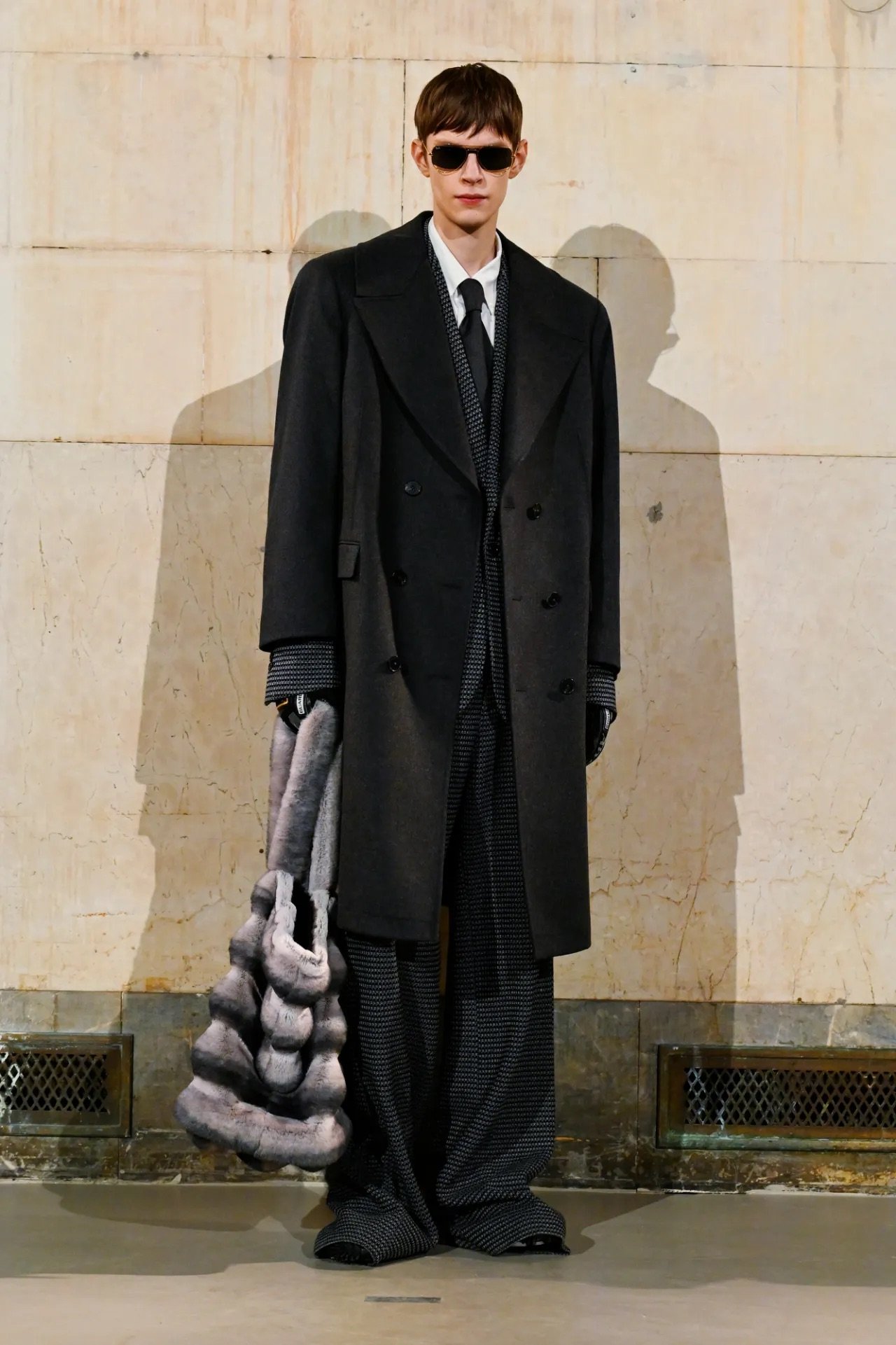 Accessories carried much of the collection’s conceptual weight. Oversized, deliberately impractical bags framed fashion as attitude over function. Fur baby pouches and a large leather baby carriage extended that idea further, with Rocky using fatherhood as a styling statement — putting men visibly and stylishly in caregiving roles. “I just wanted to put it under a different scope and show urban people doing it, swagging it up,” he said.