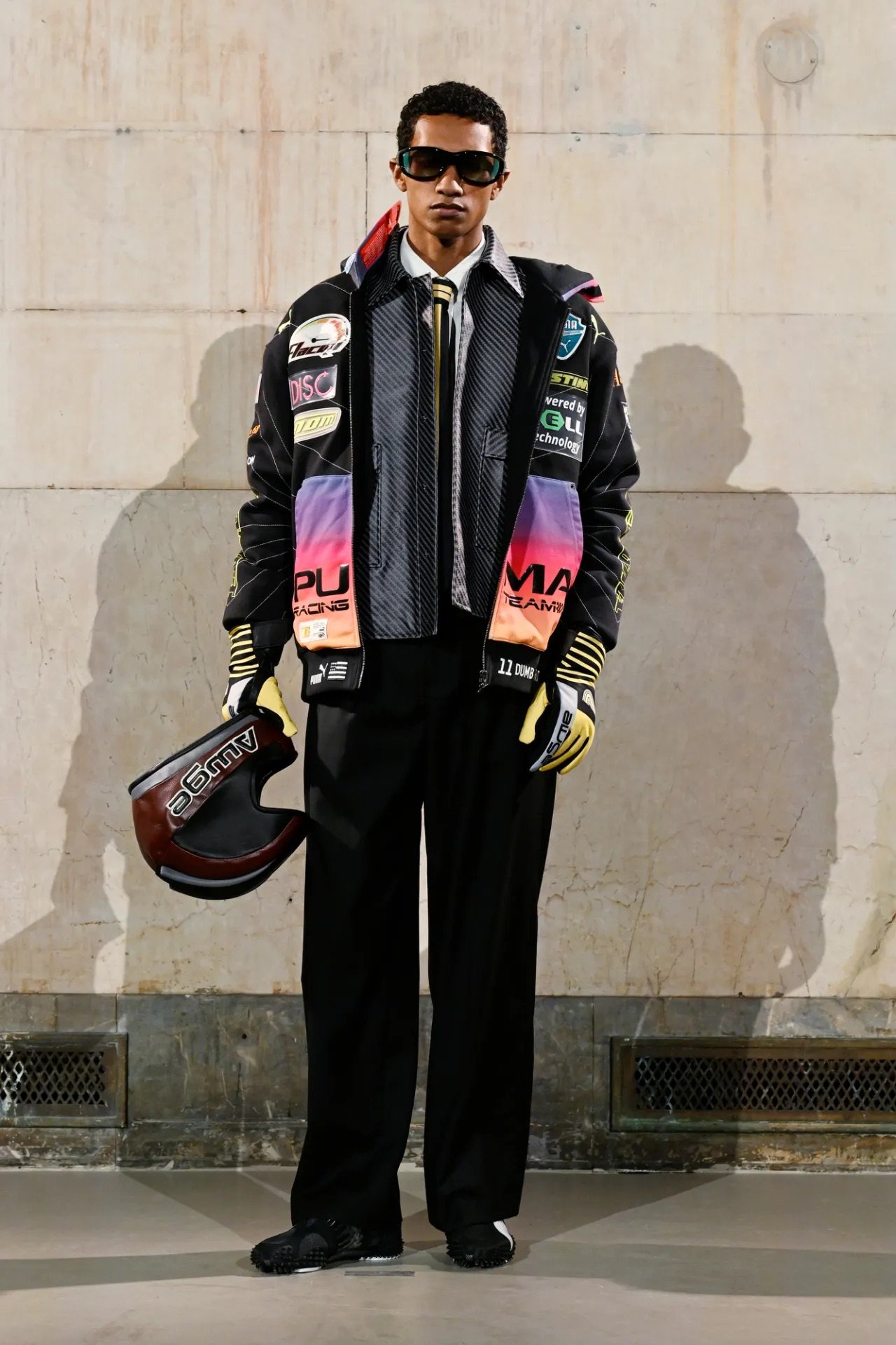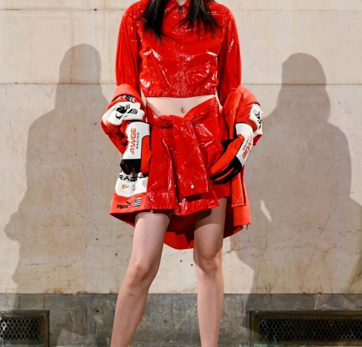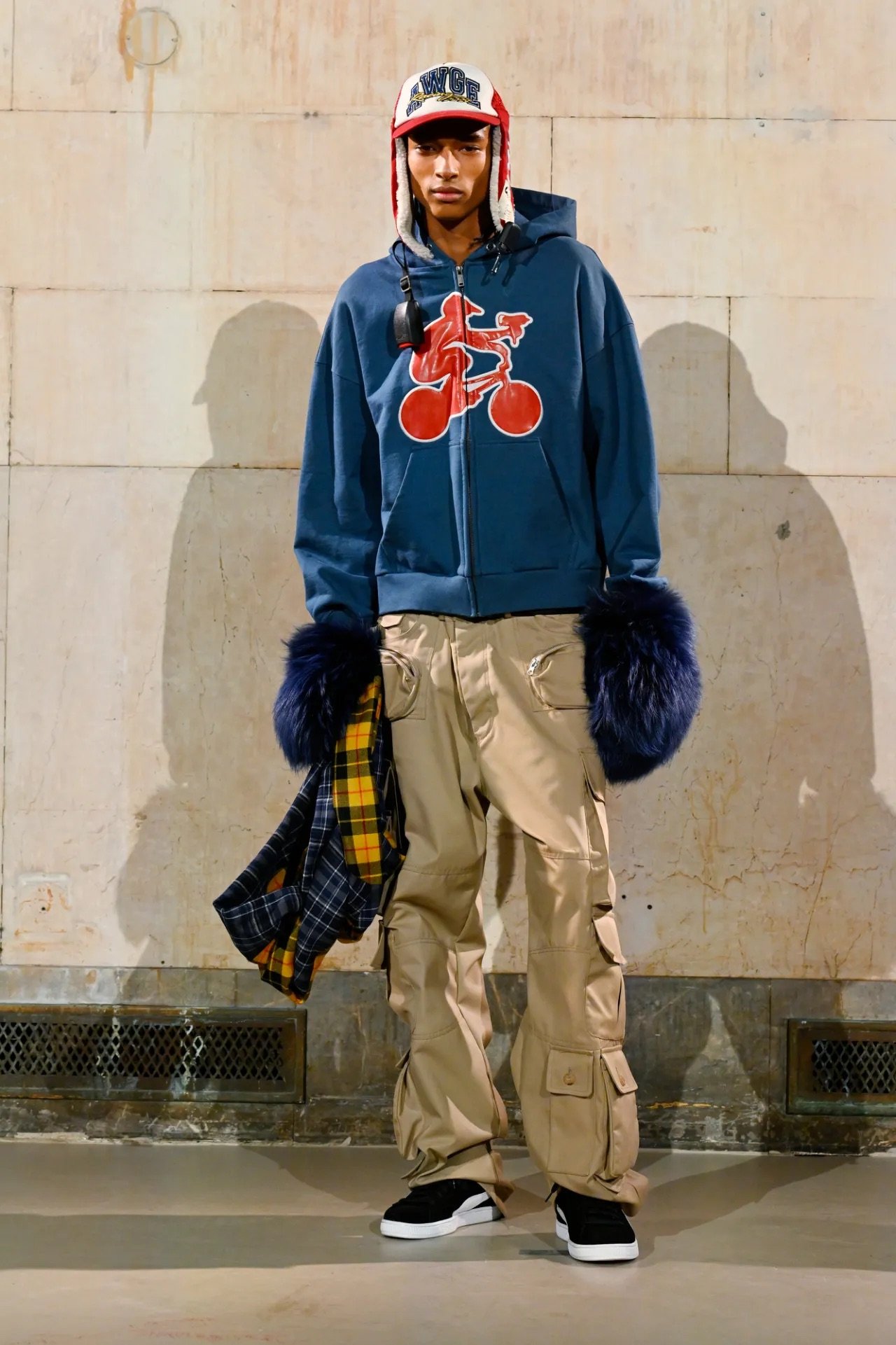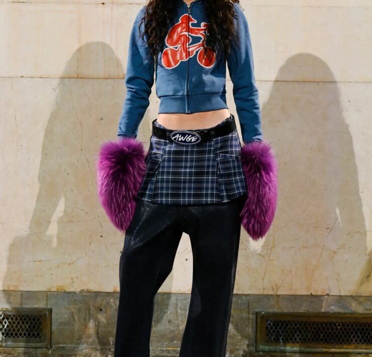 The showing spanned both menswear and womenswear, moving fluidly between sharp tailoring, preppy classics, workwear, and sportswear, often blending all of them at once in a way that felt characteristically Rocky — controlled but with an edge of disorder. Plaid appeared throughout, at times evoking a ’90s schoolgirl neatness before being disrupted by fur trims, exaggerated silhouettes, or clashing fabrics. Some tailoring had a latex-slick, confrontational quality, while other pieces leaned into oversized workwear shapes. Sporty elements were woven throughout, including leather racing coats and cropped jerseys developed with Puma, and eyewear from Ray-Ban, where Rocky serves as creative director.