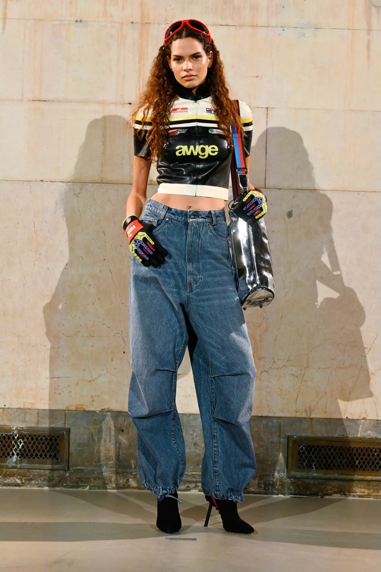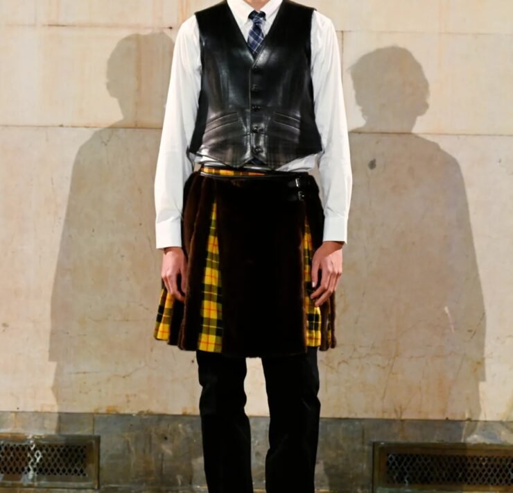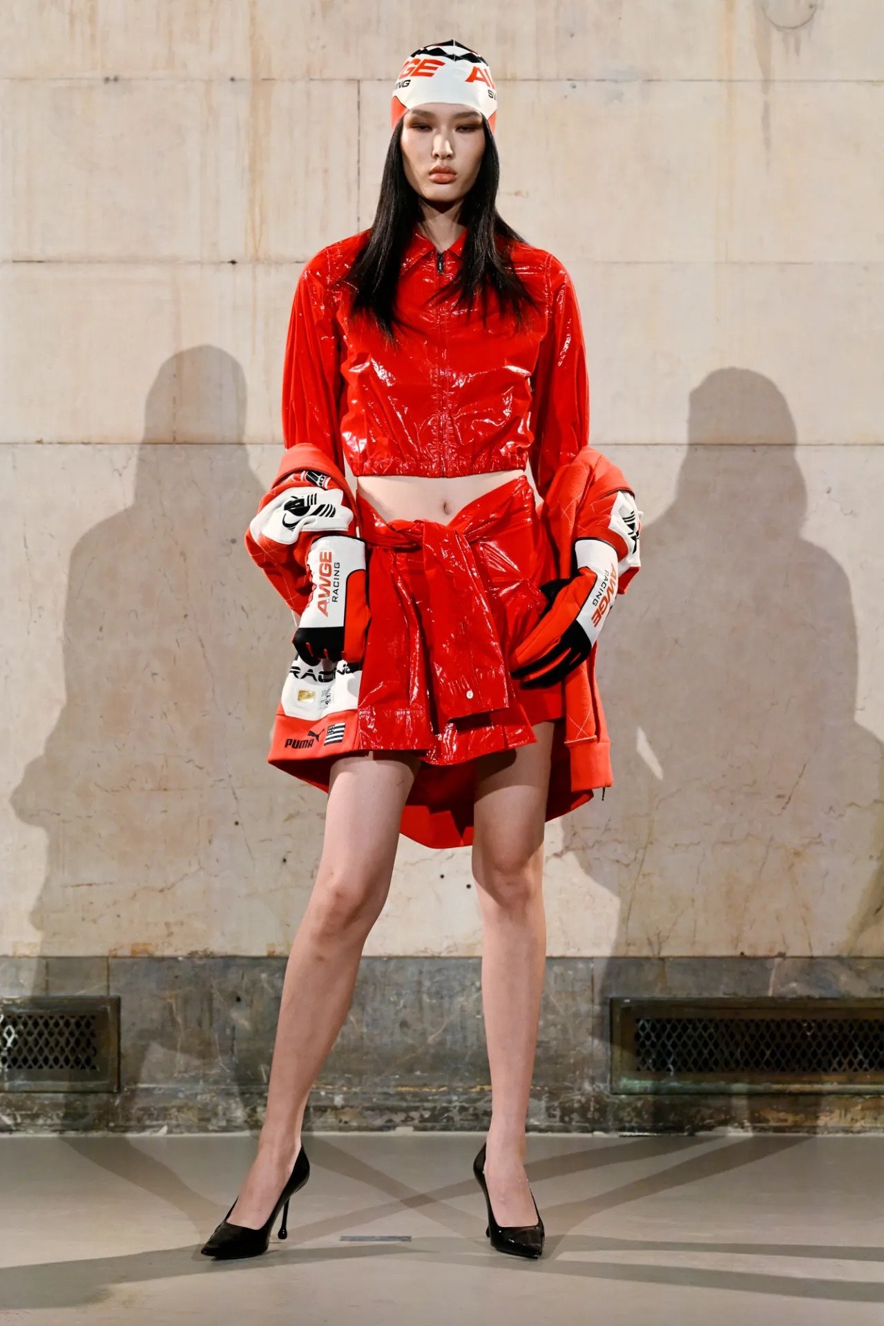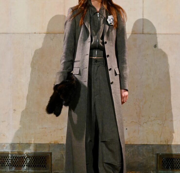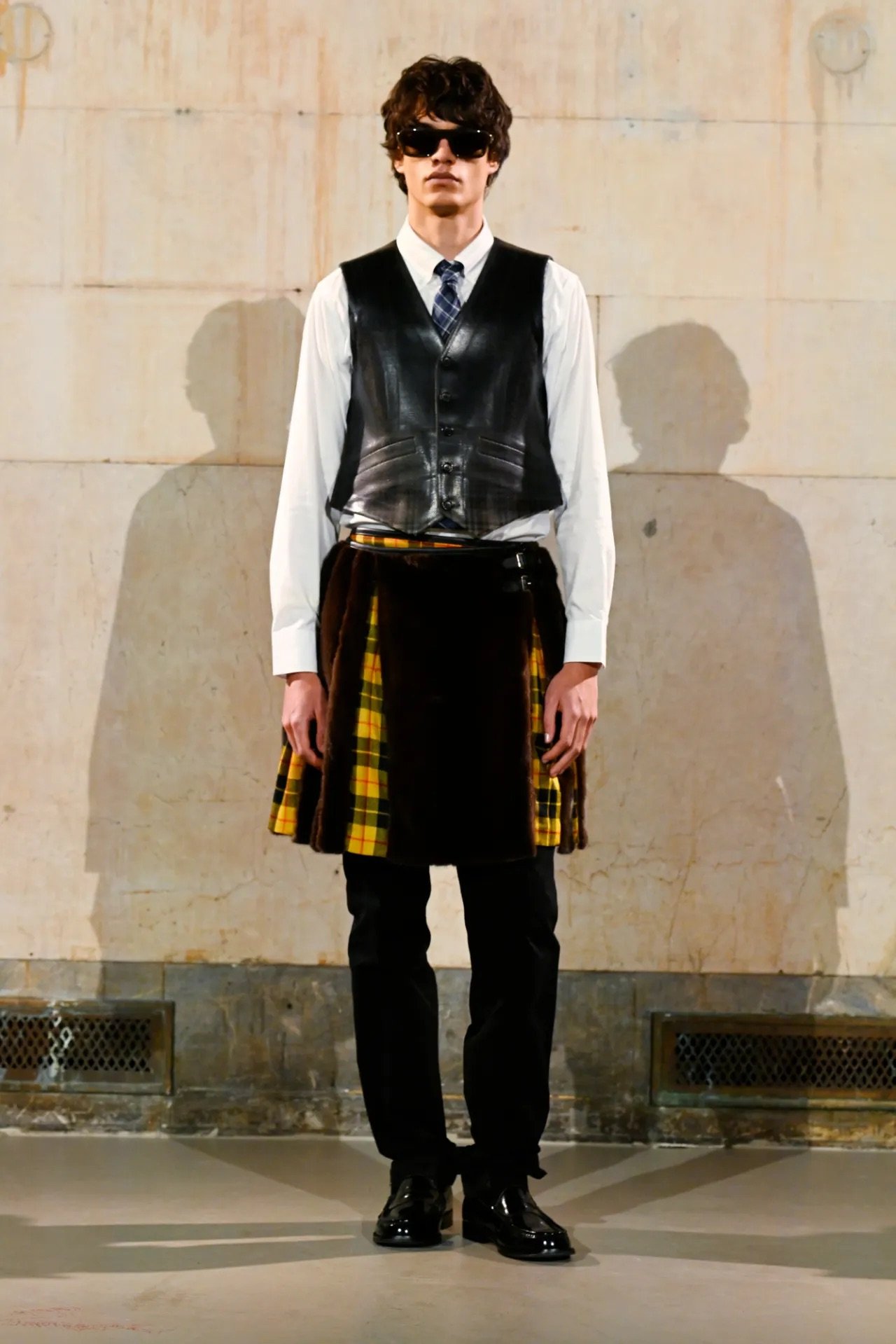 The showing spanned both menswear and womenswear, moving fluidly between sharp tailoring, preppy classics, workwear, and sportswear, often blending all of them at once in a way that felt characteristically Rocky — controlled but with an edge of disorder. Plaid appeared throughout, at times evoking a ’90s schoolgirl neatness before being disrupted by fur trims, exaggerated silhouettes, or clashing fabrics. Some tailoring had a latex-slick, confrontational quality, while other pieces leaned into oversized workwear shapes. Sporty elements were woven throughout, including leather racing coats and cropped jerseys developed with Puma, and eyewear from Ray-Ban, where Rocky serves as creative director.
