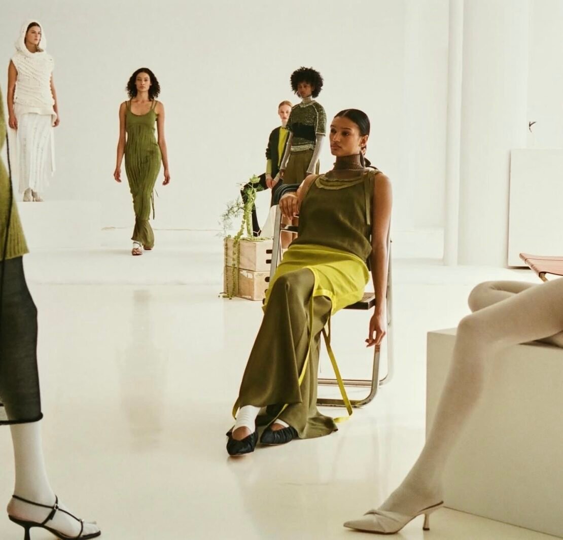 Nature’s influence extended beyond technique into colour. With her studio increasingly resembling a dense, plant-filled environment, Camps translated that immersion into a layered palette of greens, ranging from muted olive to vivid chartreuse and deep fern. The effect was immersive rather than decorative, wrapping the collection in a tonal story that felt grounded and restorative.