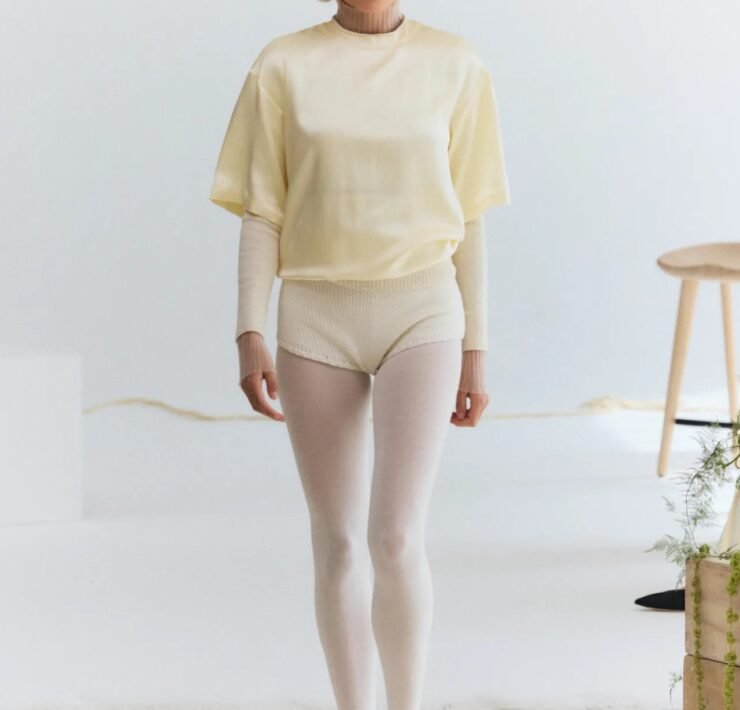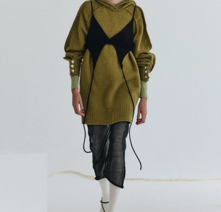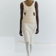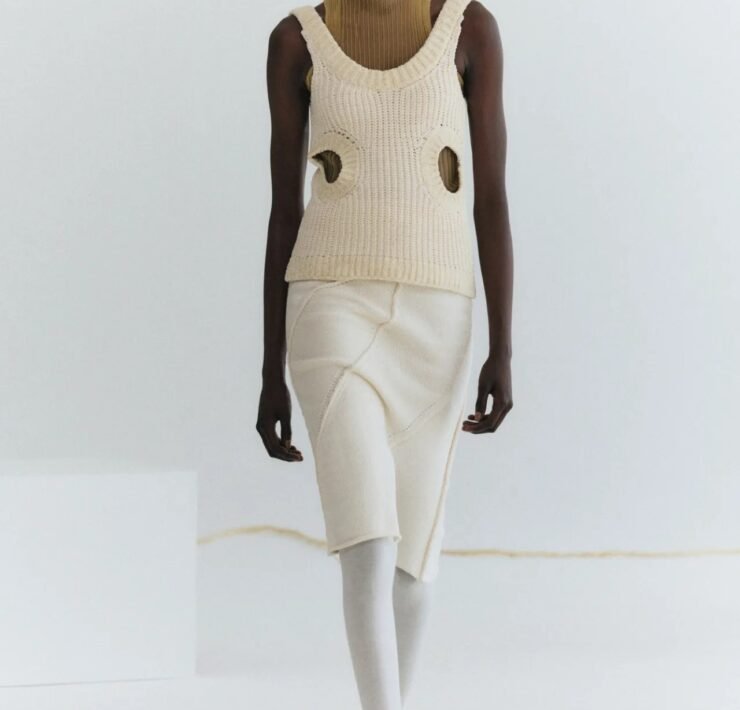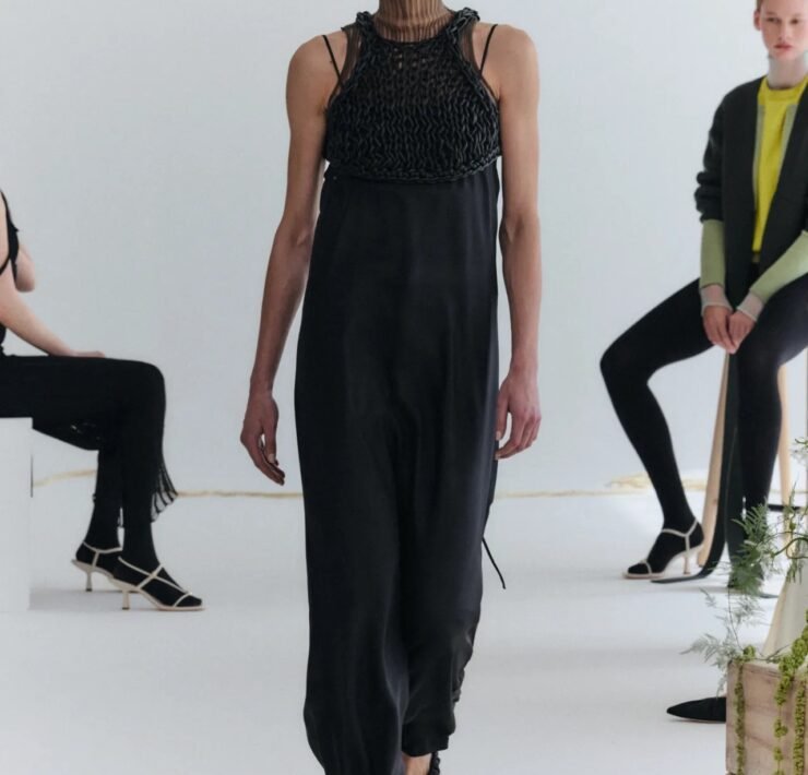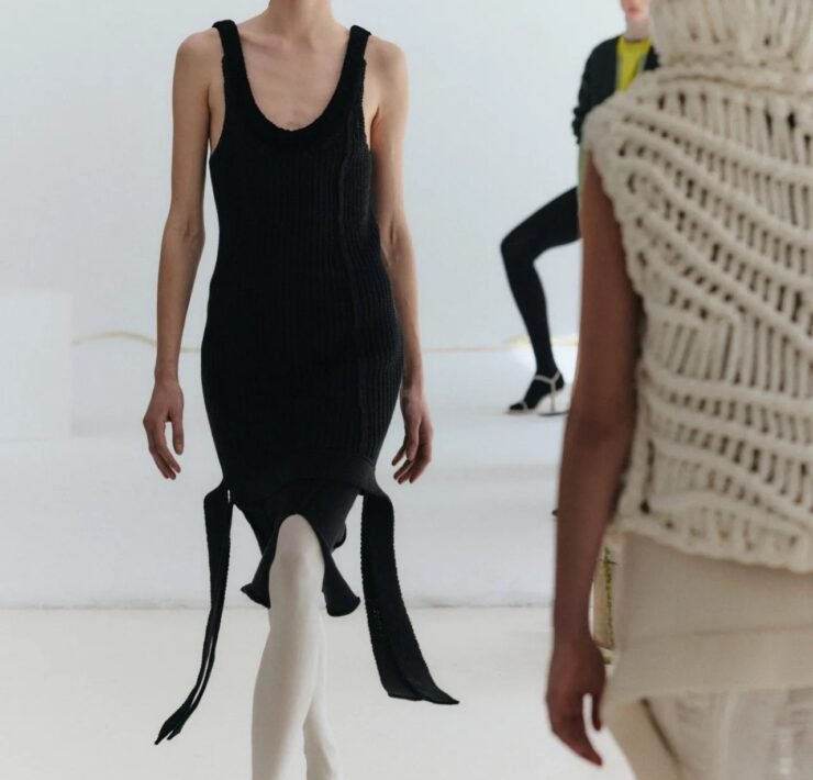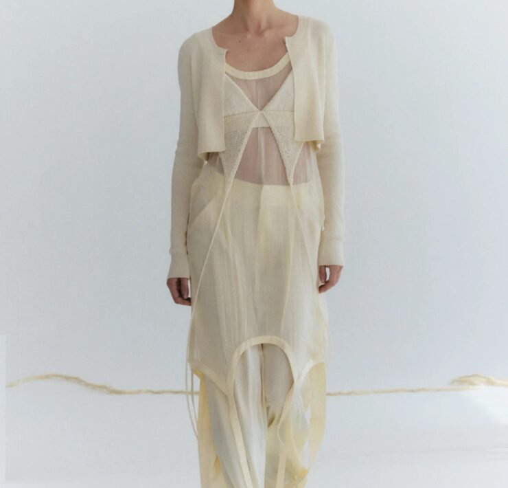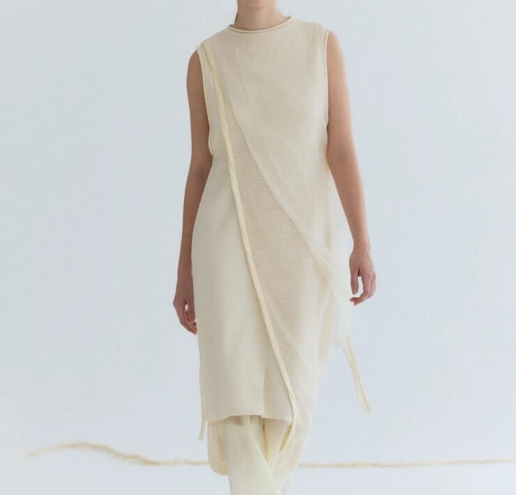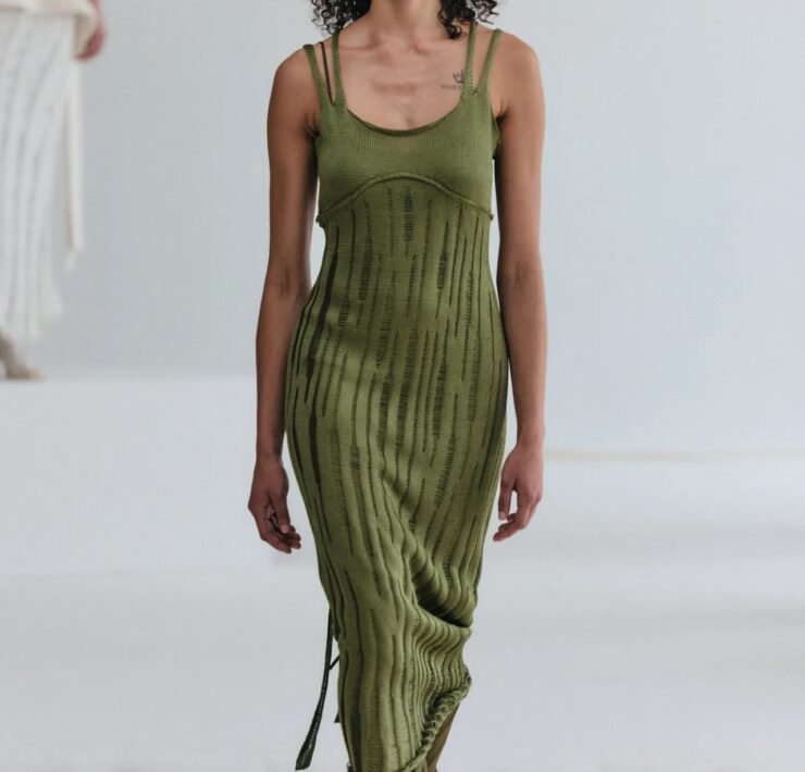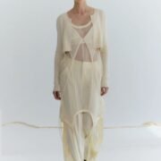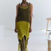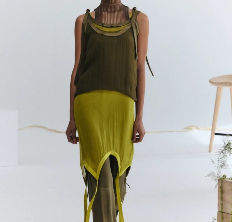 Adaptability played a key role throughout. Streamlined tank dresses and tops were engineered with soft, movable straps that allowed the wearer to shift proportions and styling with minimal effort. In contrast, more experimental pieces — like a heavily textured hooded vest and matching skirt crafted through a shredded bias-weave method — introduced dimension and irregularity, echoing forms found in the natural world.