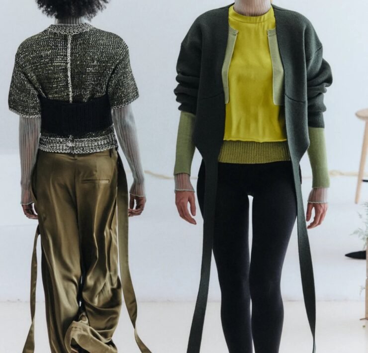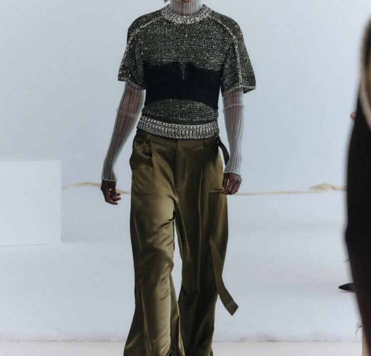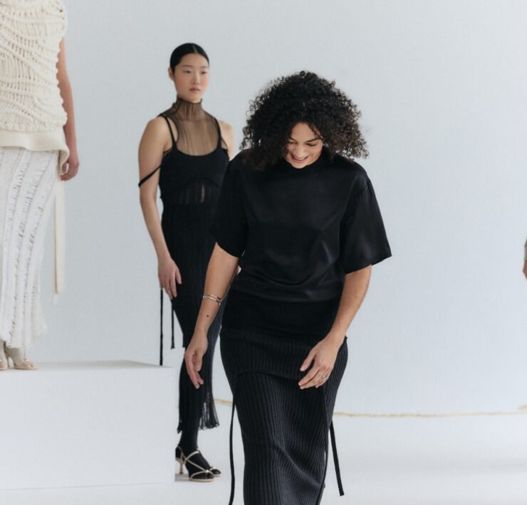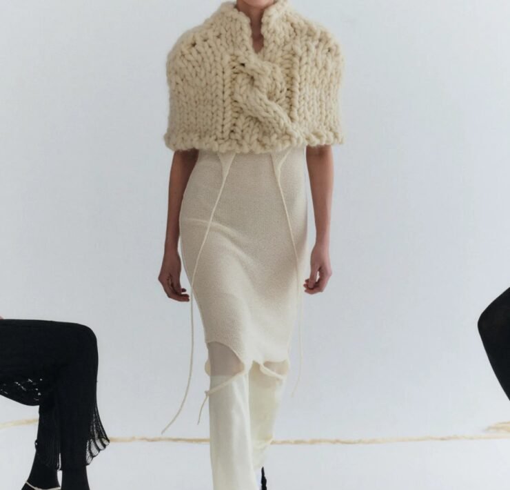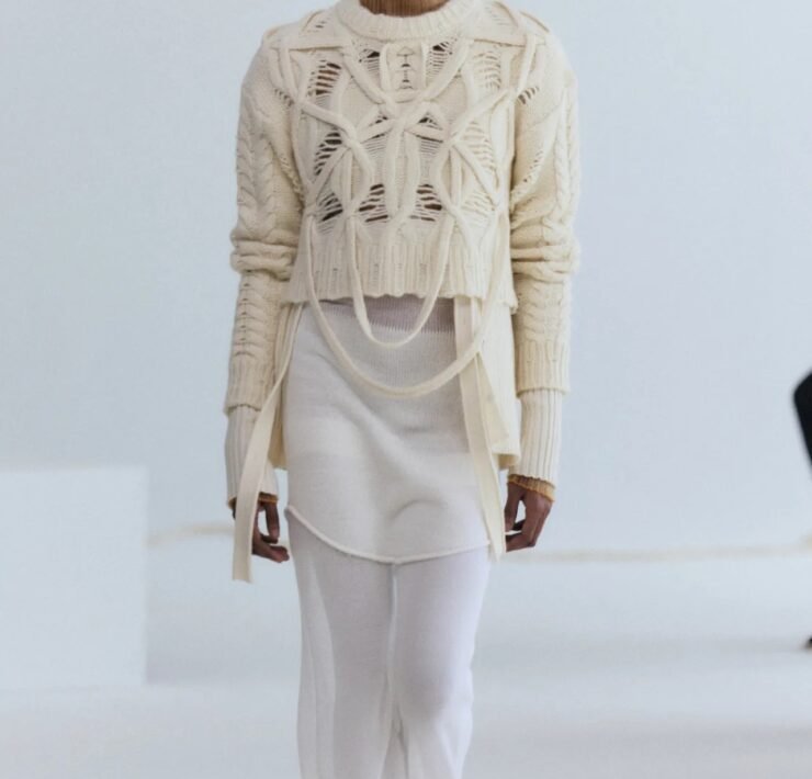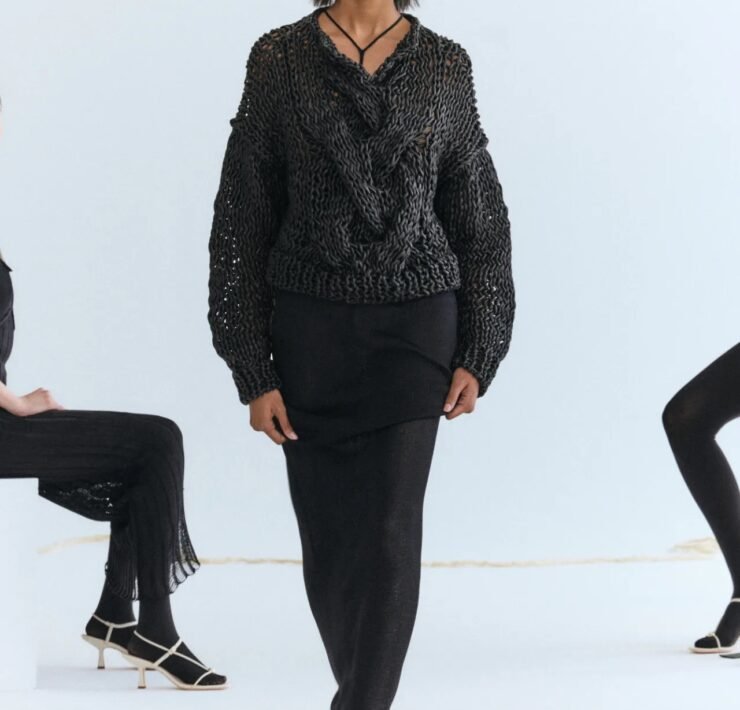 Camps’ work communicated most powerfully through technique. Her knitwear, much of it hand-loomed, explored the tension between precision and ease, merging sculptural construction with a relaxed, wearable sensibility. Subtle nods to her Trinidad roots surfaced in the textures and rhythm of the pieces, lending the collection a personal undercurrent without overt signalling.