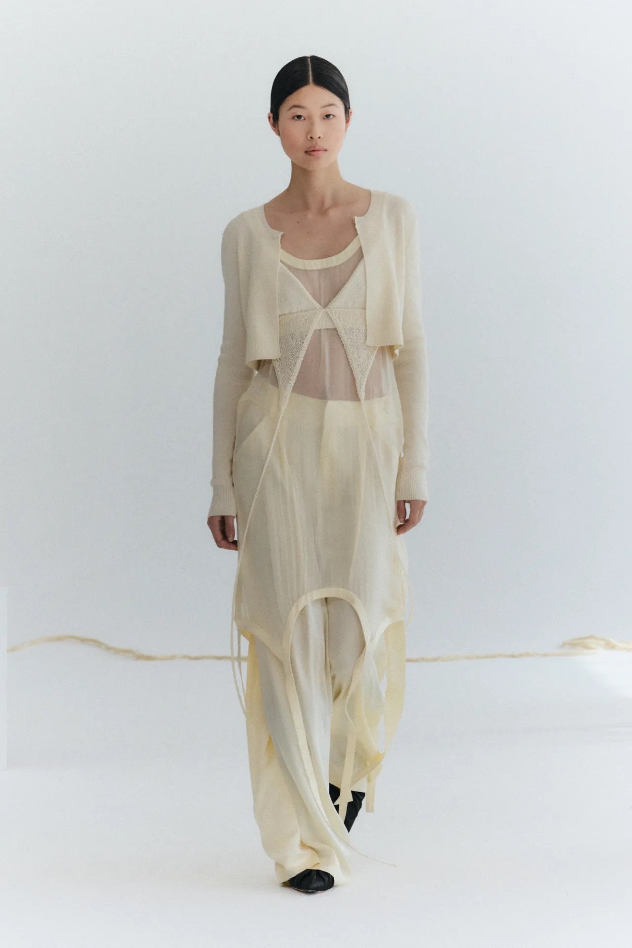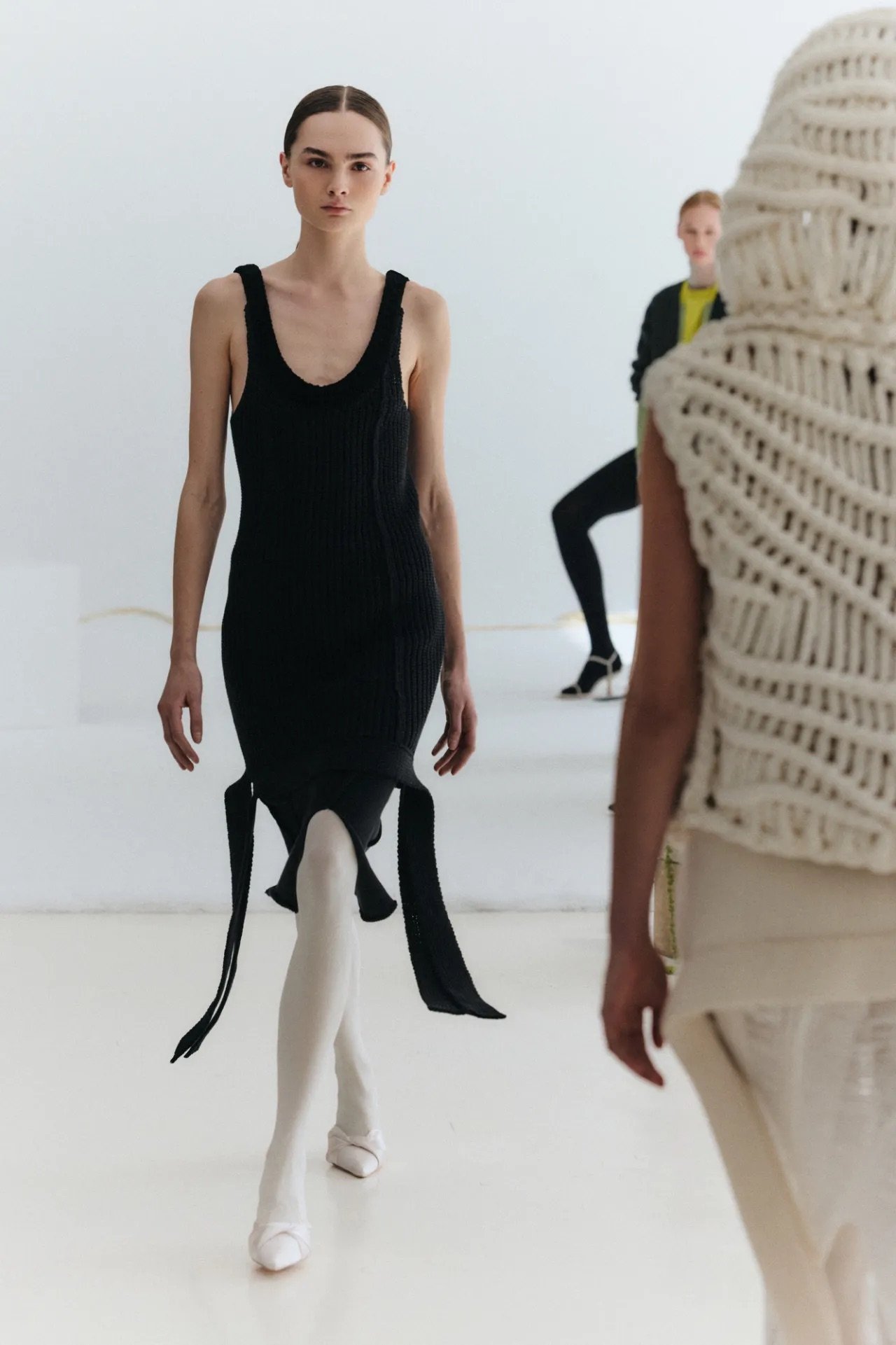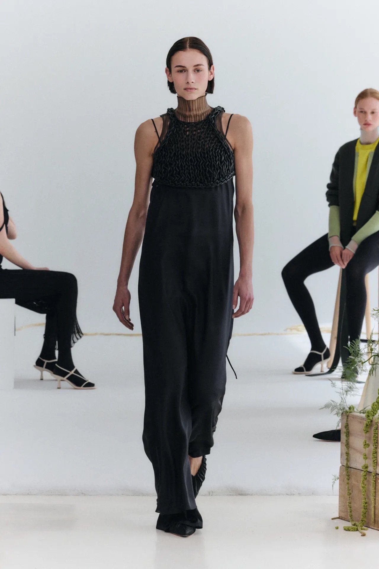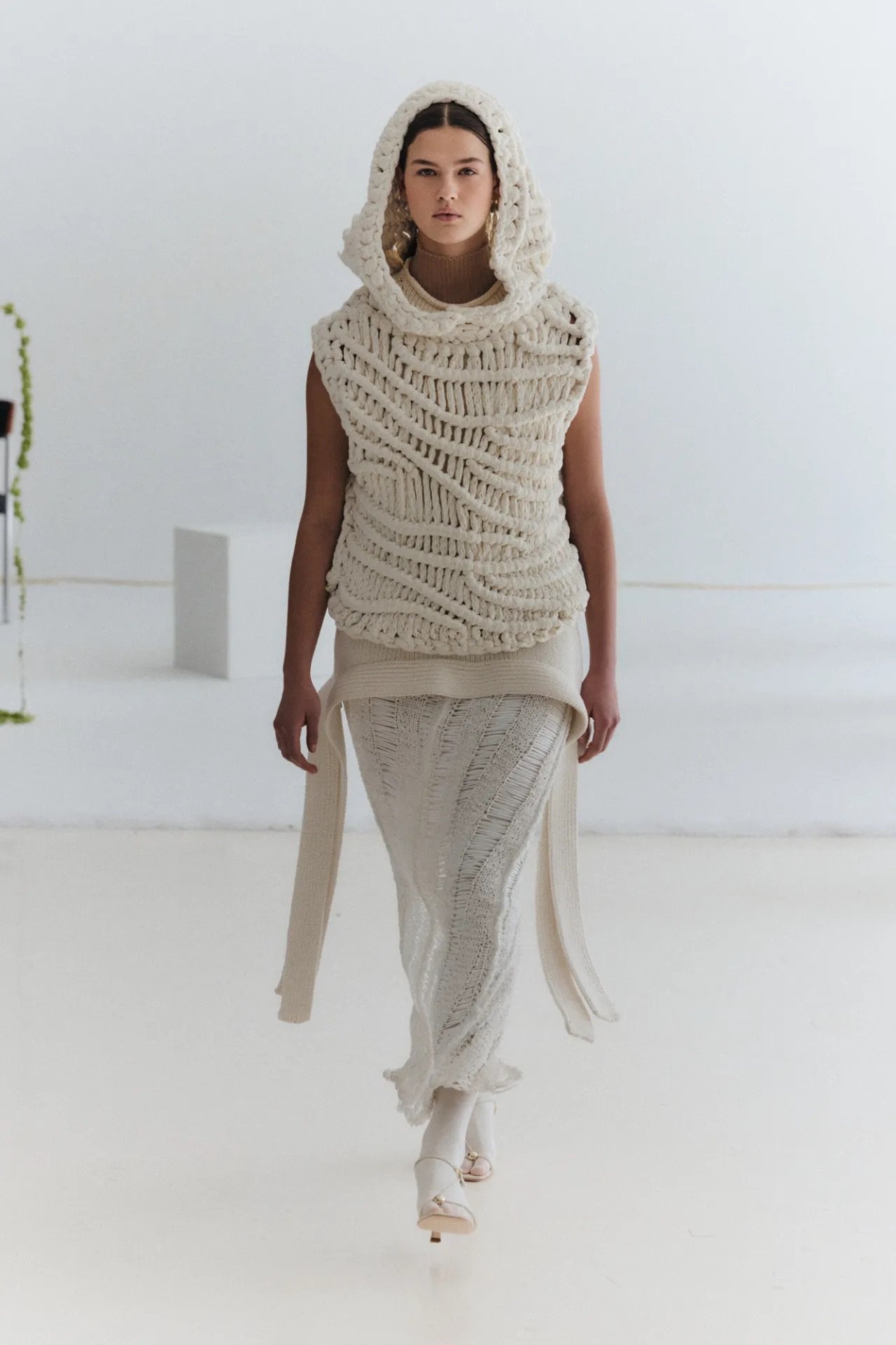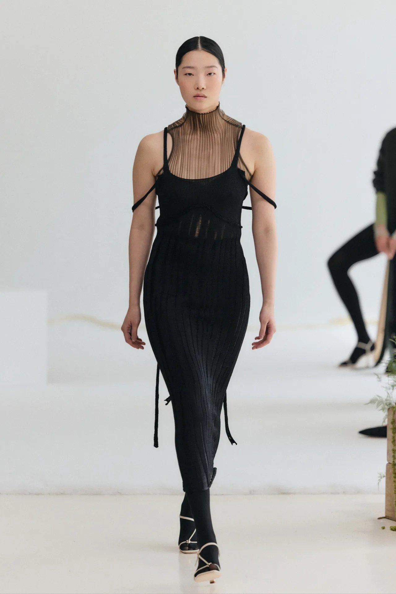 Adaptability played a key role throughout. Streamlined tank dresses and tops were engineered with soft, movable straps that allowed the wearer to shift proportions and styling with minimal effort. In contrast, more experimental pieces — like a heavily textured hooded vest and matching skirt crafted through a shredded bias-weave method — introduced dimension and irregularity, echoing forms found in the natural world.