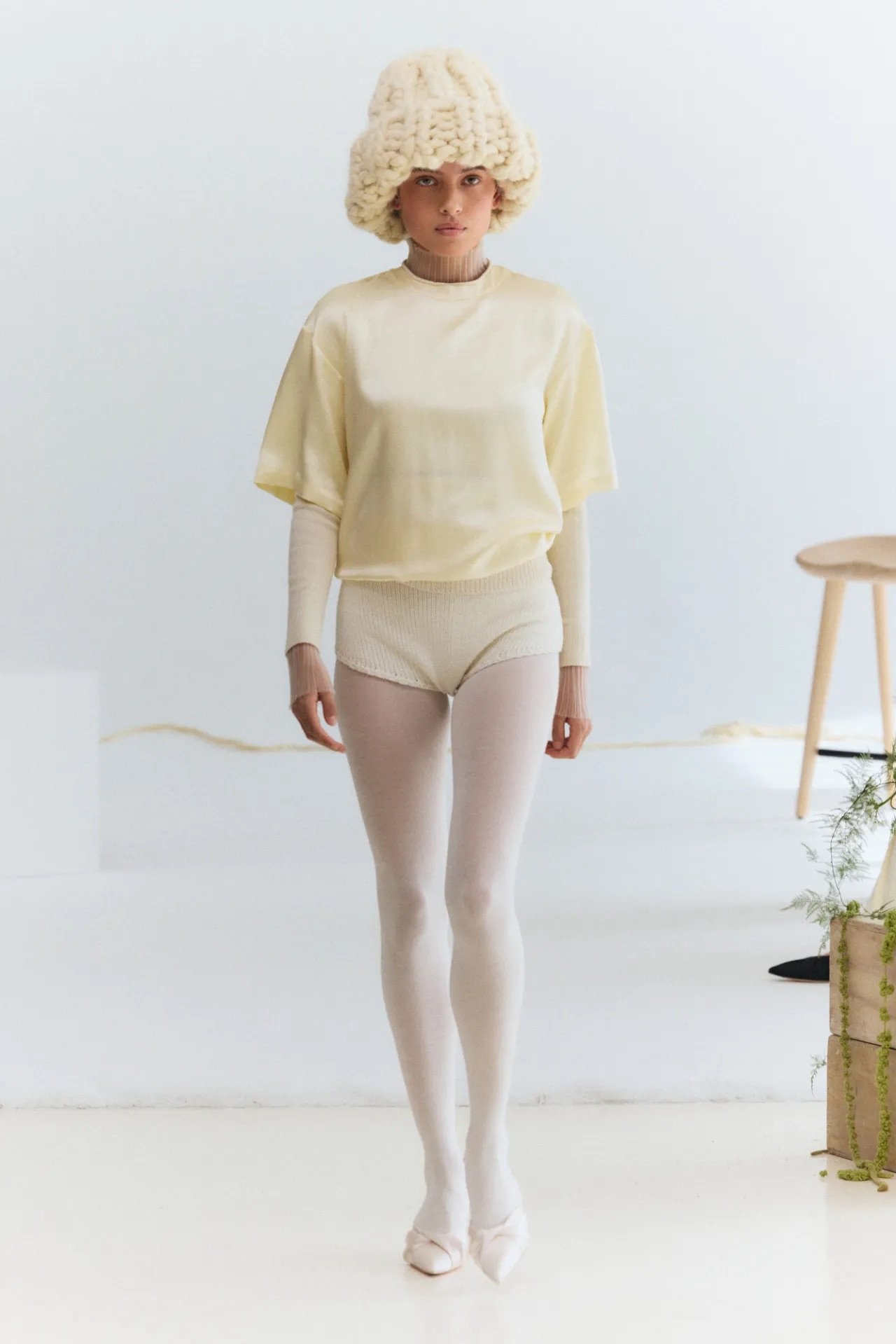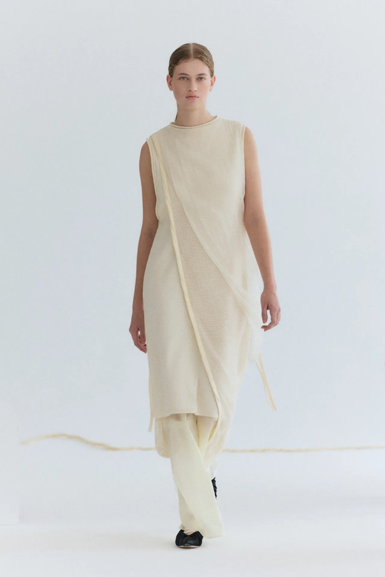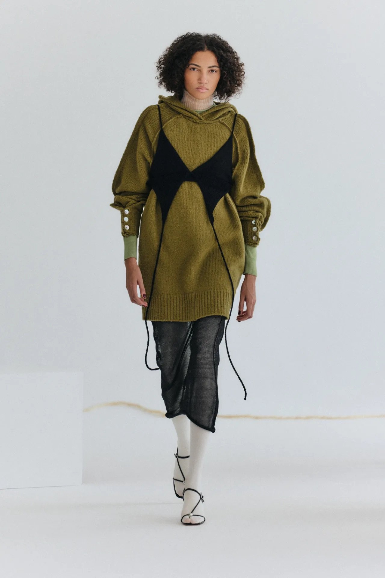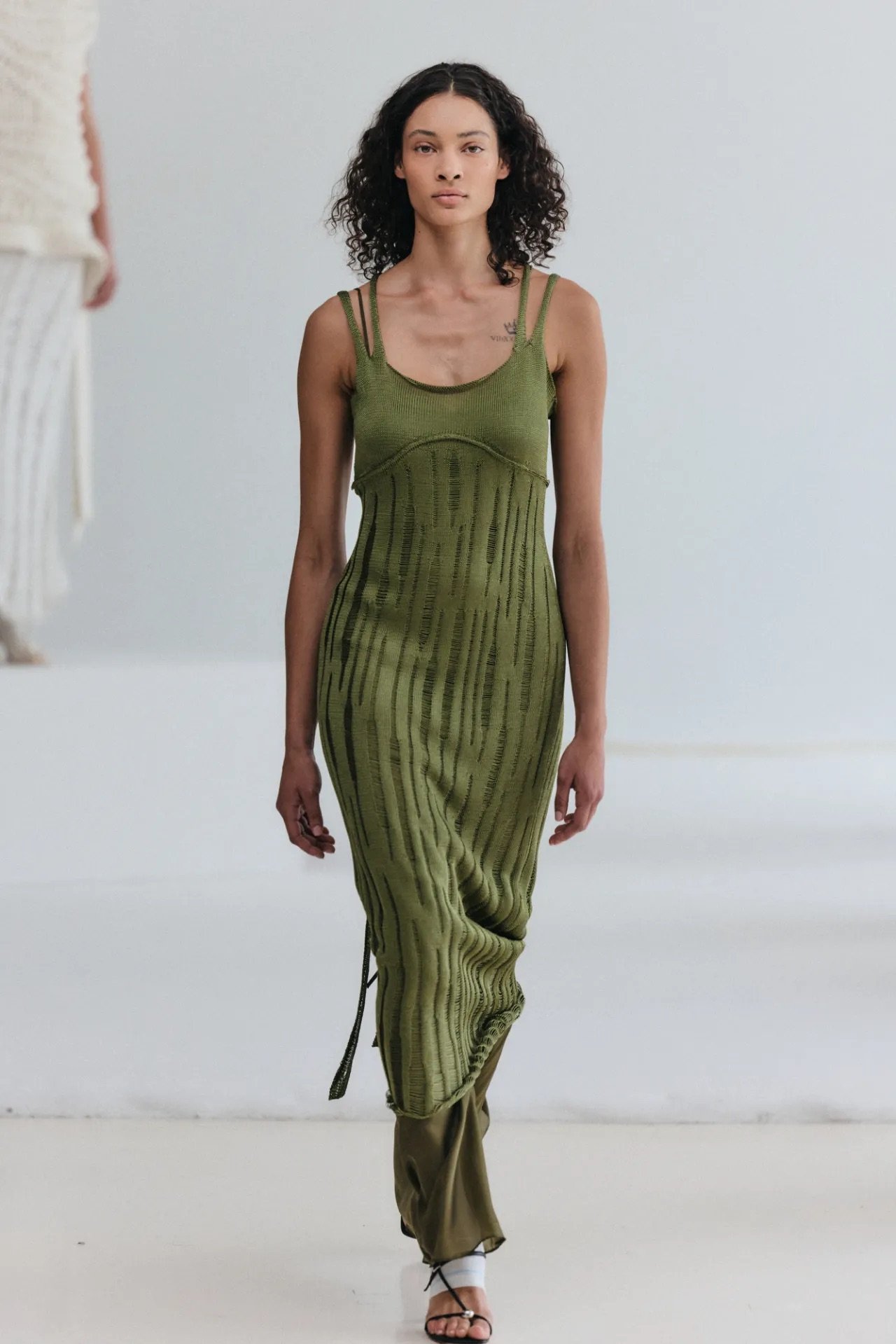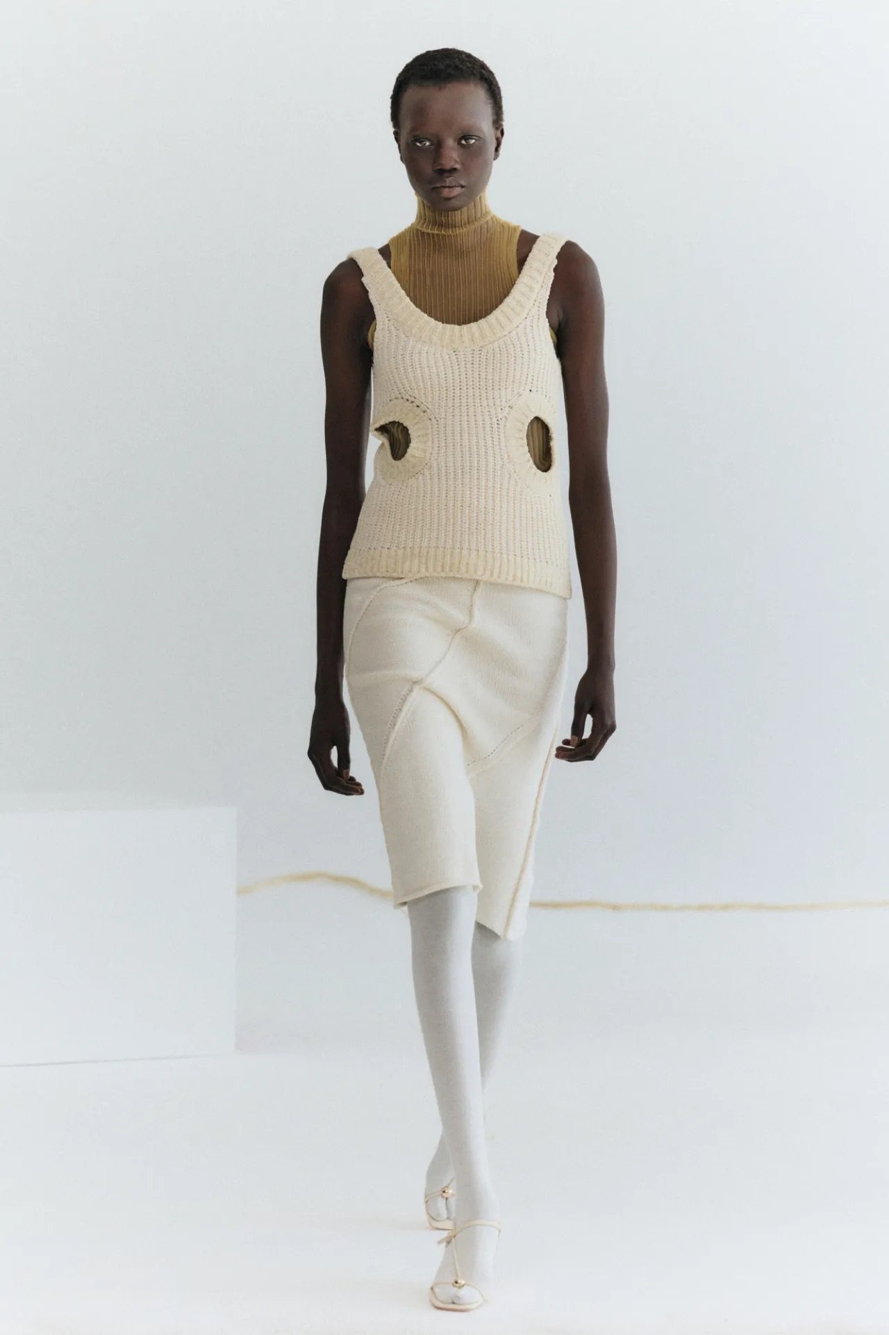Adaptability played a key role throughout. Streamlined tank dresses and tops were engineered with soft, movable straps that allowed the wearer to shift proportions and styling with minimal effort. In contrast, more experimental pieces — like a heavily textured hooded vest and matching skirt crafted through a shredded bias-weave method — introduced dimension and irregularity, echoing forms found in the natural world.