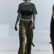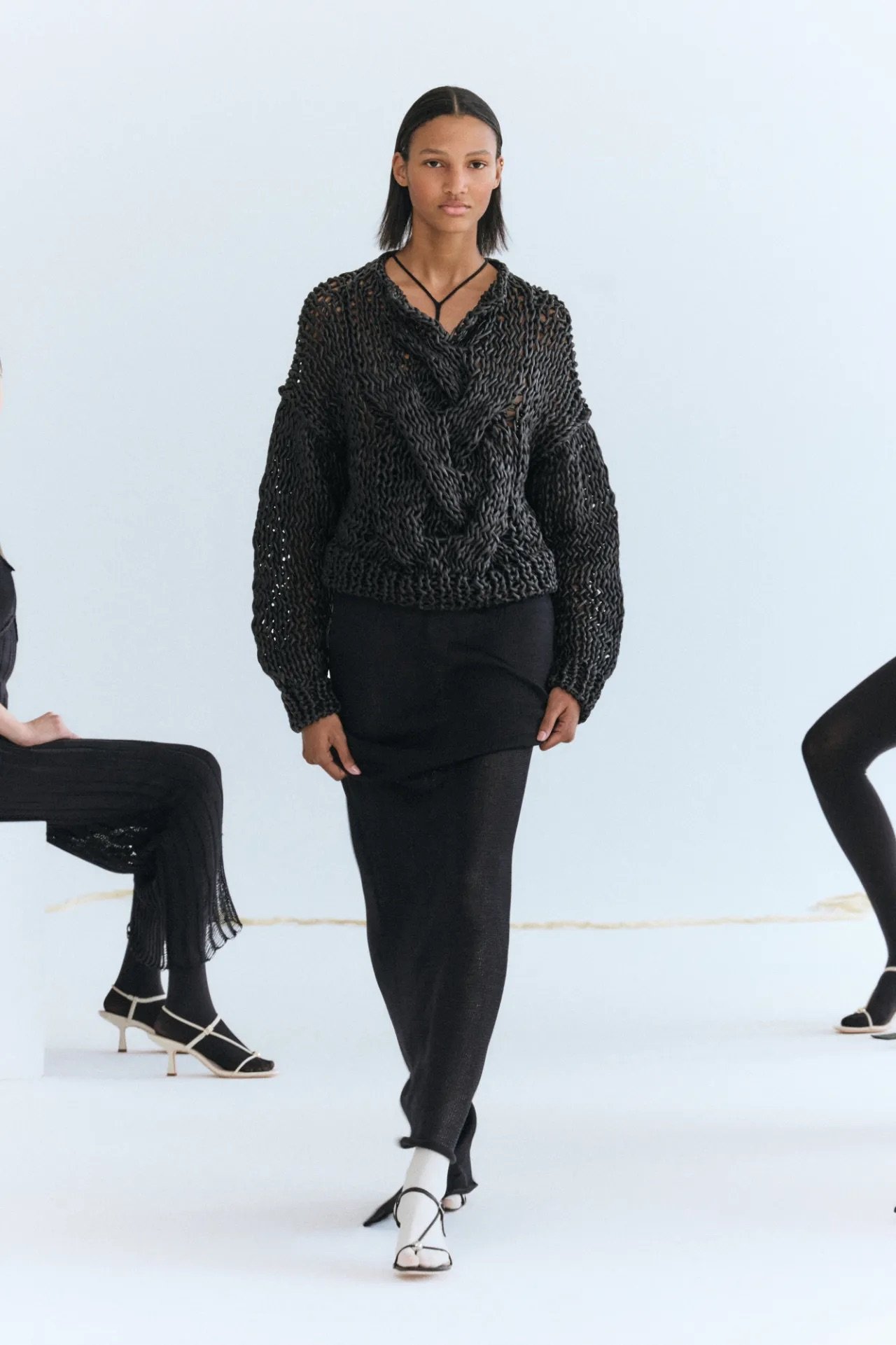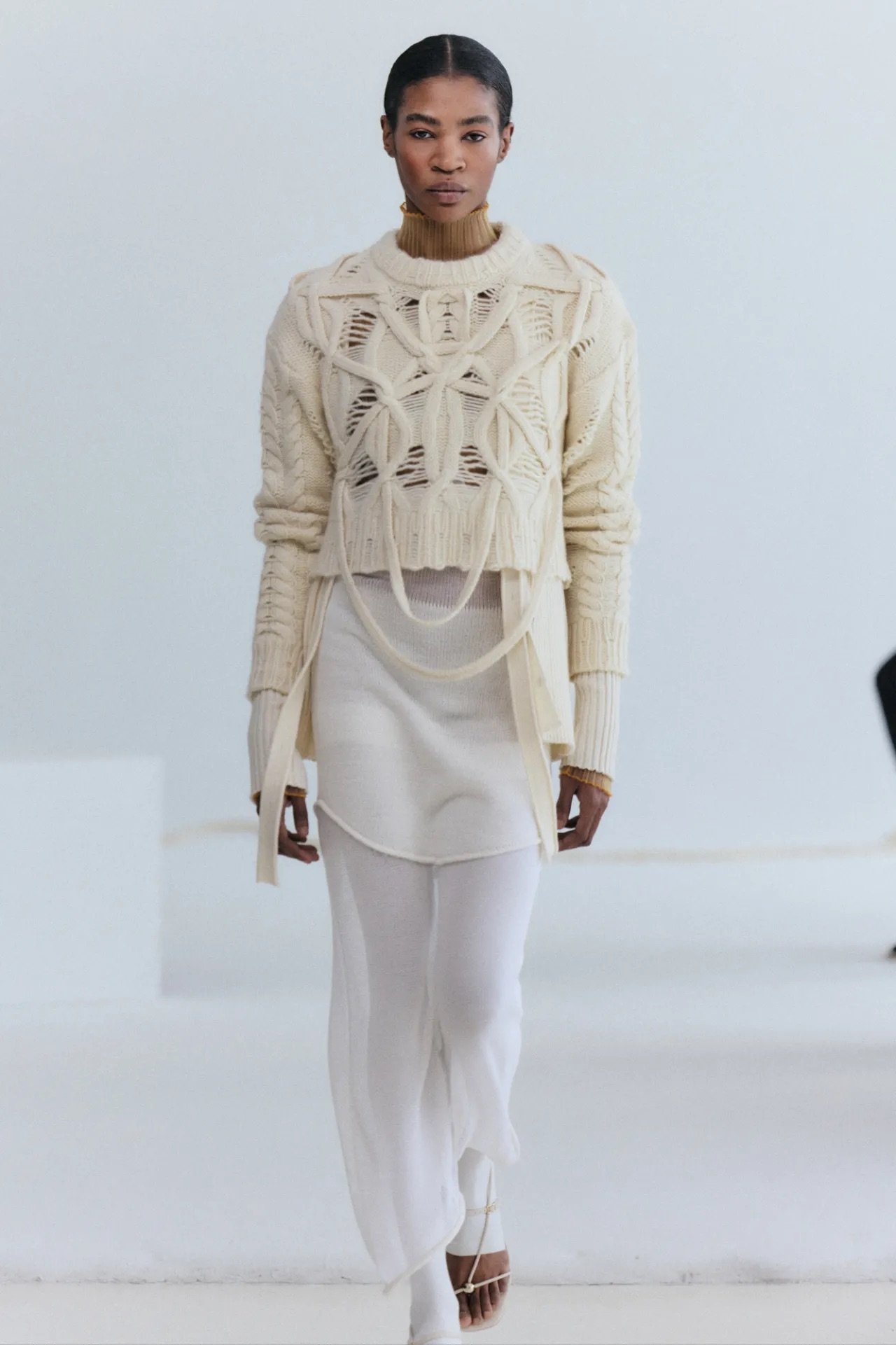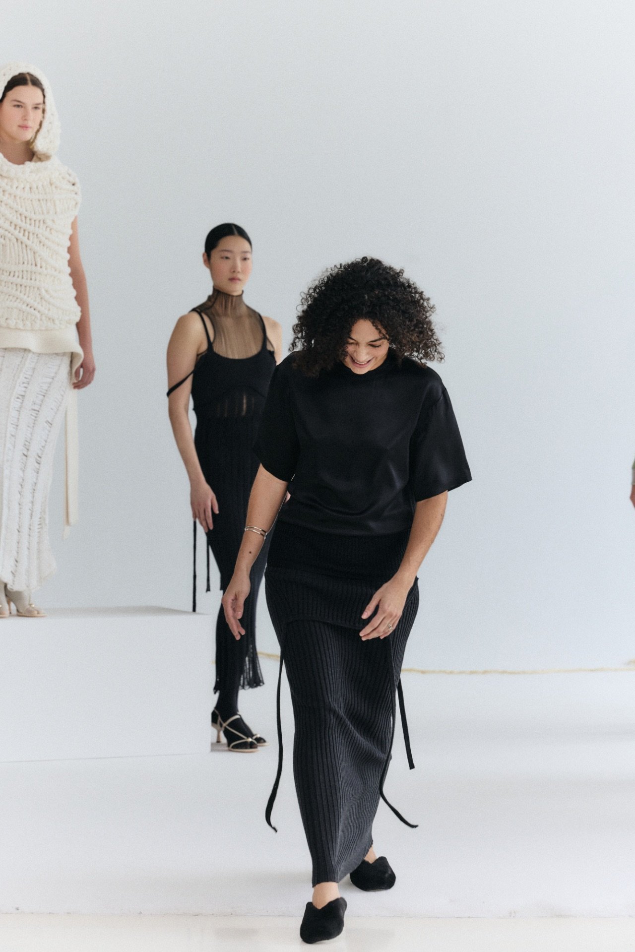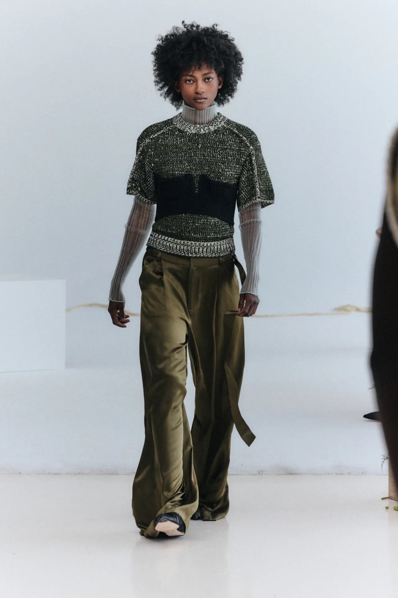 Camps’ work communicated most powerfully through technique. Her knitwear, much of it hand-loomed, explored the tension between precision and ease, merging sculptural construction with a relaxed, wearable sensibility. Subtle nods to her Trinidad roots surfaced in the textures and rhythm of the pieces, lending the collection a personal undercurrent without overt signalling.