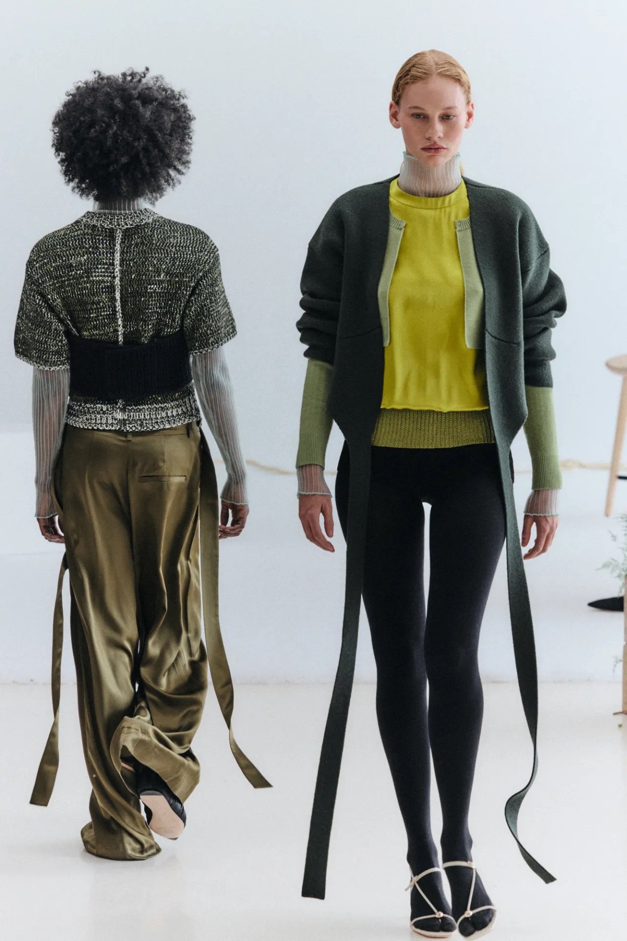 Nature’s influence extended beyond technique into colour. With her studio increasingly resembling a dense, plant-filled environment, Camps translated that immersion into a layered palette of greens, ranging from muted olive to vivid chartreuse and deep fern. The effect was immersive rather than decorative, wrapping the collection in a tonal story that felt grounded and restorative.