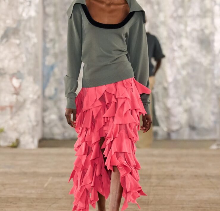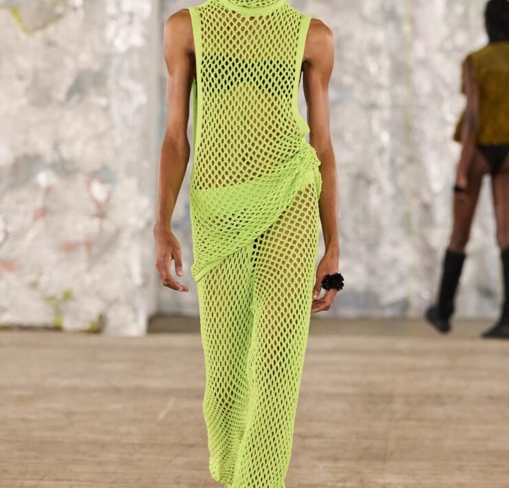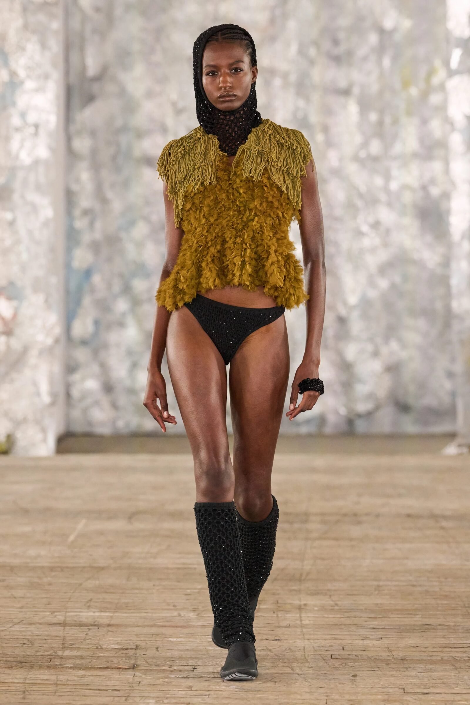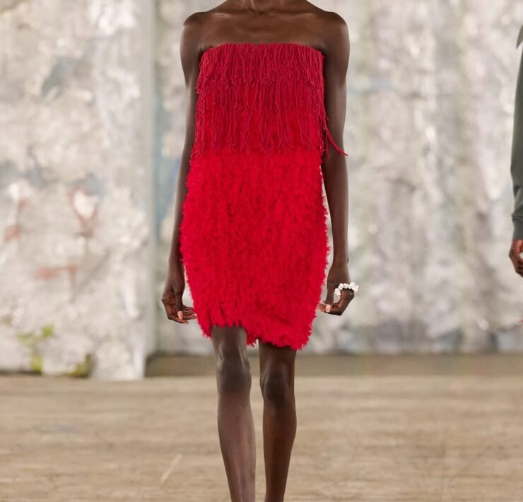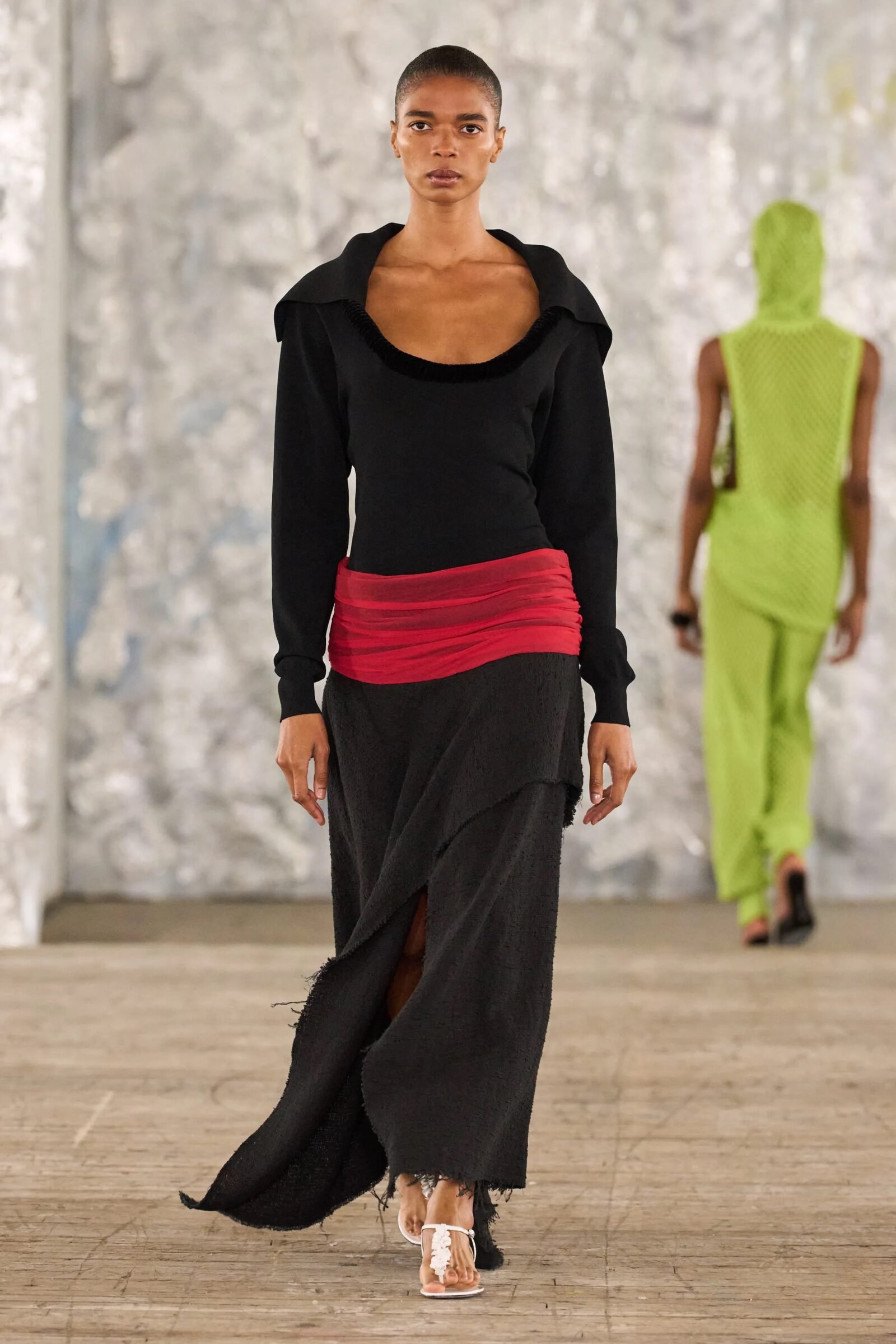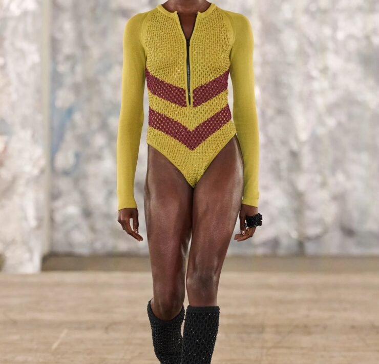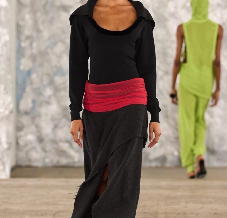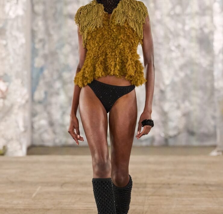 Staged in a cavernous Greenpoint space, the show channeled the spirit of Caribbean Carnival — not as costume, but as resistance through joy, sensuality, and spectacle. Crochet separates, shredded rayon that fluttered like feathers, macramé trims, and melted paillettes evoked tradition without literalism. Colour clashes — lime with guava, neon pink with grey — gave vibrancy to wearable silhouettes: square sailor collars on fluid tops, featherlike skirts, and jackets cut from the architecture of cage bras, brimming with sex appeal. Swimwear sparkled in Scott’s micro-sequins, while strappy heels previewed her forthcoming shoe line.
