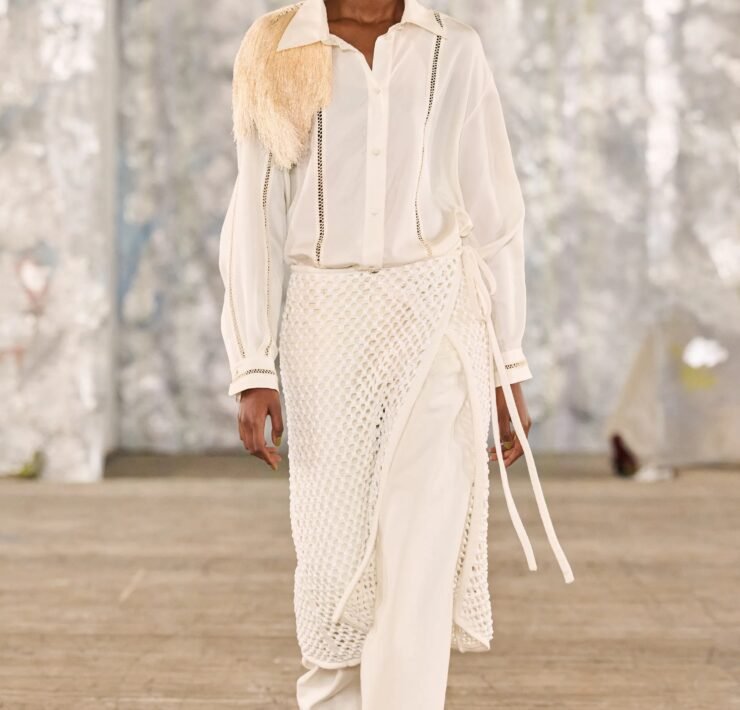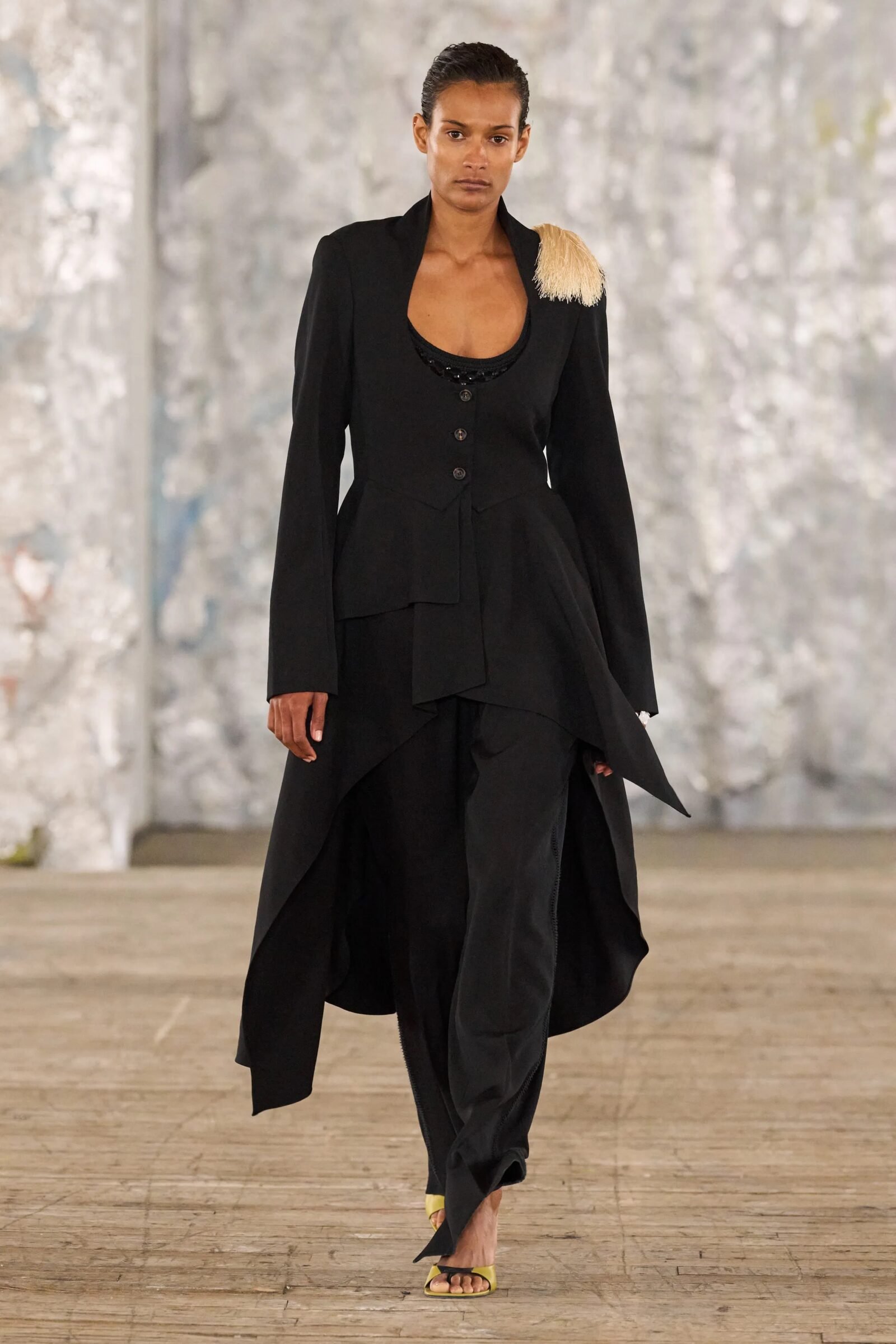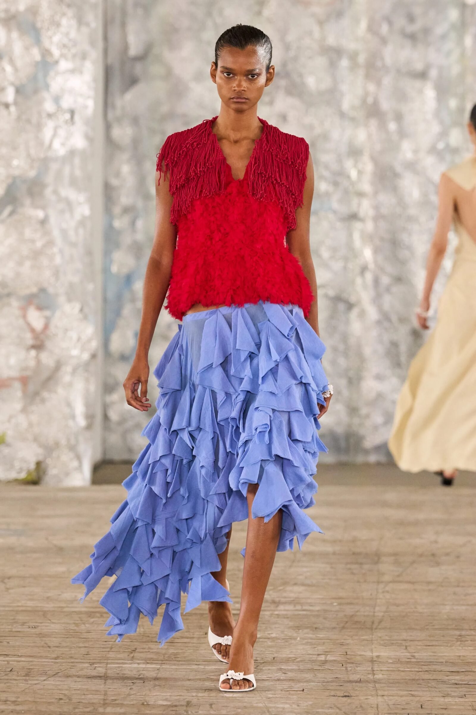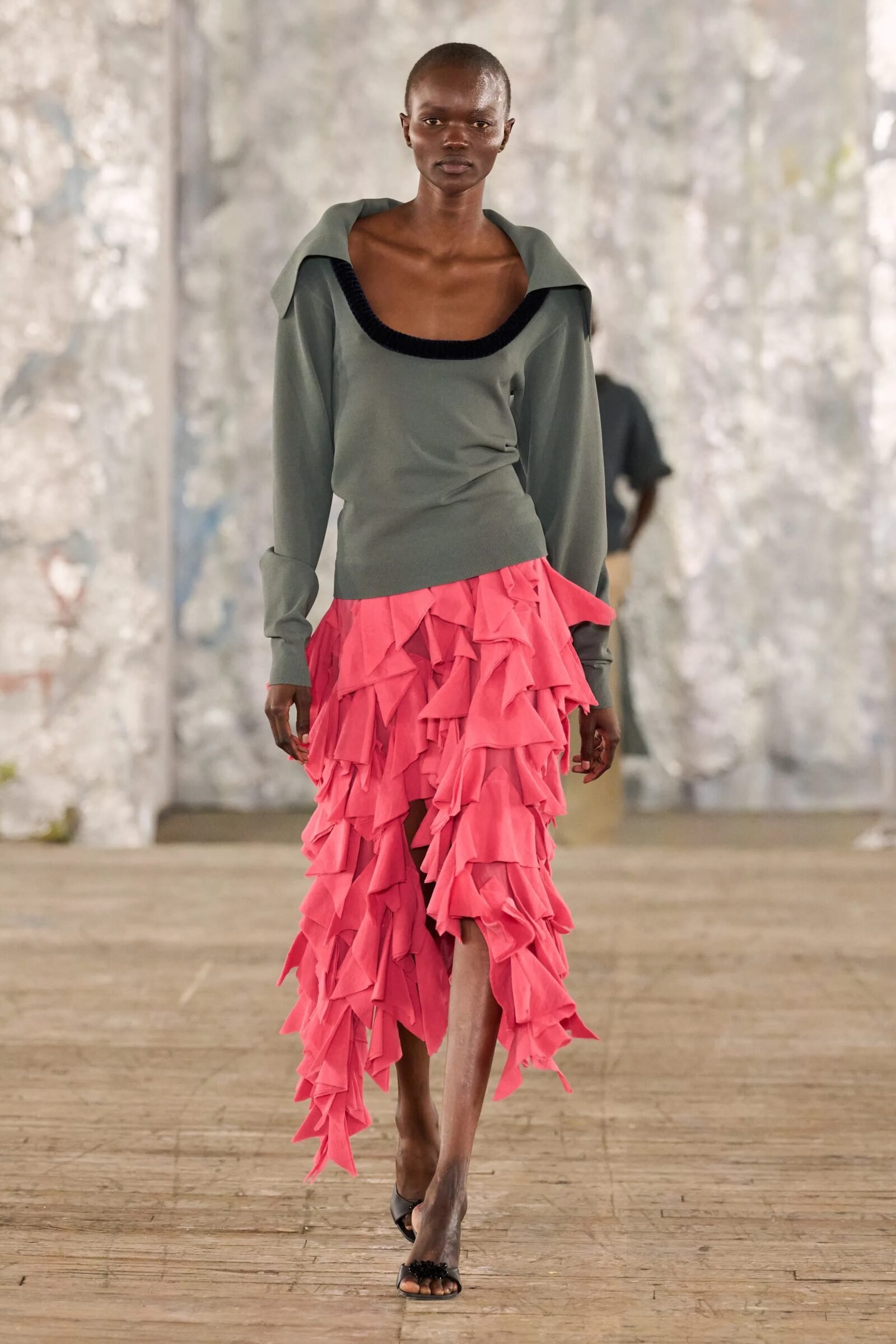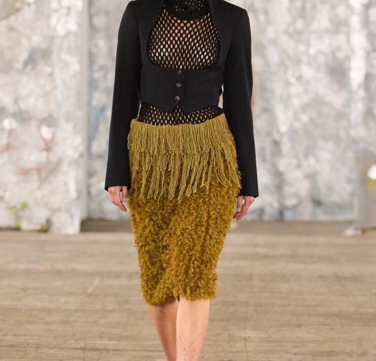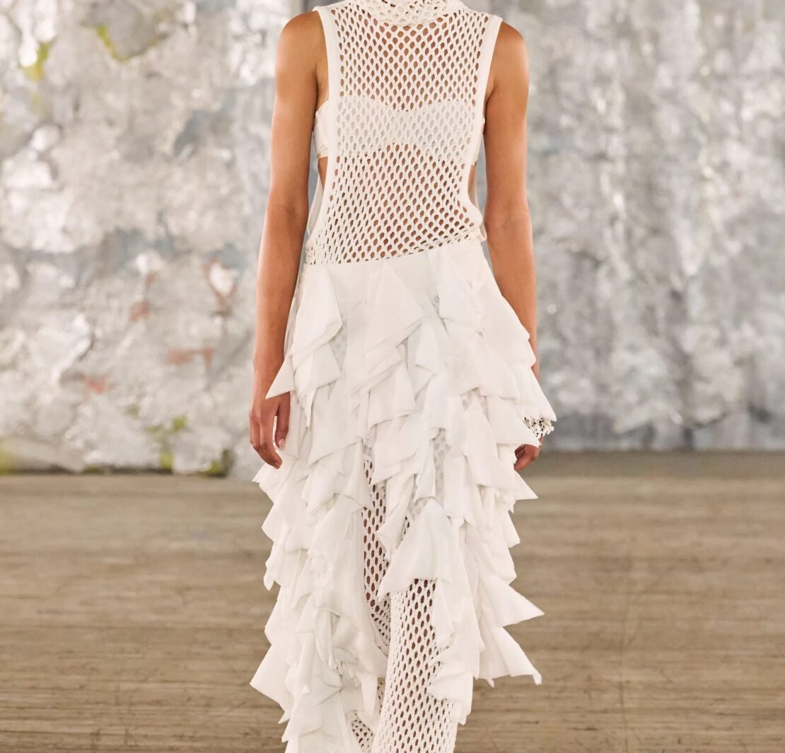 Staged in a cavernous Greenpoint space, the show channeled the spirit of Caribbean Carnival — not as costume, but as resistance through joy, sensuality, and spectacle. Crochet separates, shredded rayon that fluttered like feathers, macramé trims, and melted paillettes evoked tradition without literalism. Colour clashes — lime with guava, neon pink with grey — gave vibrancy to wearable silhouettes: square sailor collars on fluid tops, featherlike skirts, and jackets cut from the architecture of cage bras, brimming with sex appeal. Swimwear sparkled in Scott’s micro-sequins, while strappy heels previewed her forthcoming shoe line.