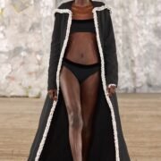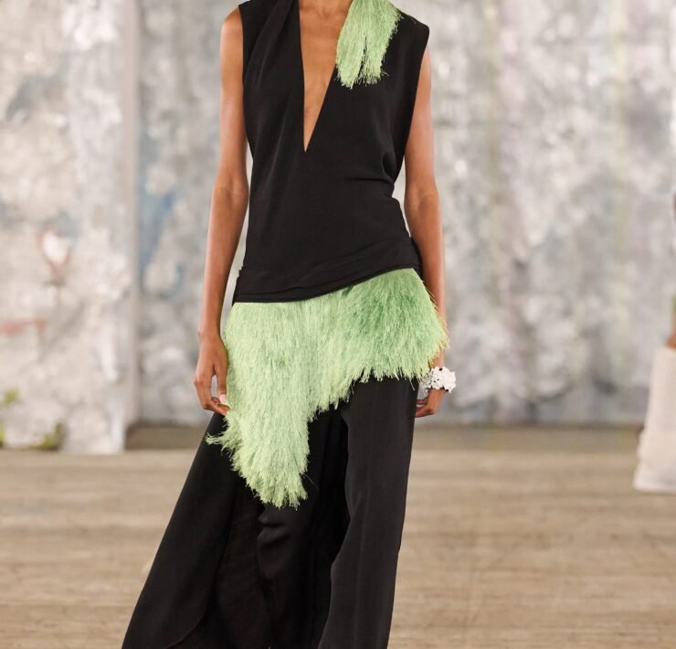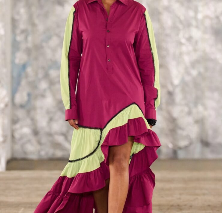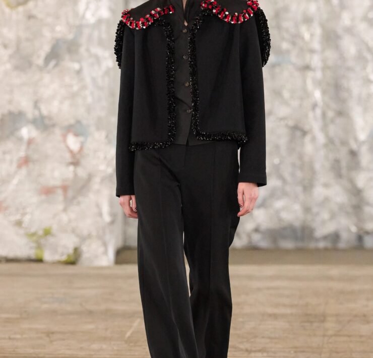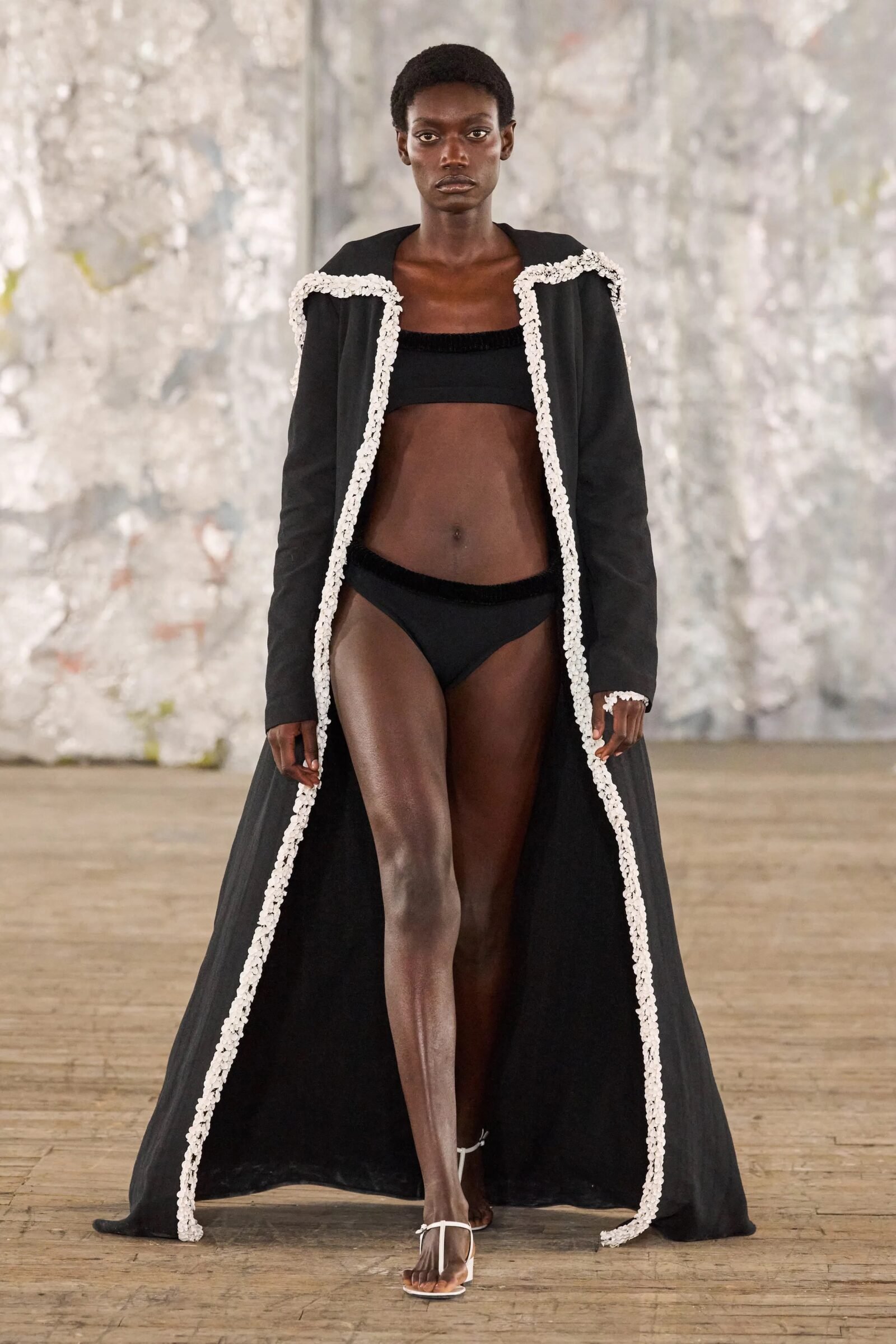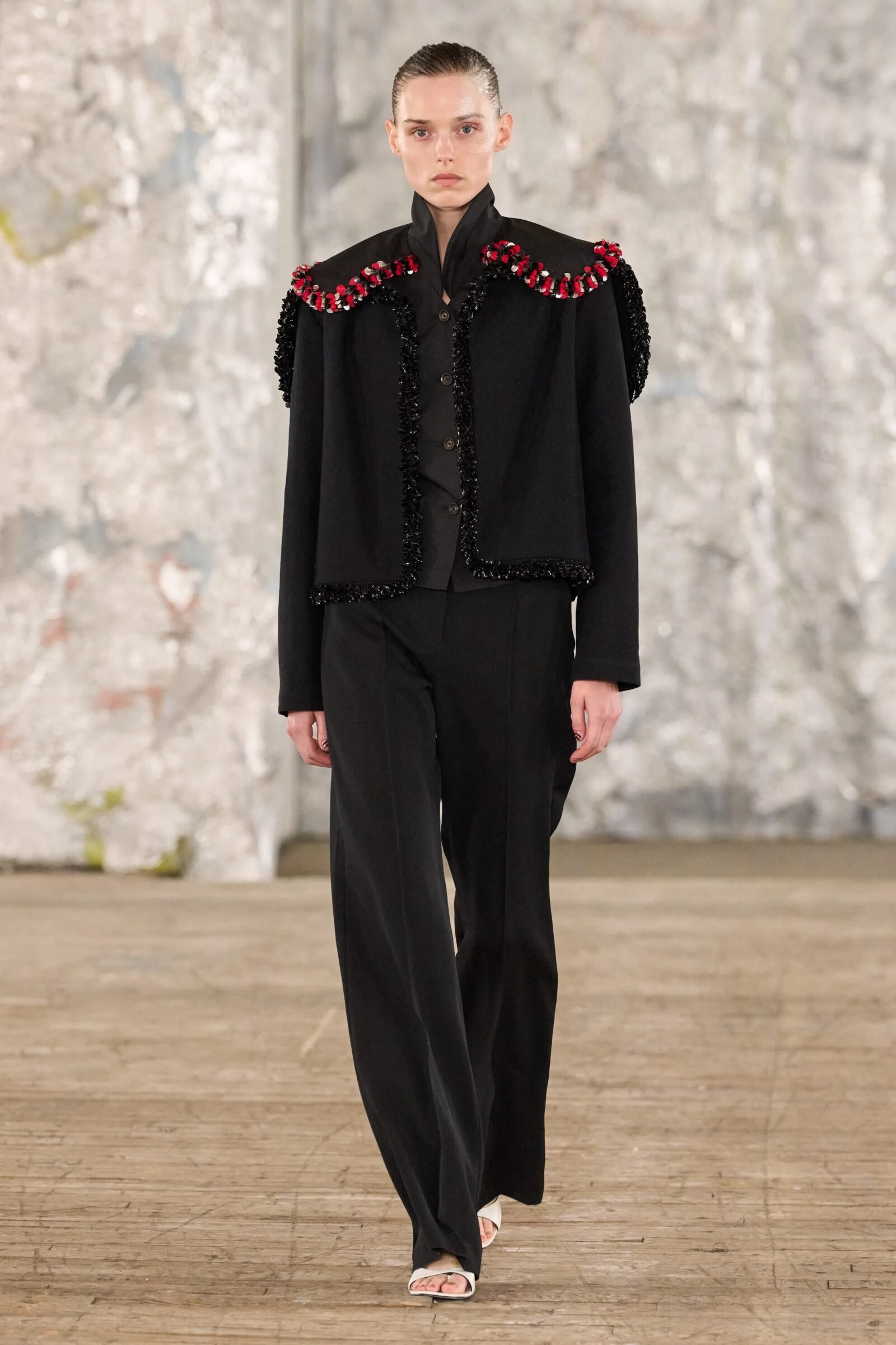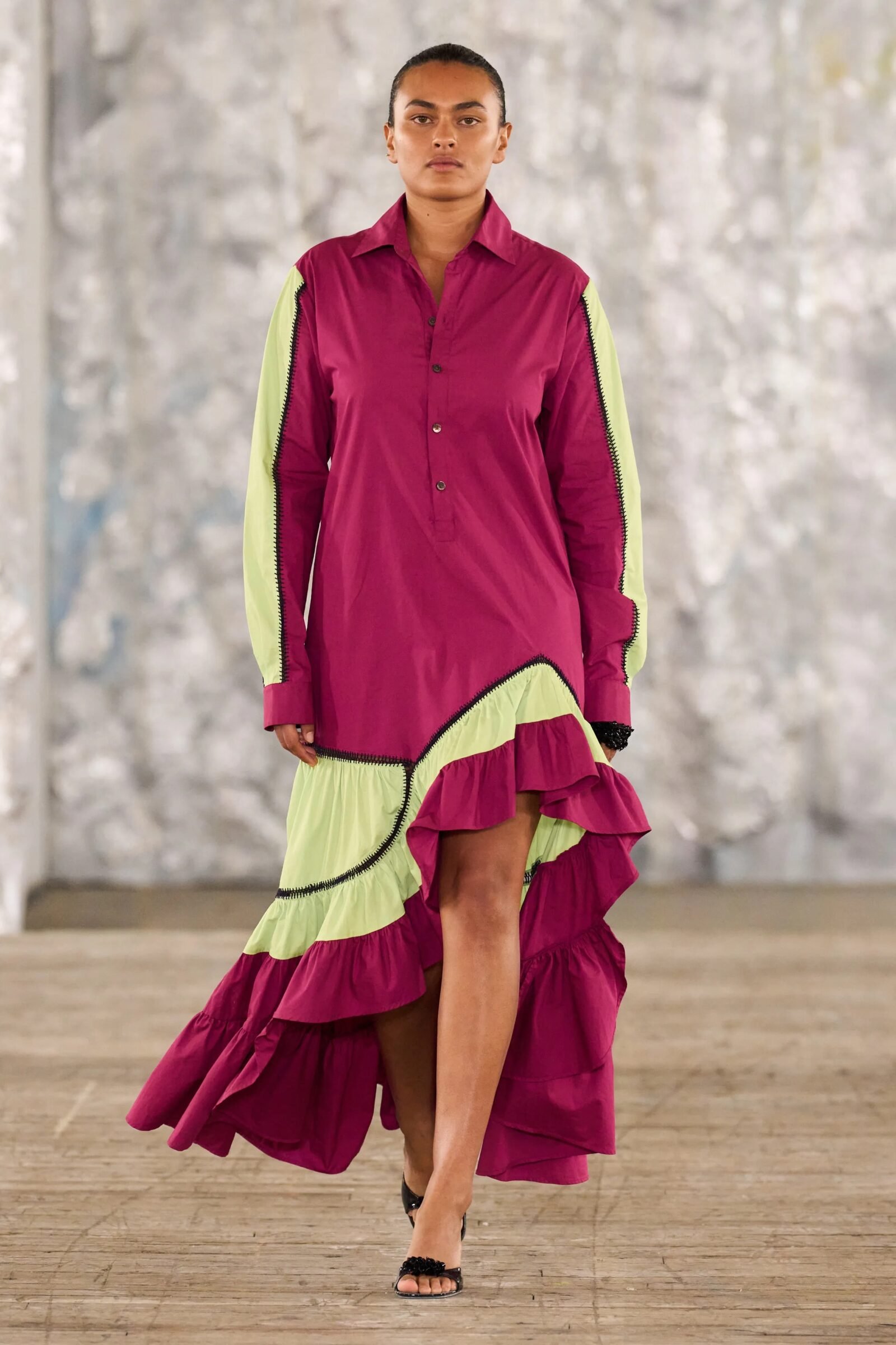 Staged in a cavernous Greenpoint space, the show channeled the spirit of Caribbean Carnival — not as costume, but as resistance through joy, sensuality, and spectacle. Crochet separates, shredded rayon that fluttered like feathers, macramé trims, and melted paillettes evoked tradition without literalism. Colour clashes — lime with guava, neon pink with grey — gave vibrancy to wearable silhouettes: square sailor collars on fluid tops, featherlike skirts, and jackets cut from the architecture of cage bras, brimming with sex appeal. Swimwear sparkled in Scott’s micro-sequins, while strappy heels previewed her forthcoming shoe line.
