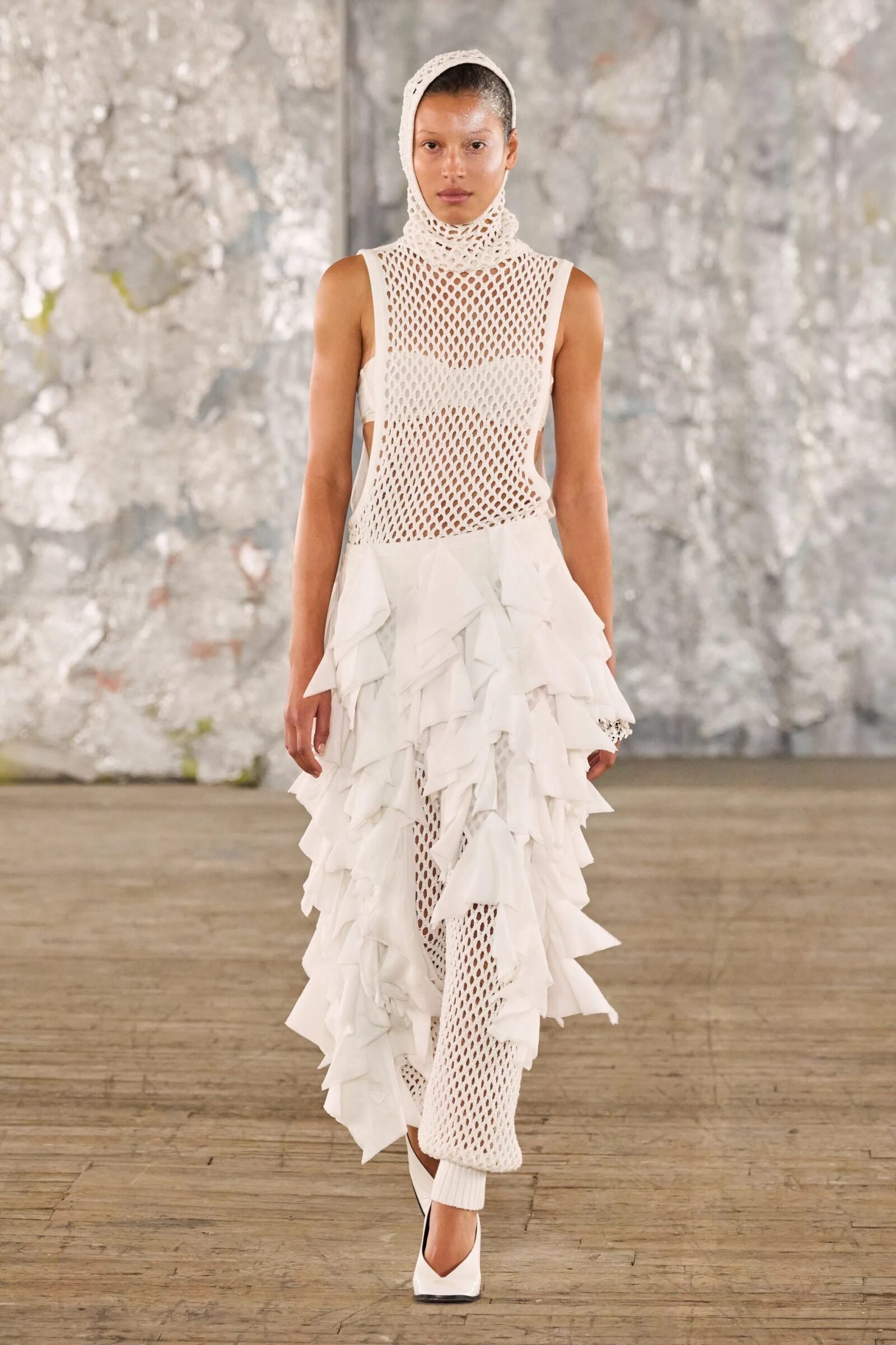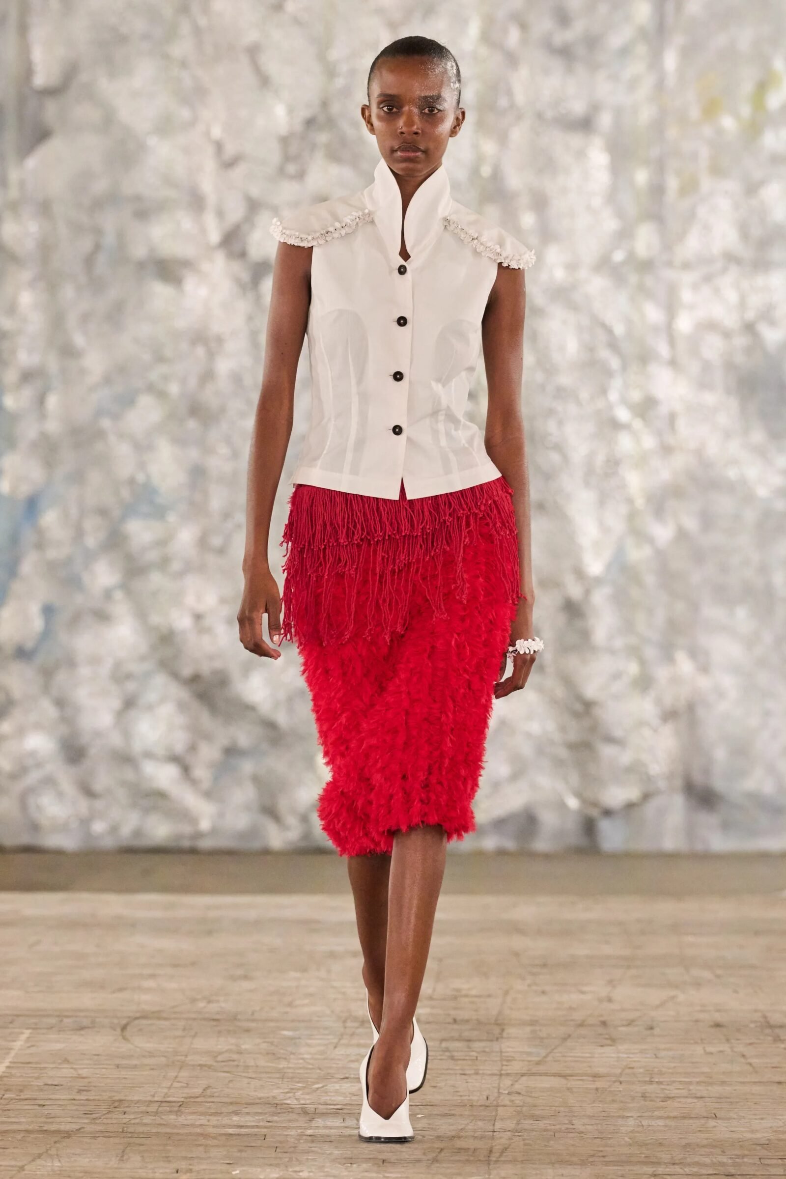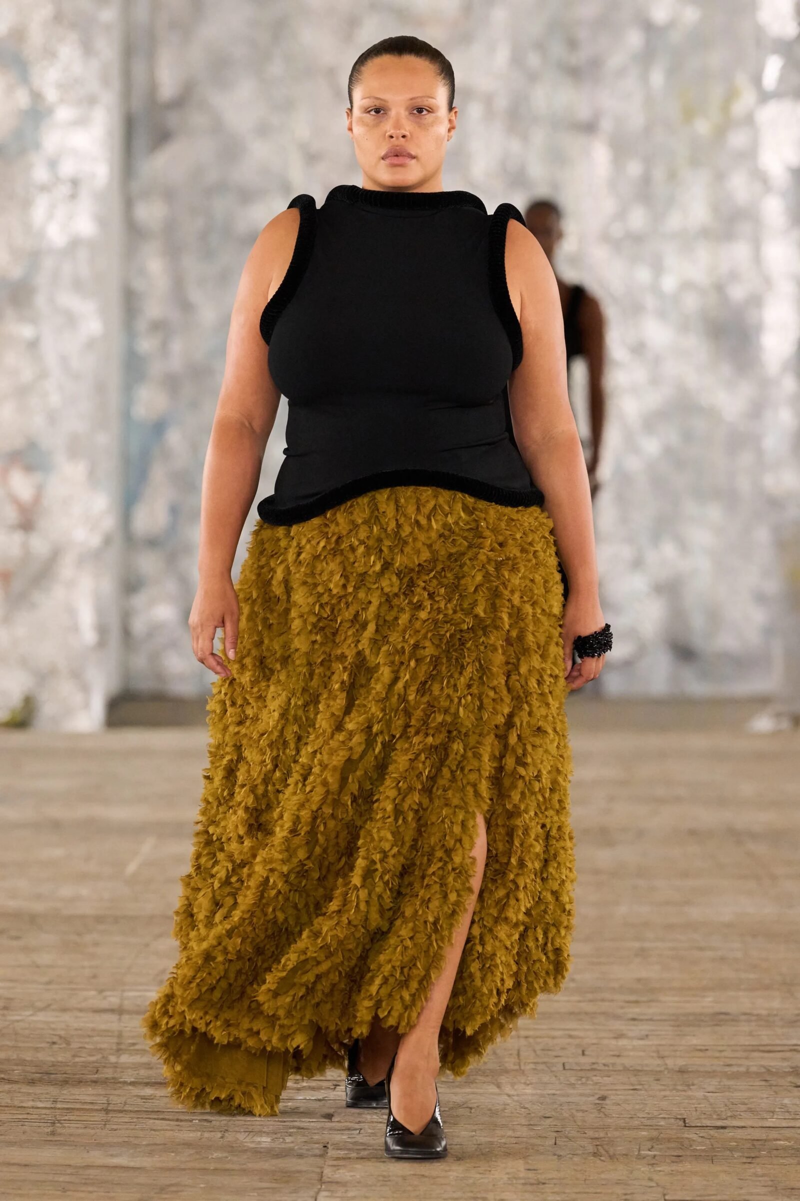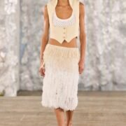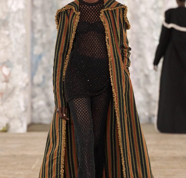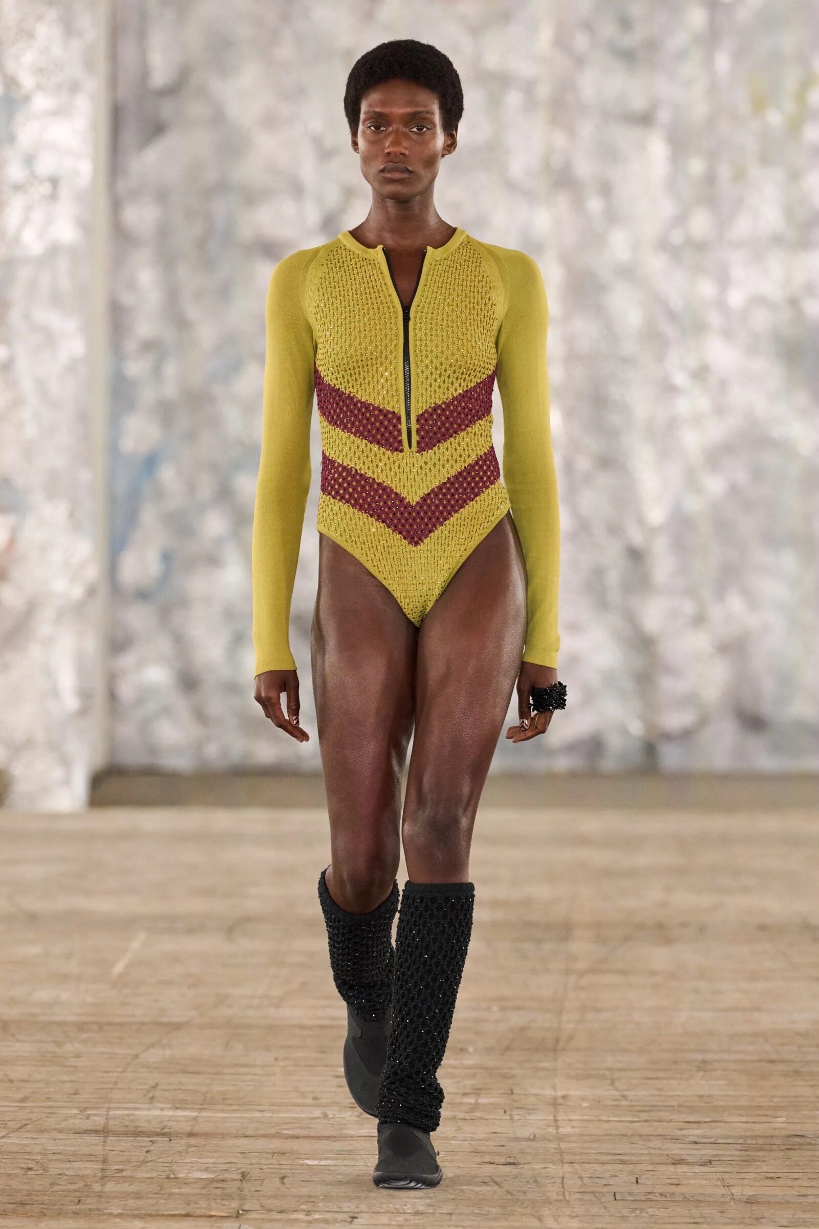 Staged in a cavernous Greenpoint space, the show channeled the spirit of Caribbean Carnival — not as costume, but as resistance through joy, sensuality, and spectacle. Crochet separates, shredded rayon that fluttered like feathers, macramé trims, and melted paillettes evoked tradition without literalism. Colour clashes — lime with guava, neon pink with grey — gave vibrancy to wearable silhouettes: square sailor collars on fluid tops, featherlike skirts, and jackets cut from the architecture of cage bras, brimming with sex appeal. Swimwear sparkled in Scott’s micro-sequins, while strappy heels previewed her forthcoming shoe line.