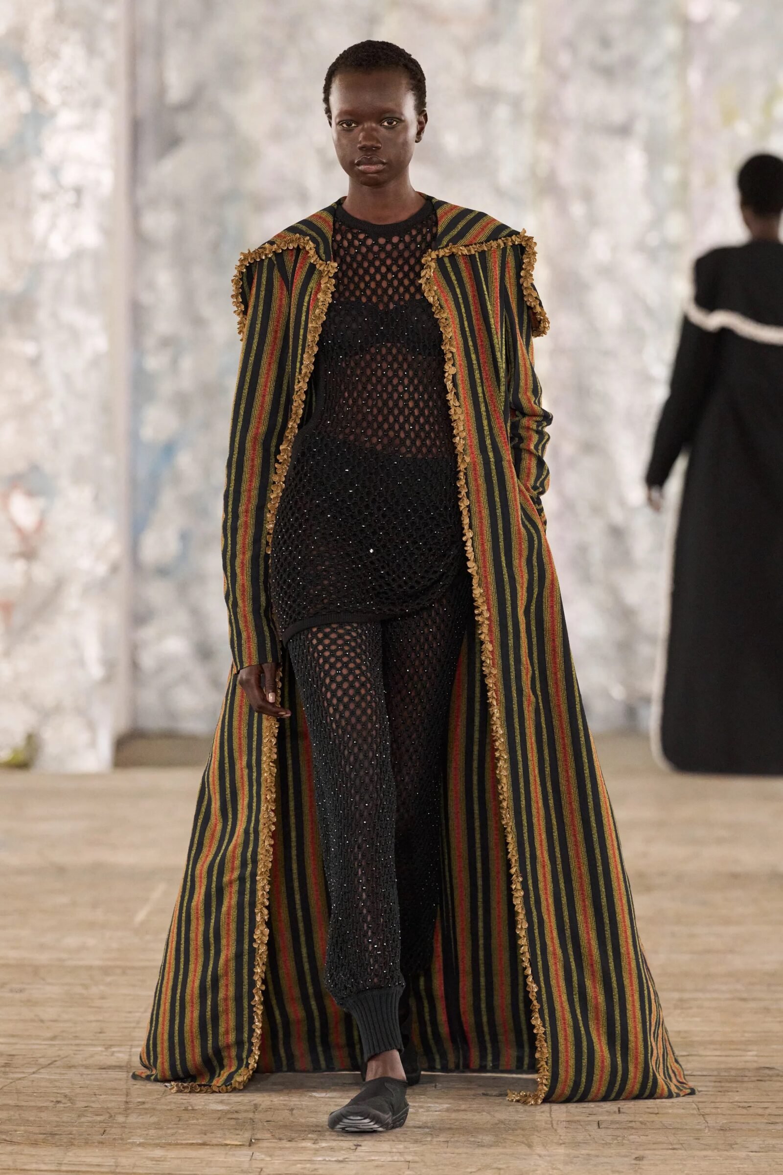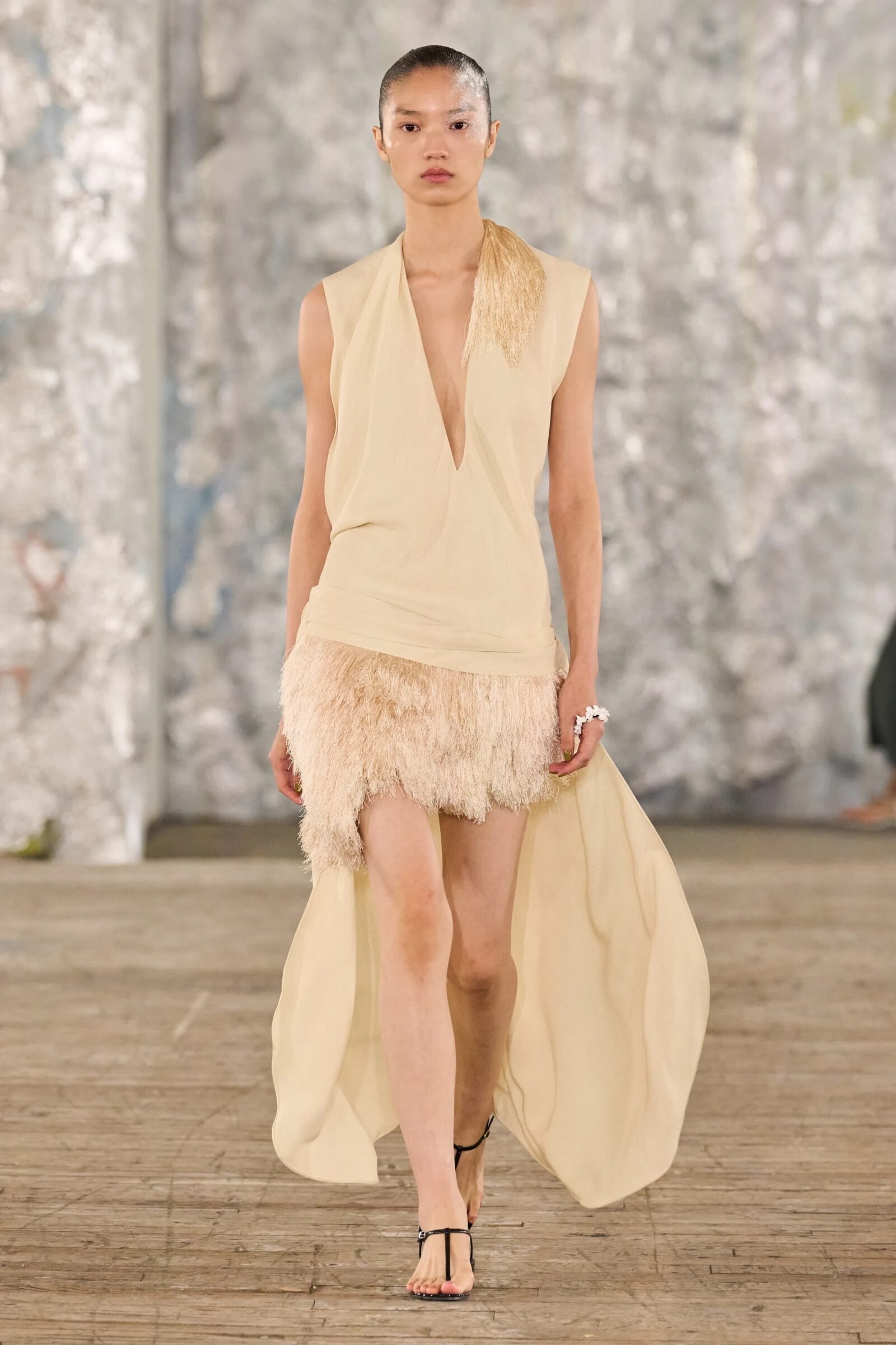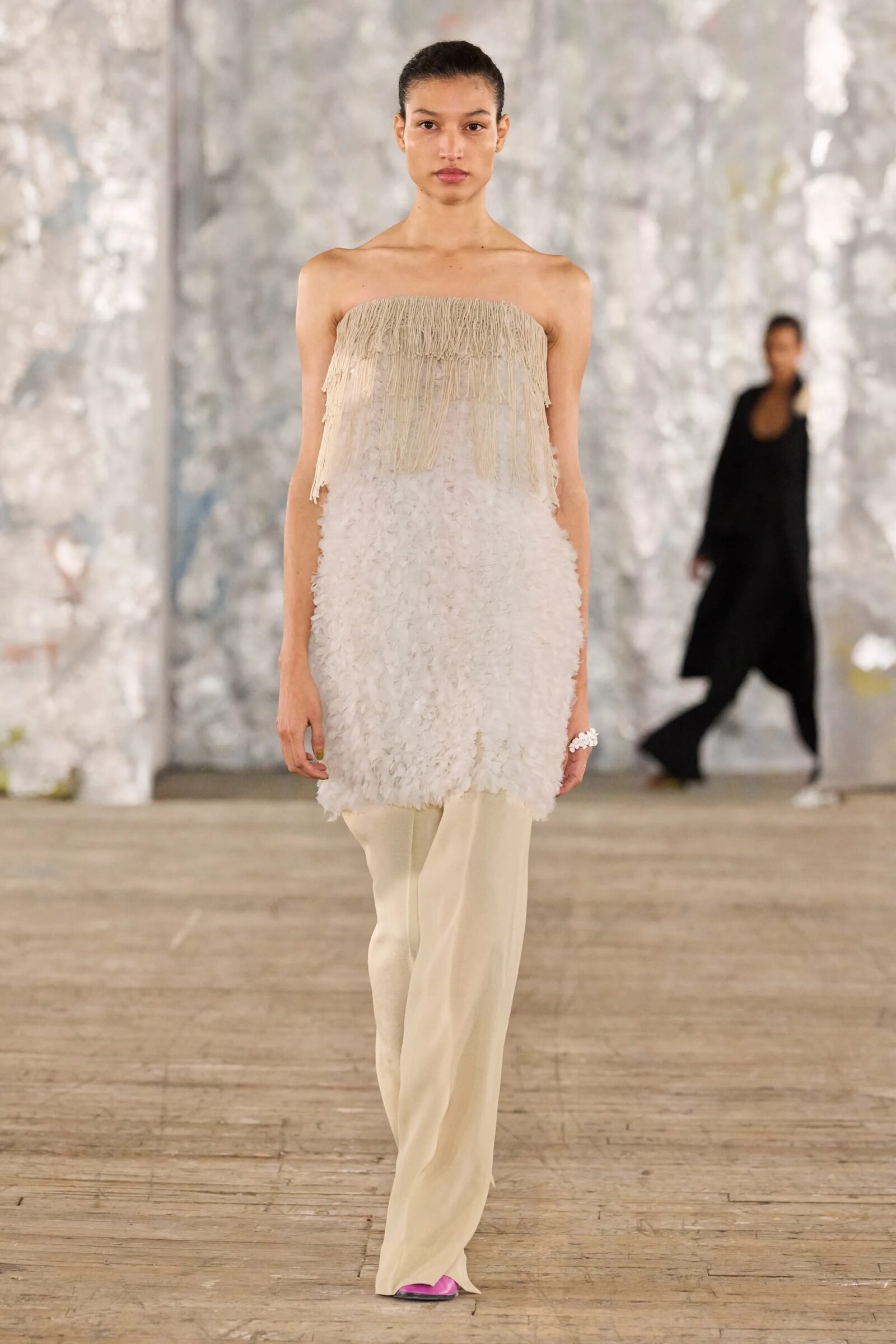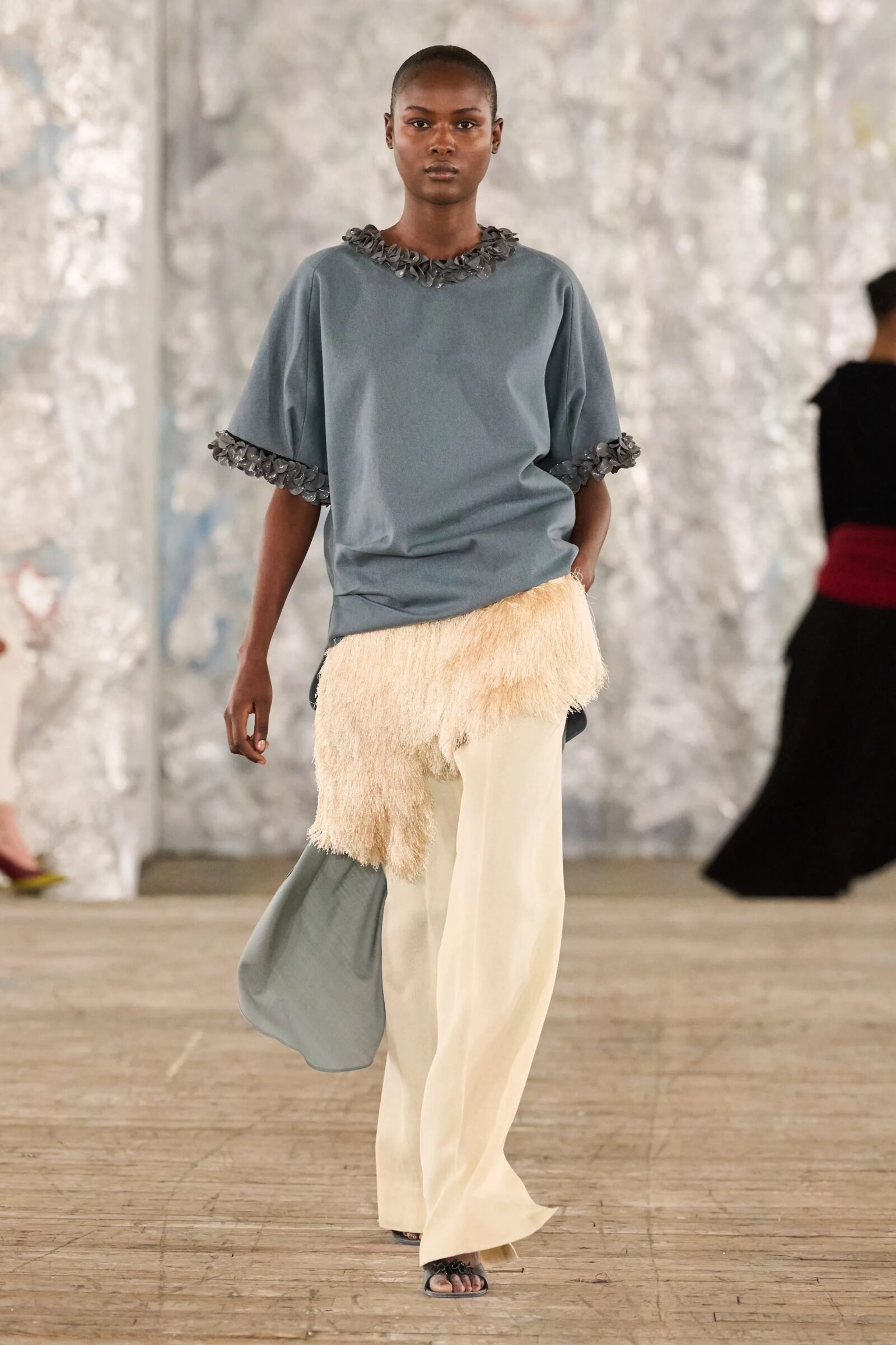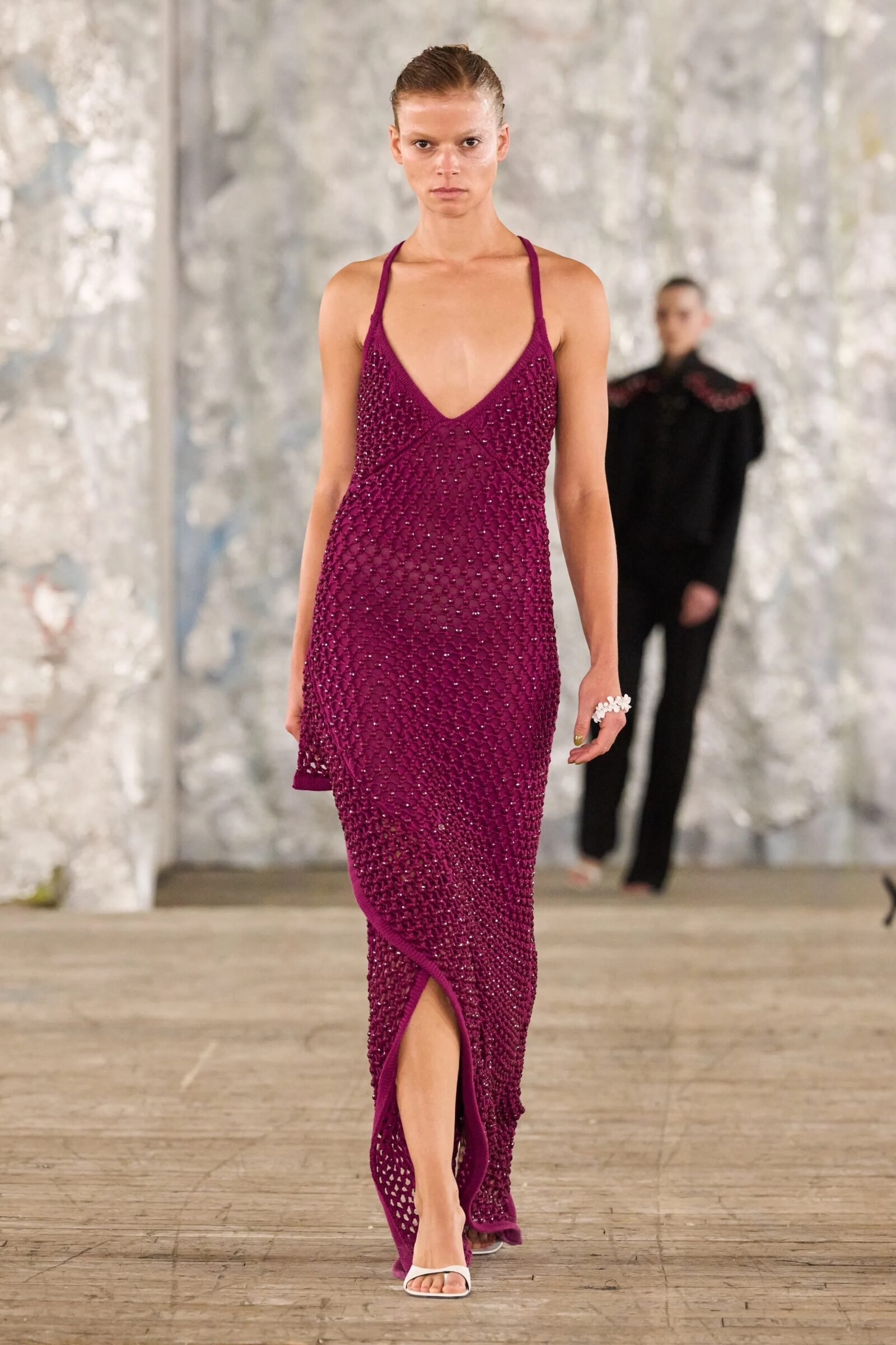 Staged in a cavernous Greenpoint space, the show channeled the spirit of Caribbean Carnival — not as costume, but as resistance through joy, sensuality, and spectacle. Crochet separates, shredded rayon that fluttered like feathers, macramé trims, and melted paillettes evoked tradition without literalism. Colour clashes — lime with guava, neon pink with grey — gave vibrancy to wearable silhouettes: square sailor collars on fluid tops, featherlike skirts, and jackets cut from the architecture of cage bras, brimming with sex appeal. Swimwear sparkled in Scott’s micro-sequins, while strappy heels previewed her forthcoming shoe line.