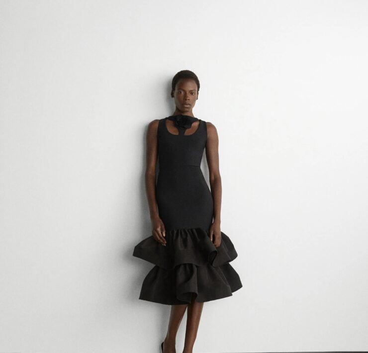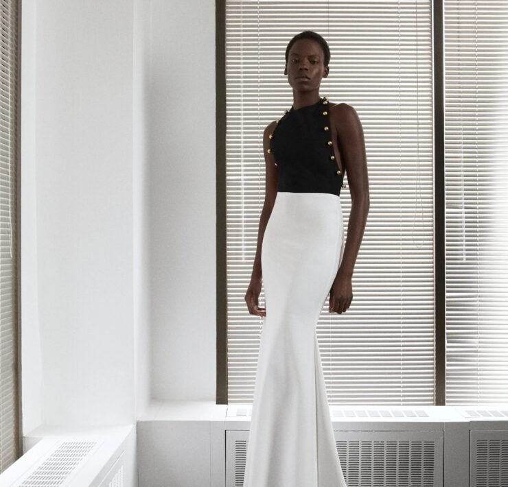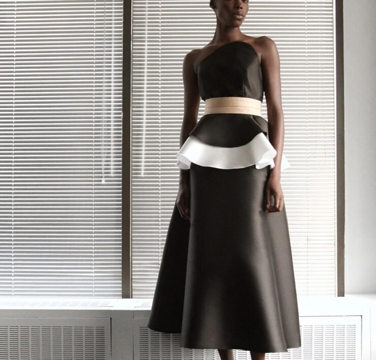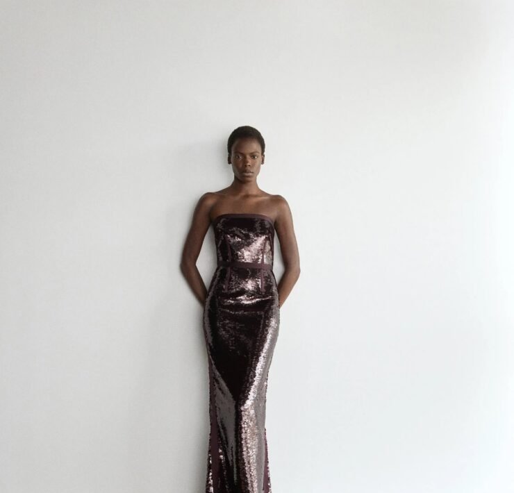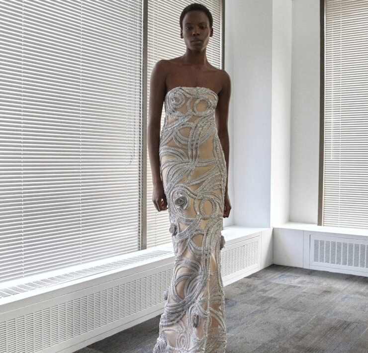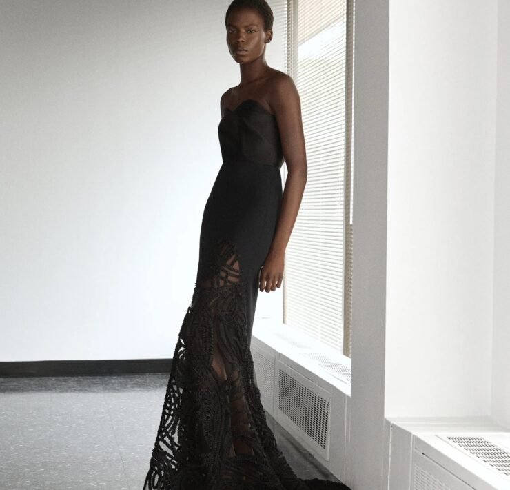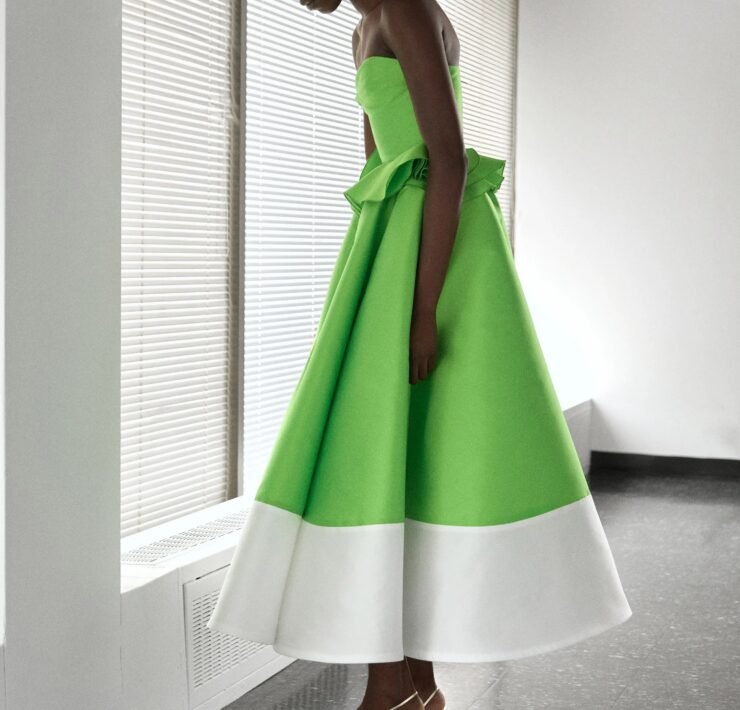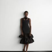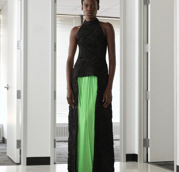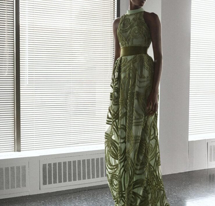 That influence showed up in gowns riffing on the Jamaican flag’s black, green, and gold — like a strapless mikado gown in vivid green and a sleek black embroidered dress. Beachside memories also informed the collection, from a shimmery shell-inspired cocktail frock to a coral ruffle gown evoking snorkelling adventures.