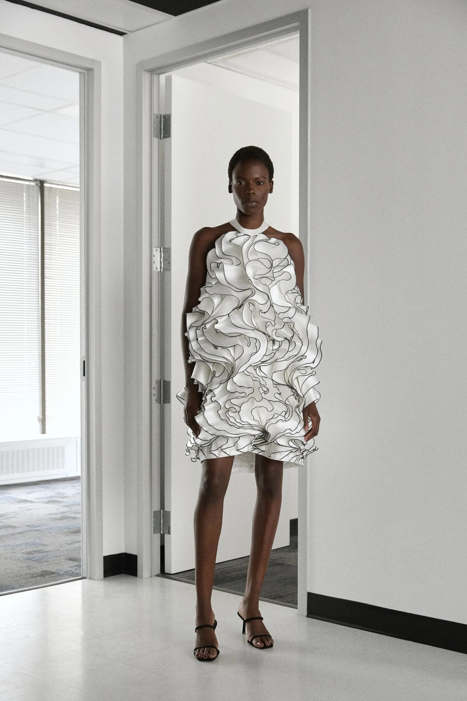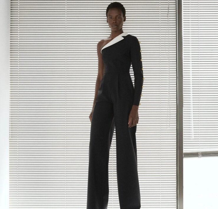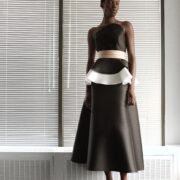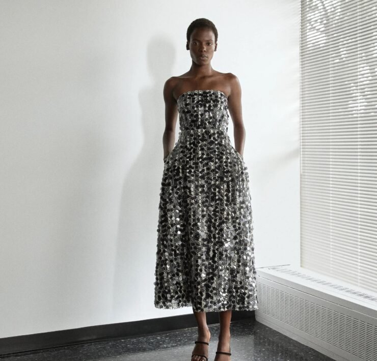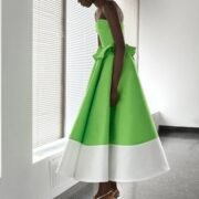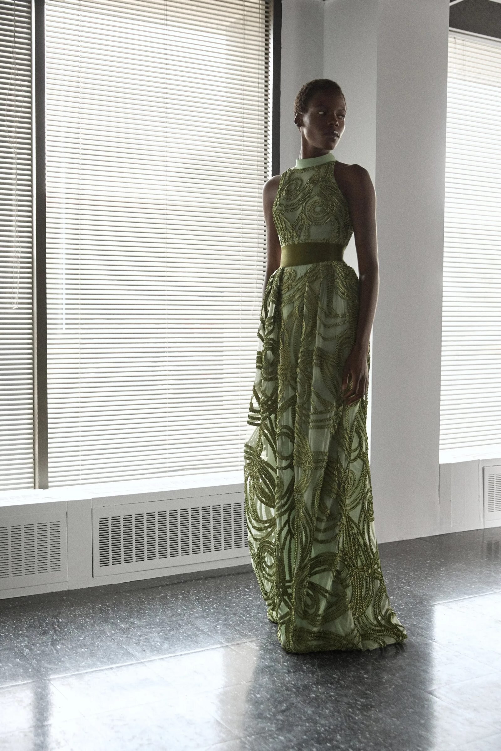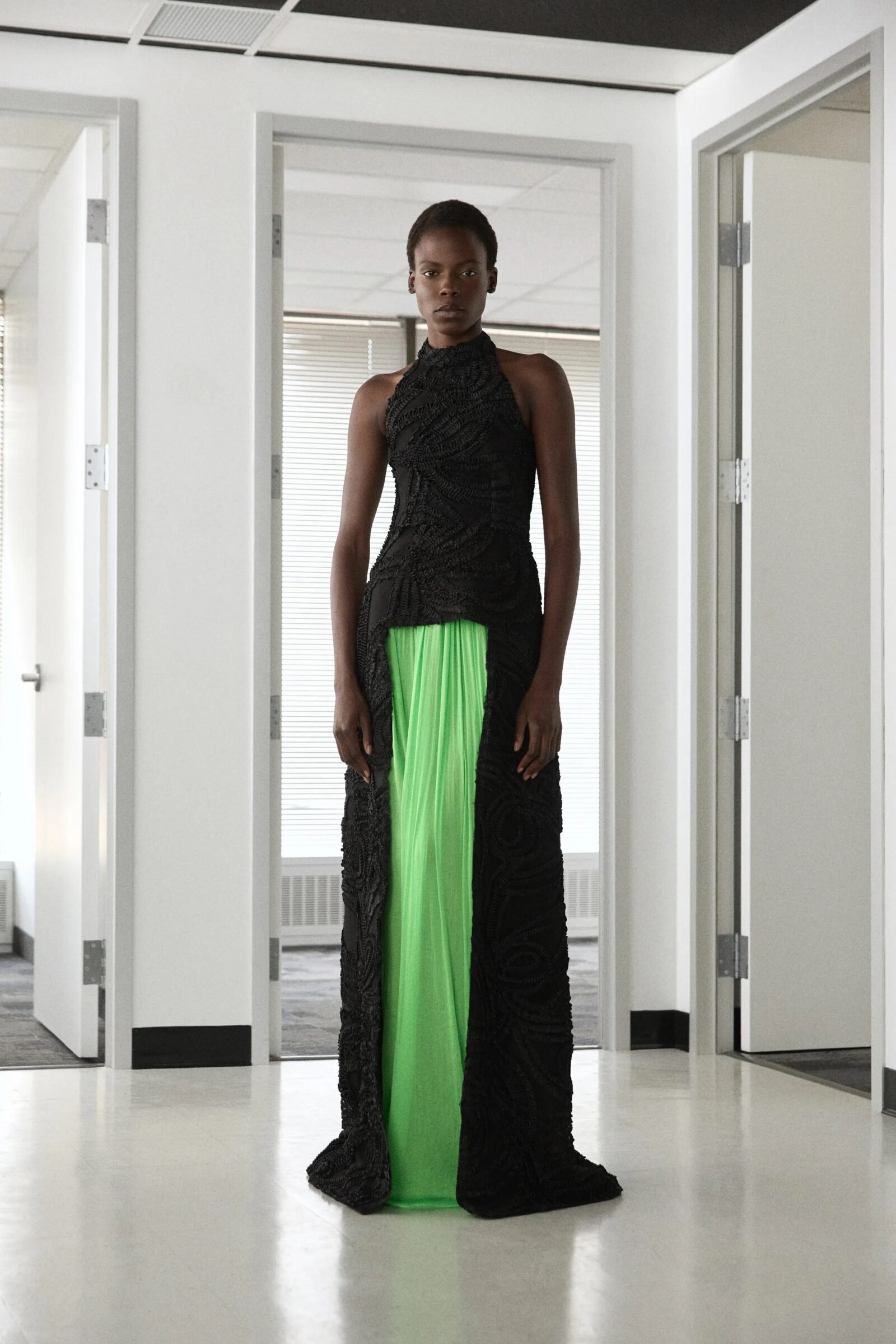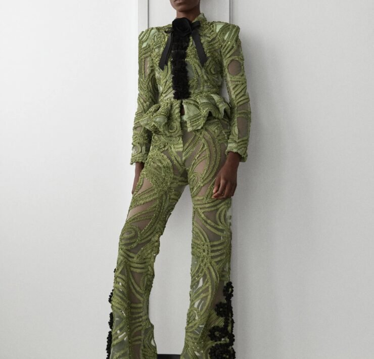 That influence showed up in gowns riffing on the Jamaican flag’s black, green, and gold — like a strapless mikado gown in vivid green and a sleek black embroidered dress. Beachside memories also informed the collection, from a shimmery shell-inspired cocktail frock to a coral ruffle gown evoking snorkelling adventures.
