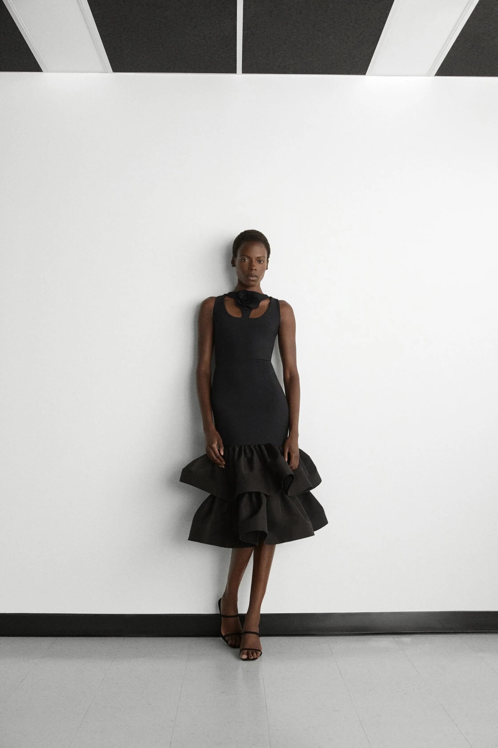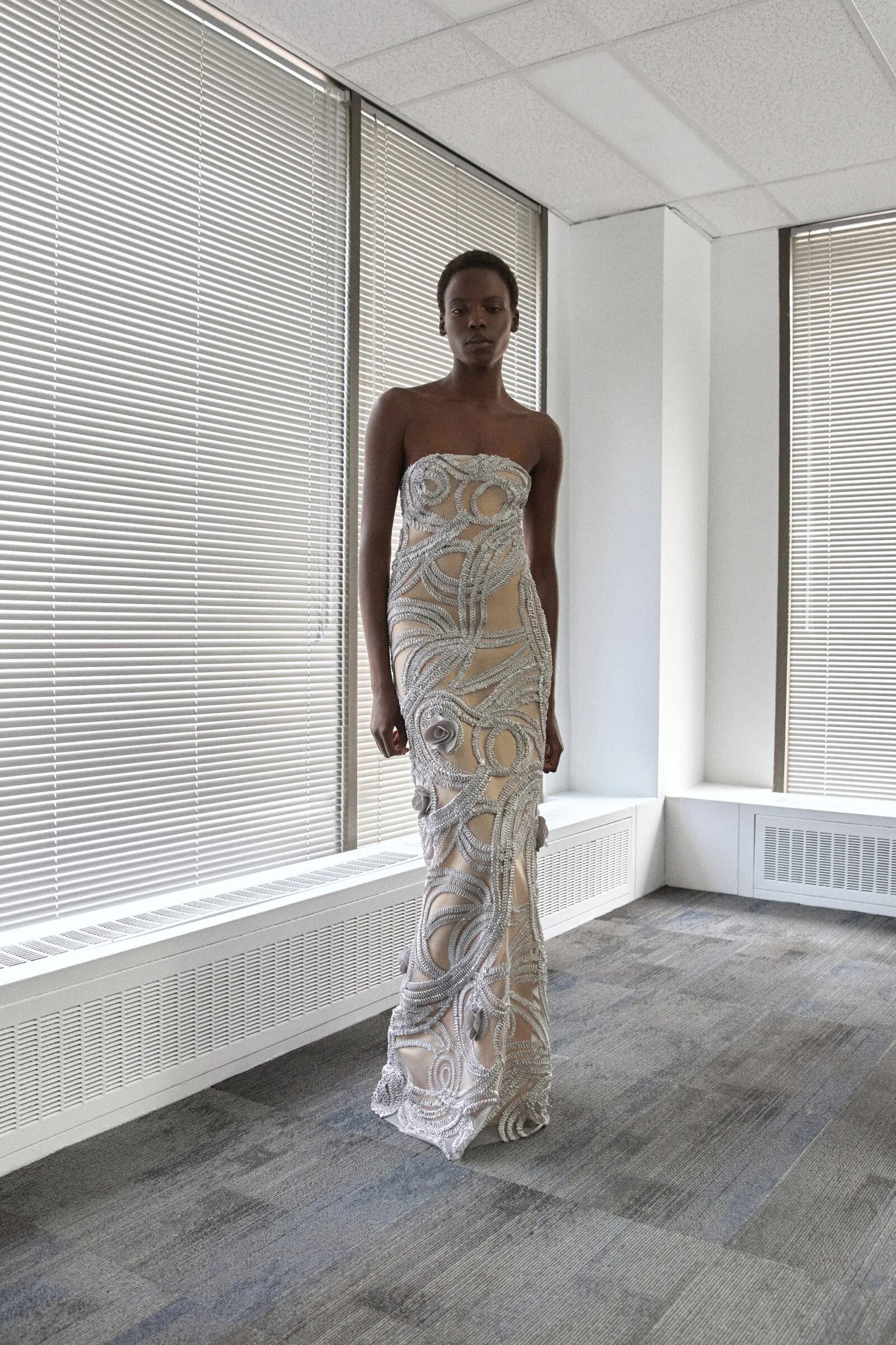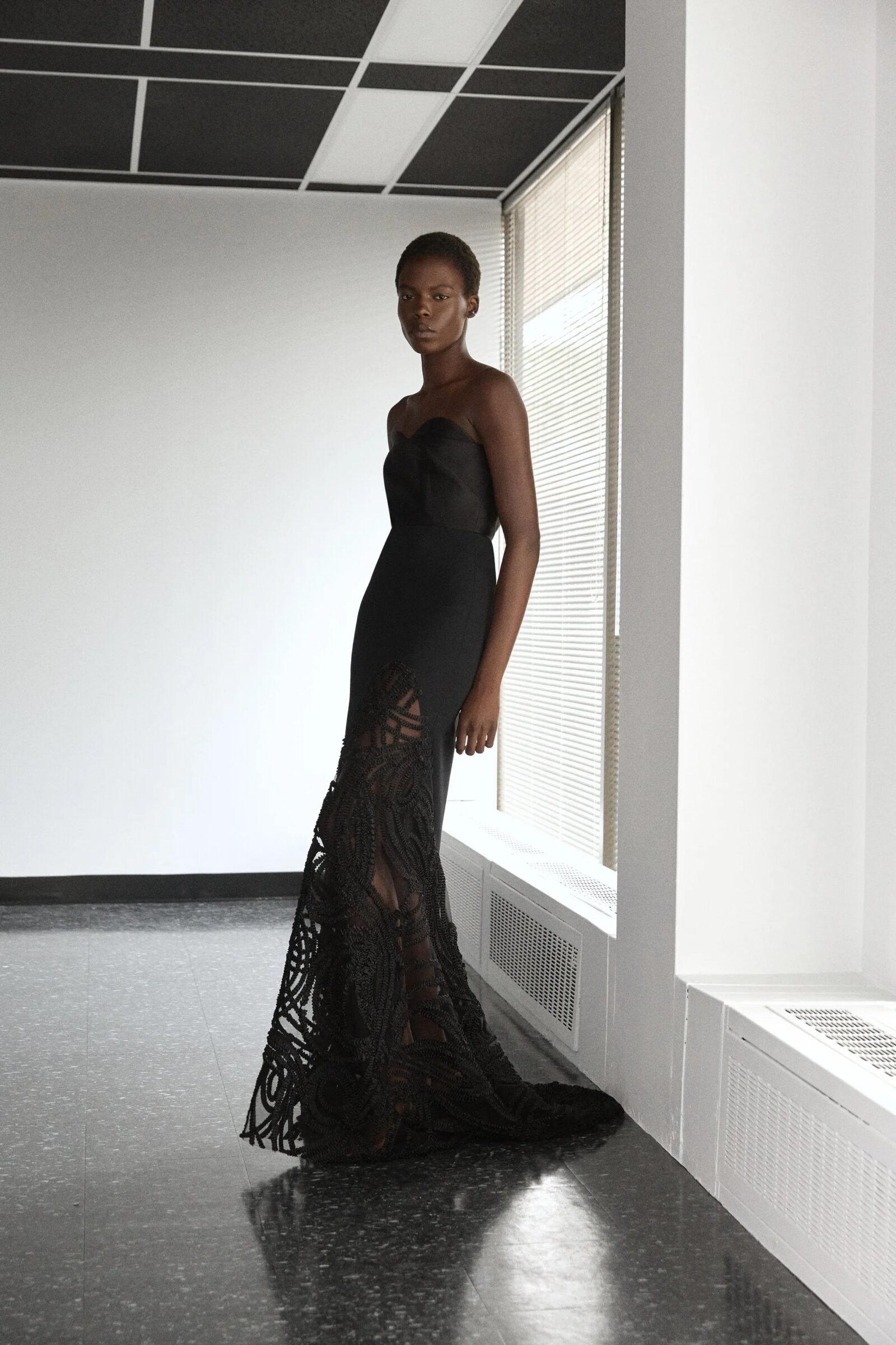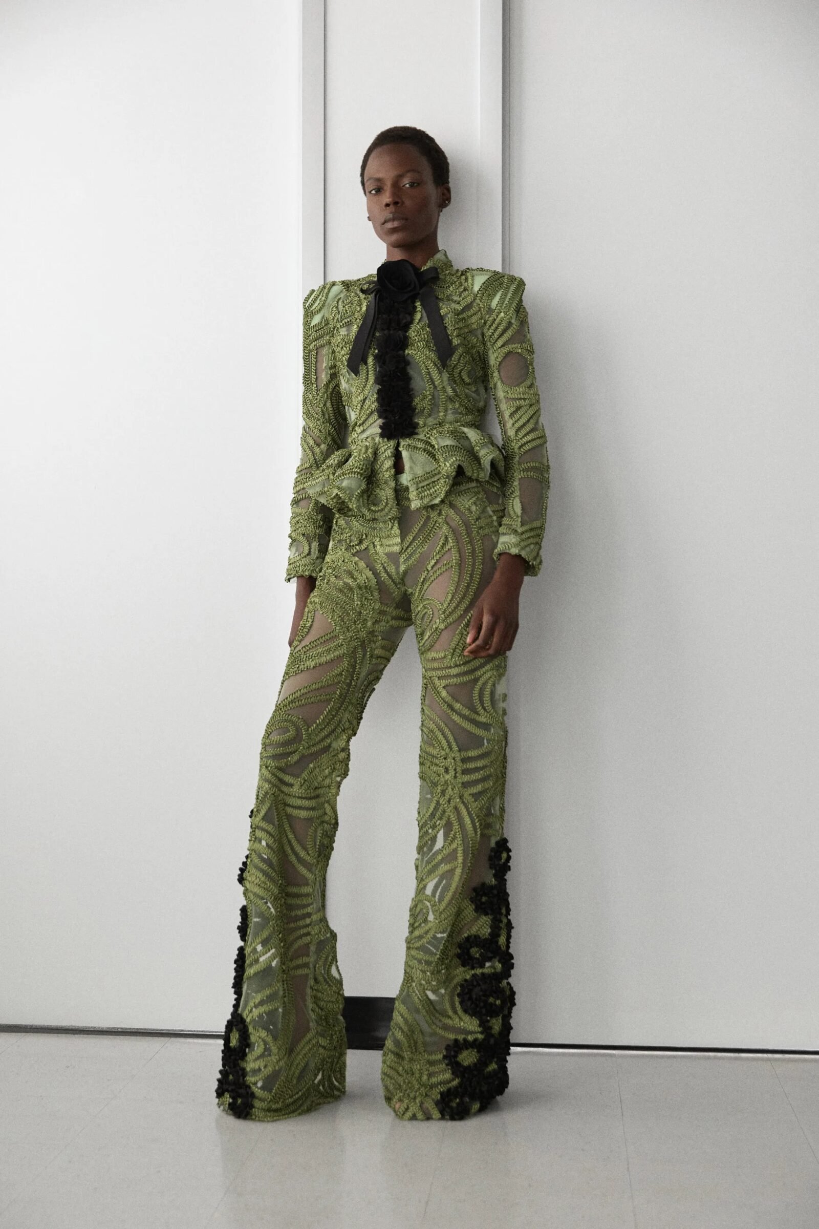 That influence showed up in gowns riffing on the Jamaican flag’s black, green, and gold — like a strapless mikado gown in vivid green and a sleek black embroidered dress. Beachside memories also informed the collection, from a shimmery shell-inspired cocktail frock to a coral ruffle gown evoking snorkelling adventures.