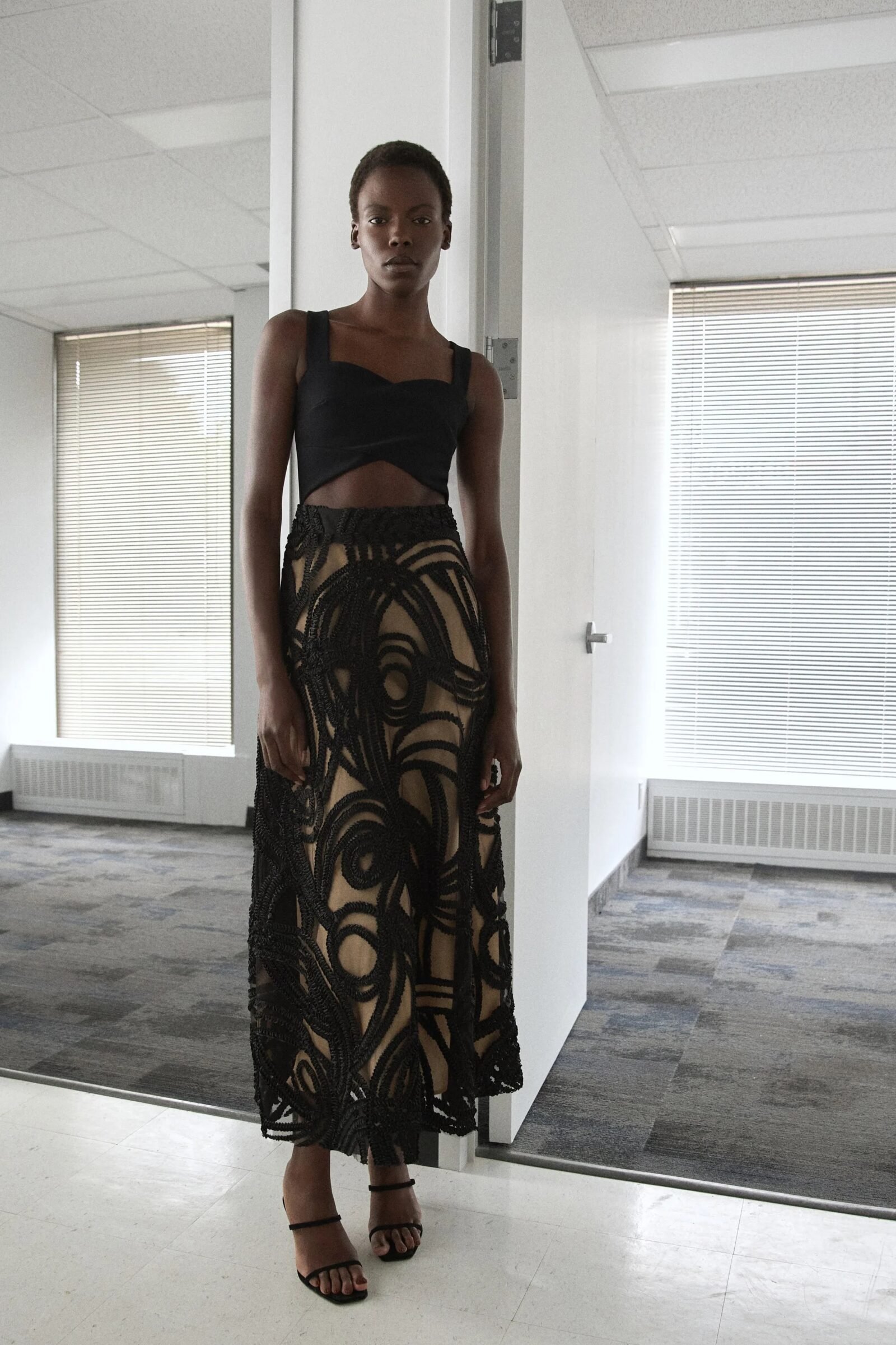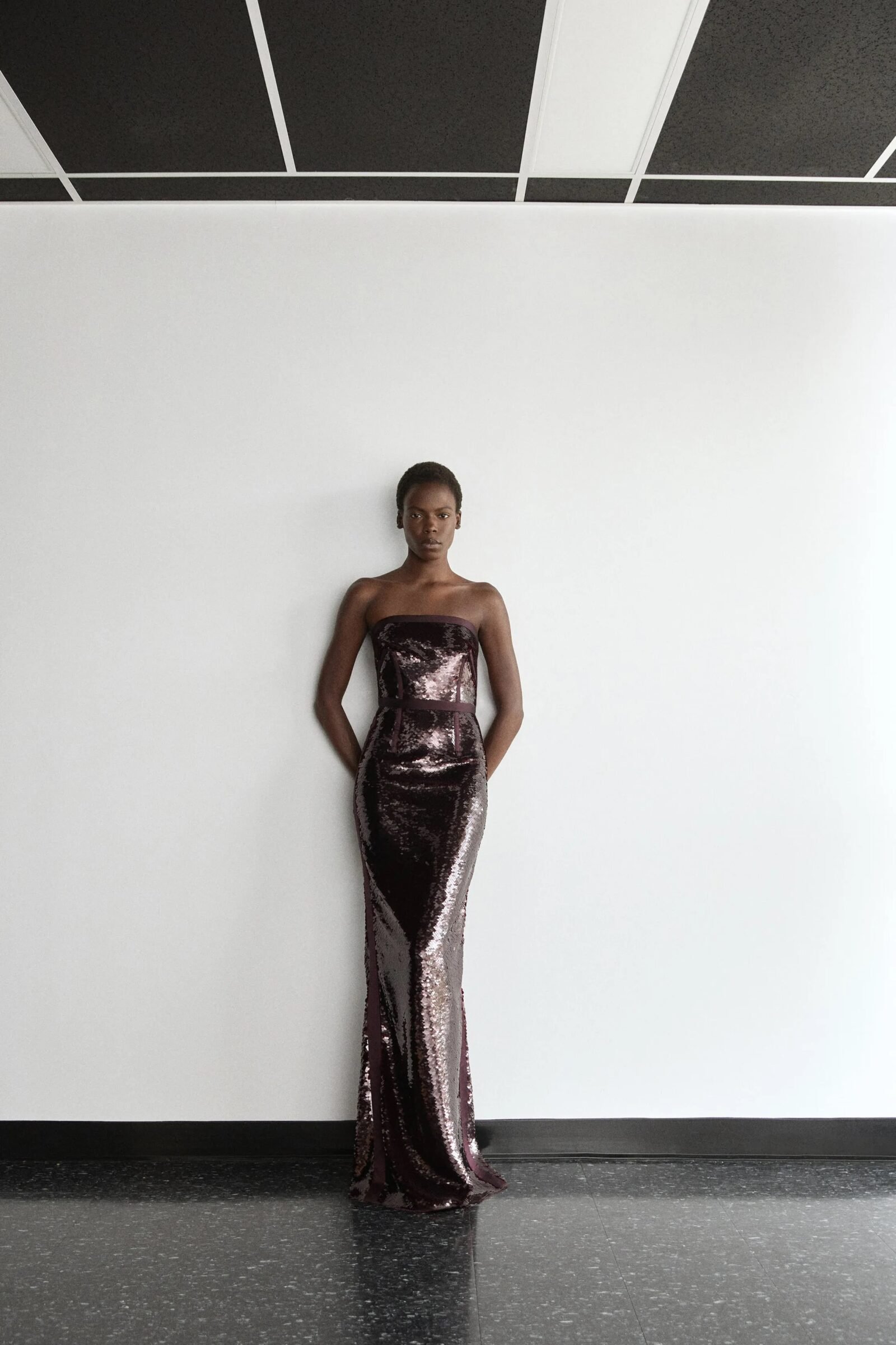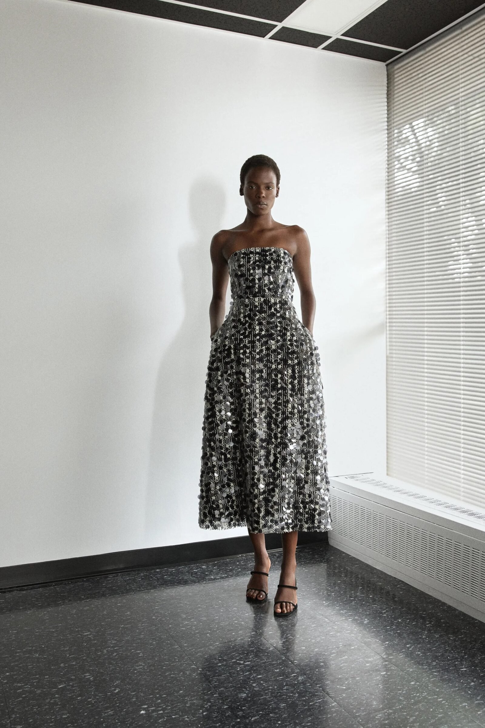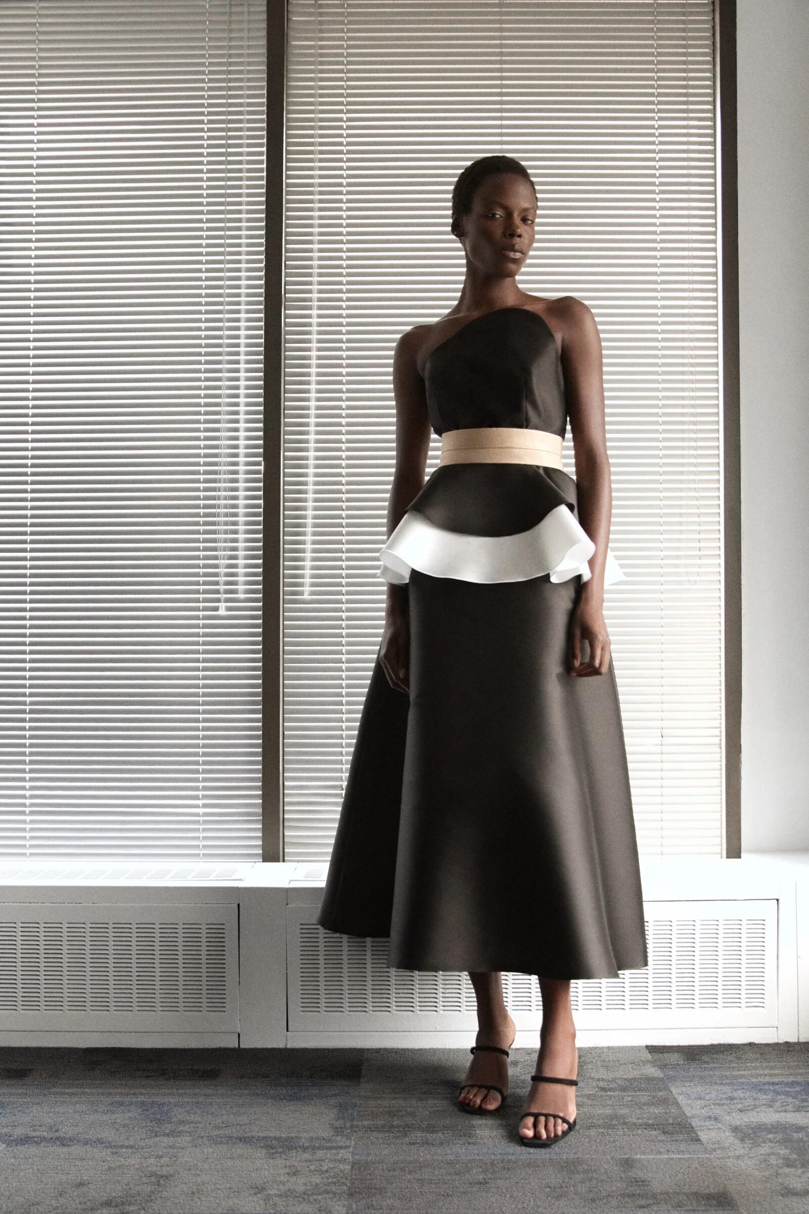 That influence showed up in gowns riffing on the Jamaican flag’s black, green, and gold — like a strapless mikado gown in vivid green and a sleek black embroidered dress. Beachside memories also informed the collection, from a shimmery shell-inspired cocktail frock to a coral ruffle gown evoking snorkelling adventures.