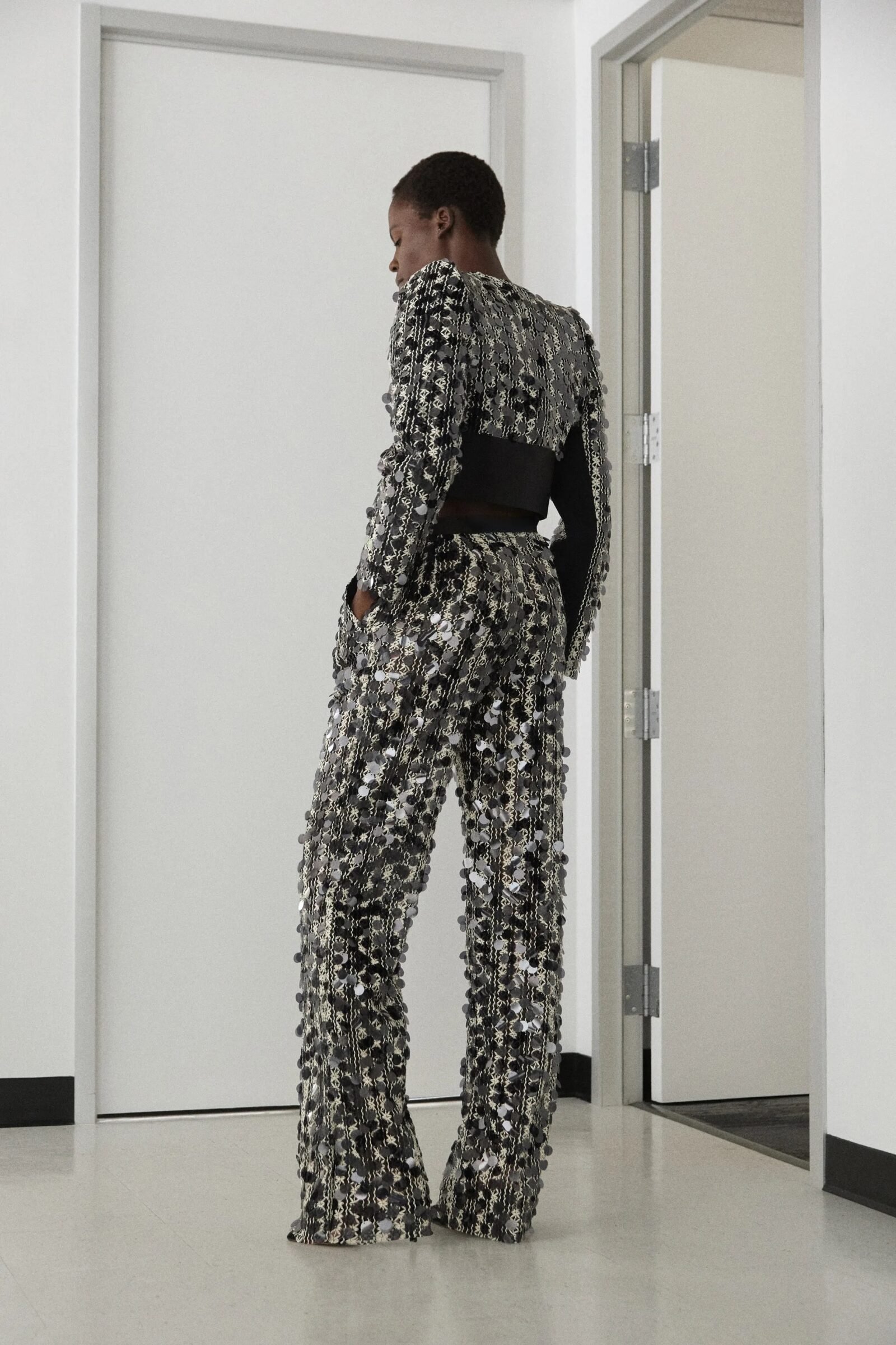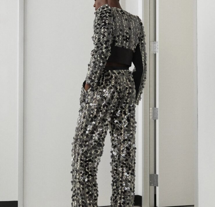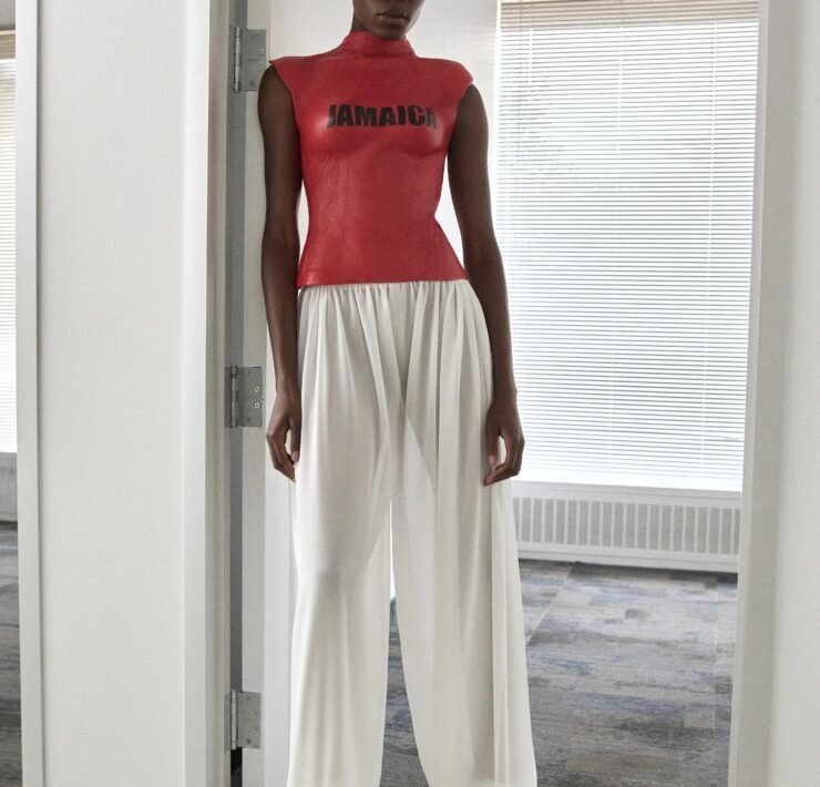 While known for maximalist glamour, Pickersgill experimented with restraint this season. A mossy green embroidered suit paid tribute to Bob Marley’s effortless cool, while his most direct homage came in a red leather top stamped “Jamaica,” a nod to the country’s iconic 1970s tourism poster.