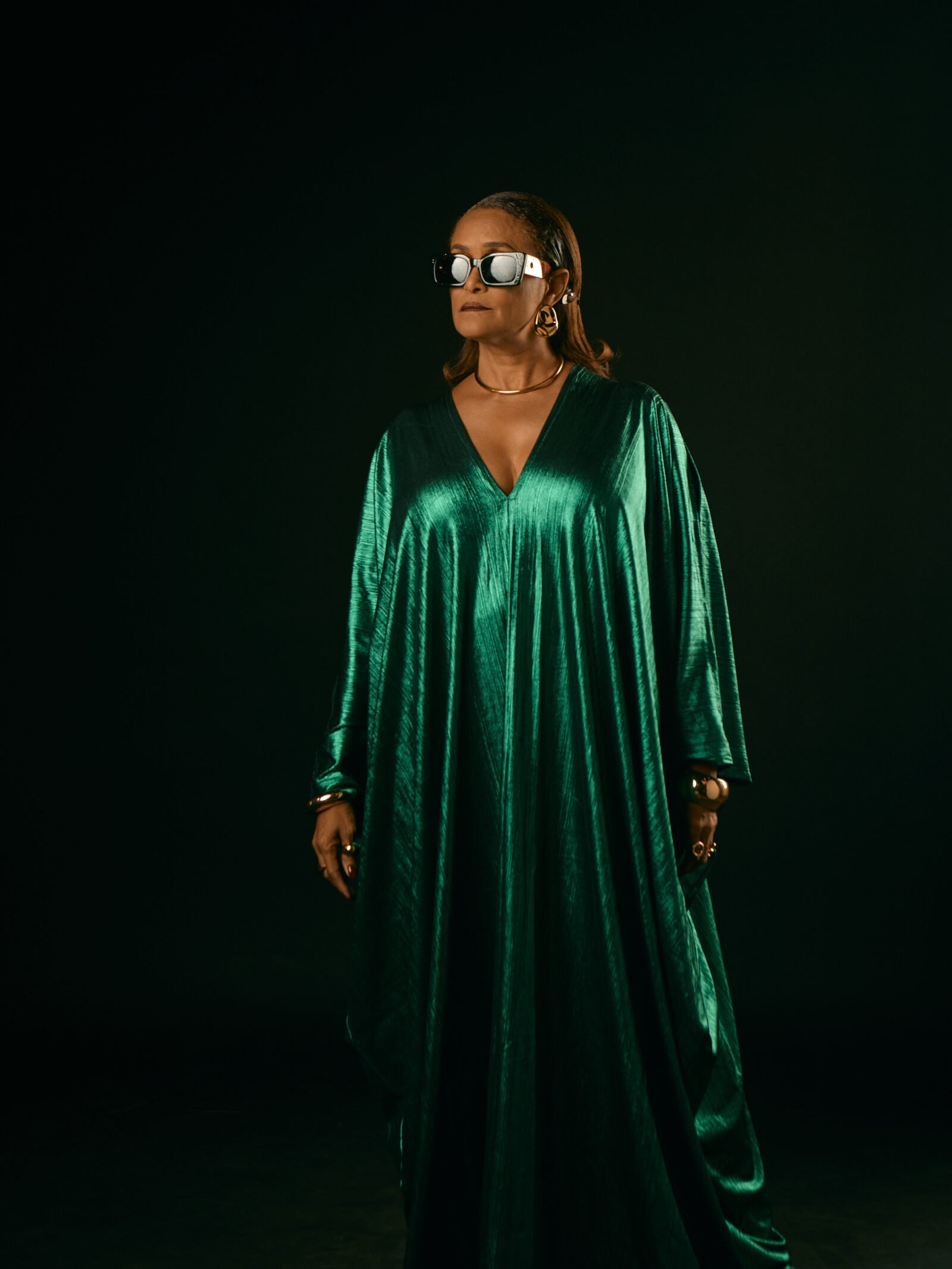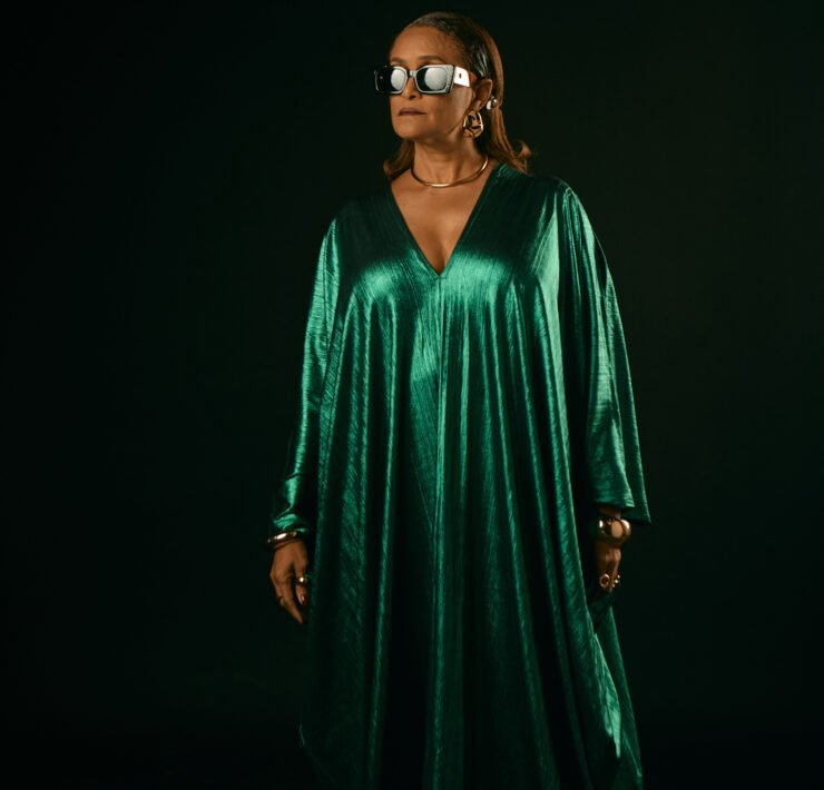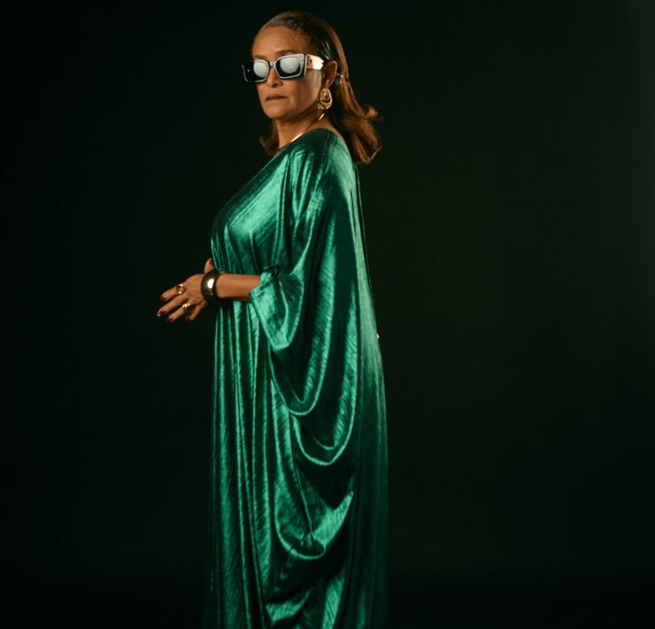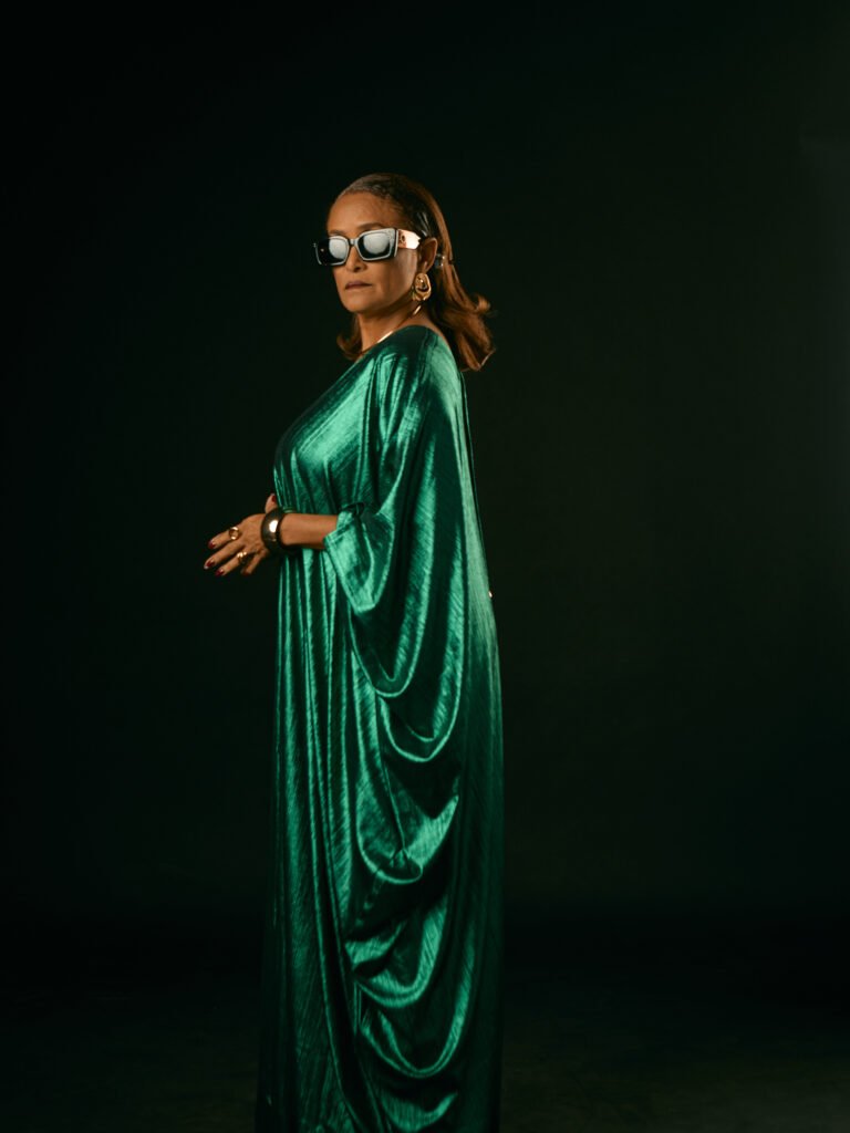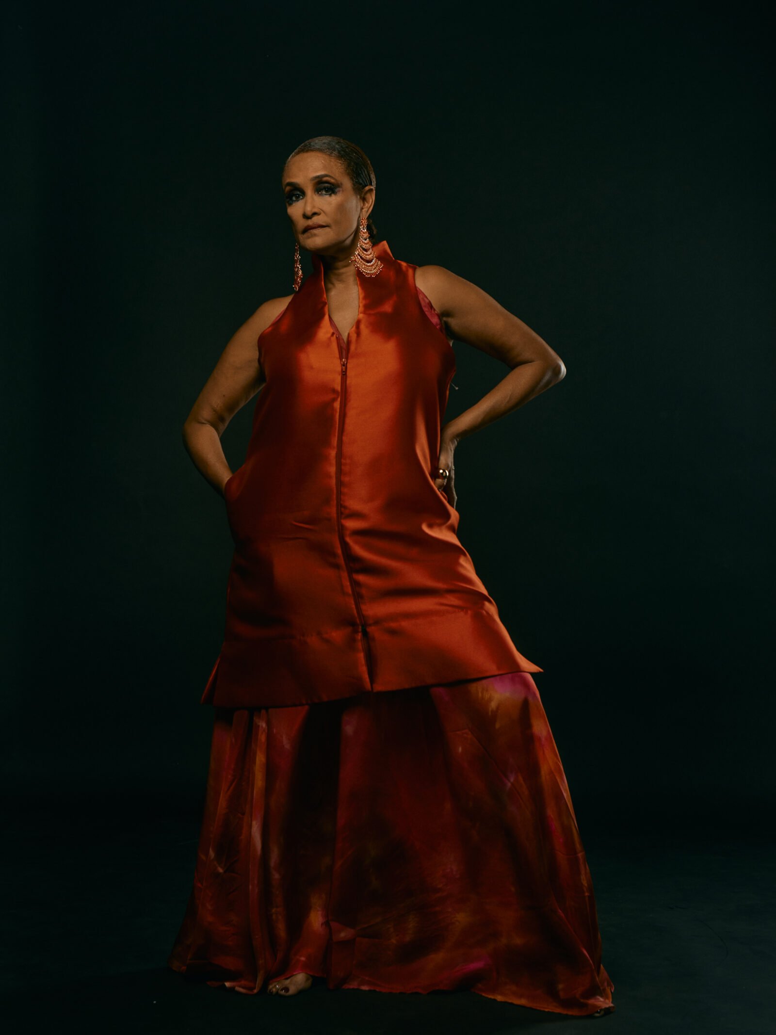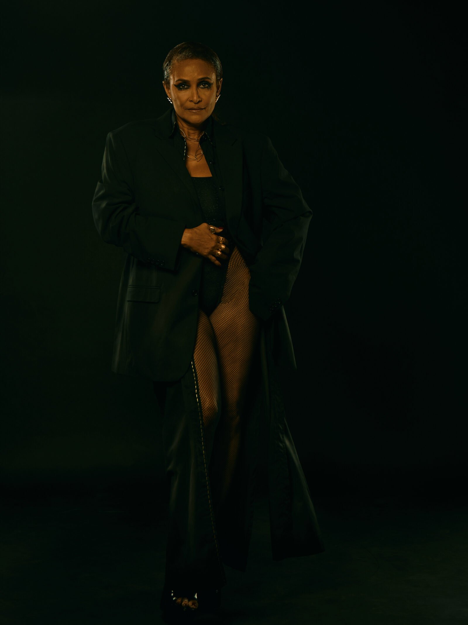 +1 It’s an unseasonably warm Saturday morning in October, and Giselle Laronde-West can’t stop dancing. It’s her birthday month and, on set for our Body & Age issue, it’s a party. “I haven’t worn heels this high in a while,” she says slyly, holding onto my shoulder, as she settled into a pair of black, glossy, 6-inch platforms. Slipping on an oversized jacket, she bounced onto the set, joking with the team, wining to Yung Bredda’s hit Greatest Bend Over, and laughing heartily. At 61, she’s a delightful ball of confidence. Buttery and exuberant. And she rejects the idea of being pigeonholed.