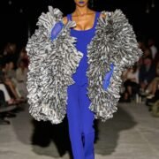 Martine Rose staged her latest show inside the St. Marylebone Jobcentre, transformed into an intimate couture-style salon with ruffled white curtains and wooden chairs. This season, the designer shifted from her trademark oversized shapes to shrunken, cinched silhouettes that carried a deliberate awkwardness — yet exuded a Mills & Boon–style romance.