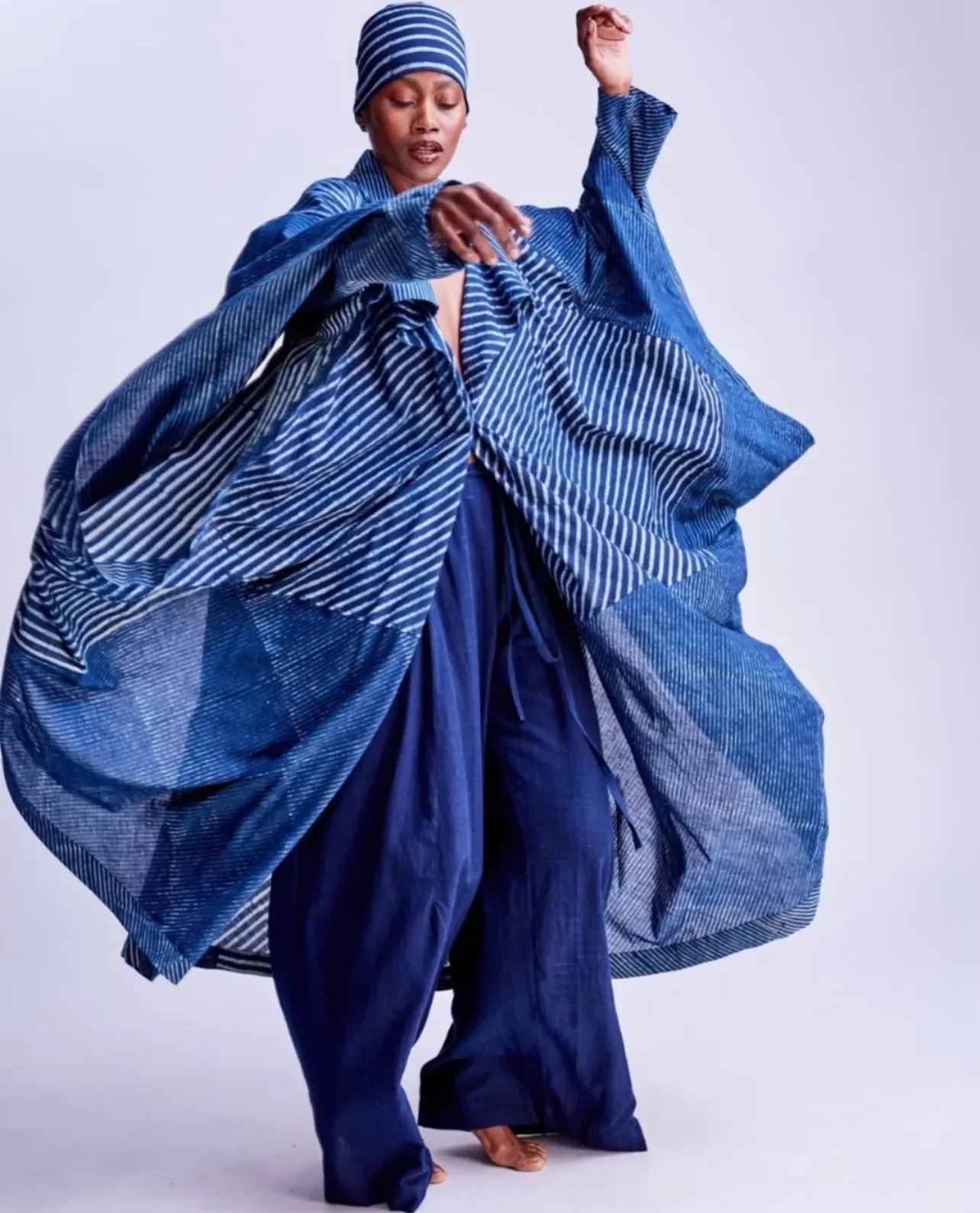 The narrative of this work is a meandering, non-stop stream of social justice, mas, ethnicity, and spirituality. With a tendency toward extremes, The Cloth has carved out a stylish niche. It goes beyond the world of sharp tailoring and perfect fit. Oh, but it is so perfect. One minute, you’re carried away in capacious swirling gowns of West Indian Sea Island cotton. The next, you’re enveloped in sheaths of paper-thin linen. Out of his fertile imagination we get a patchwork of variegated indigo. We get frocks that wrap and wind with compelling versatility. His signature appliqué technique decorates swollen sleeves found atop layered mini dresses that offer an ageless, seductive exuberance for any wearer.