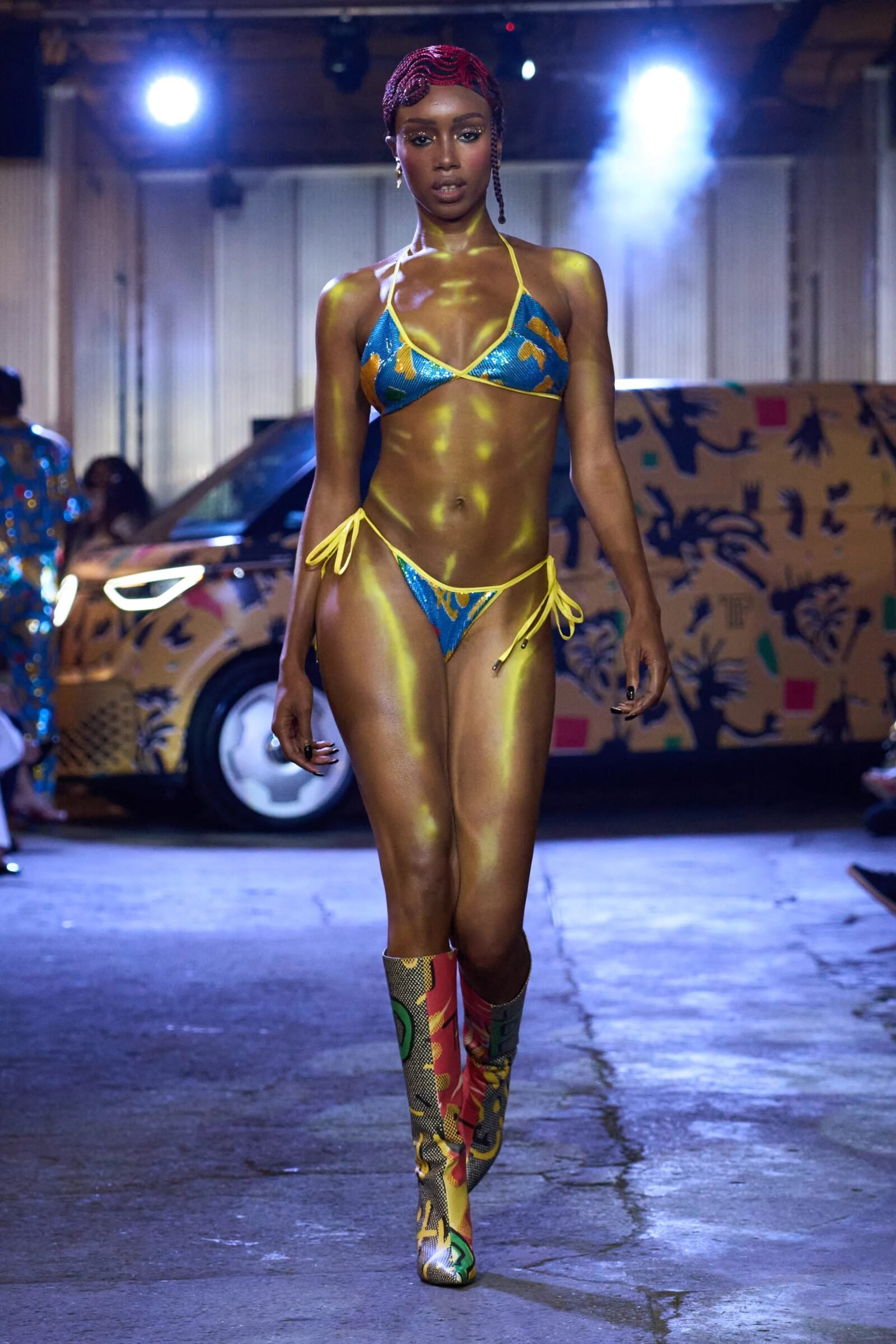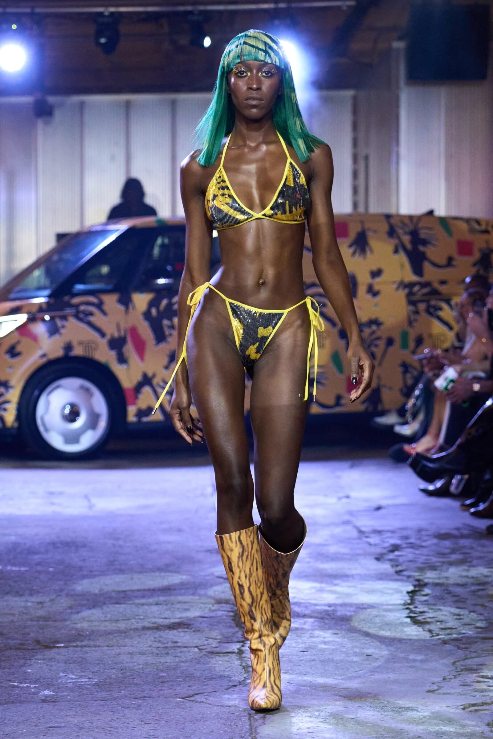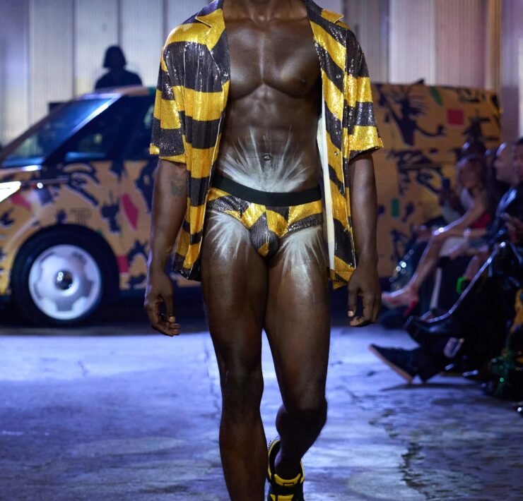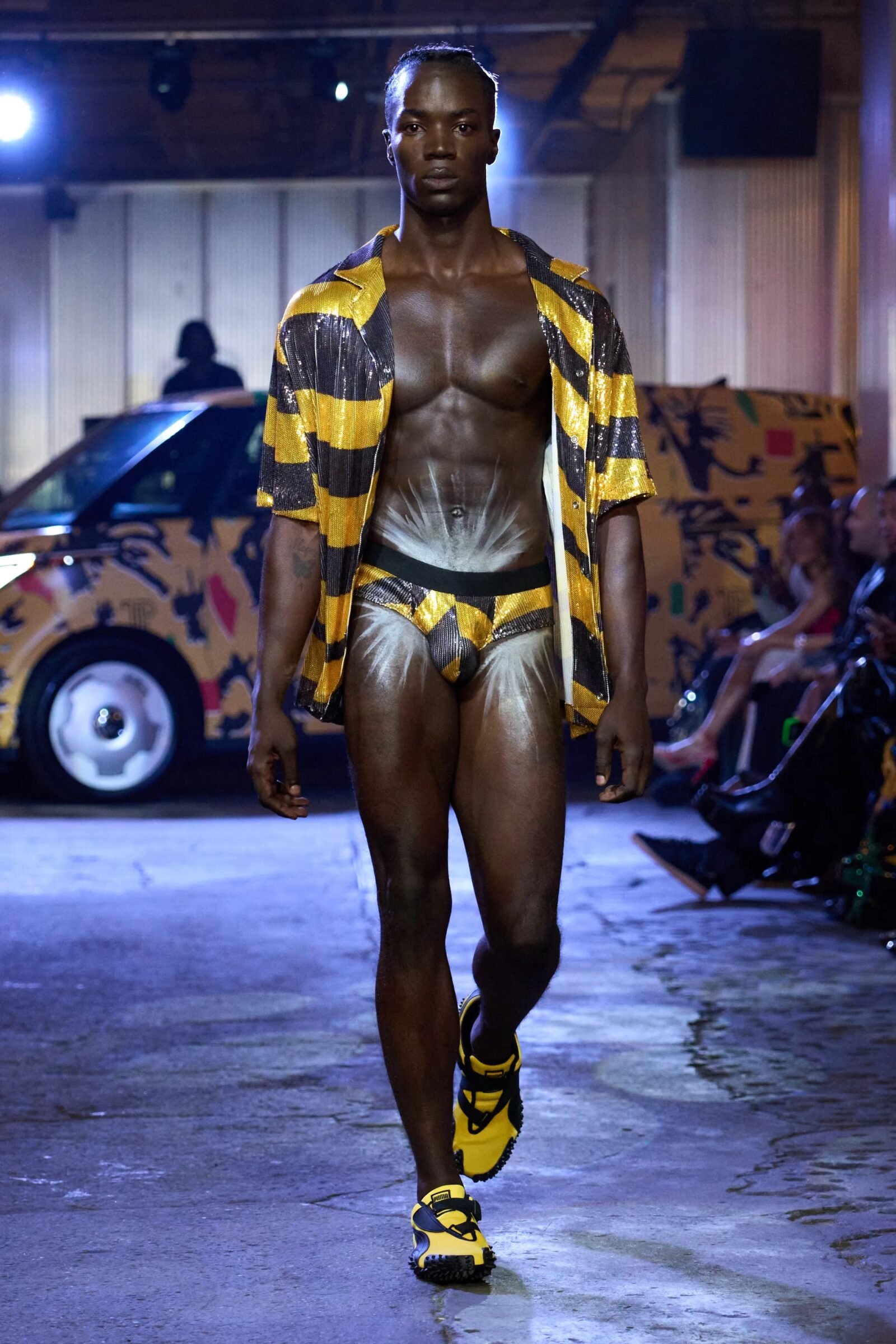 This season’s lineup was skimpy yet spirited — sequined mini dresses, barely-there bikinis, and slinky briefs — designed for bodies of every shape and identity. Highlights included a sequined polo-shirt dress, floral-appliqué separates, and a finale frock pieced together from ruffled, rainbow-hued strips.
