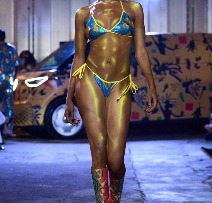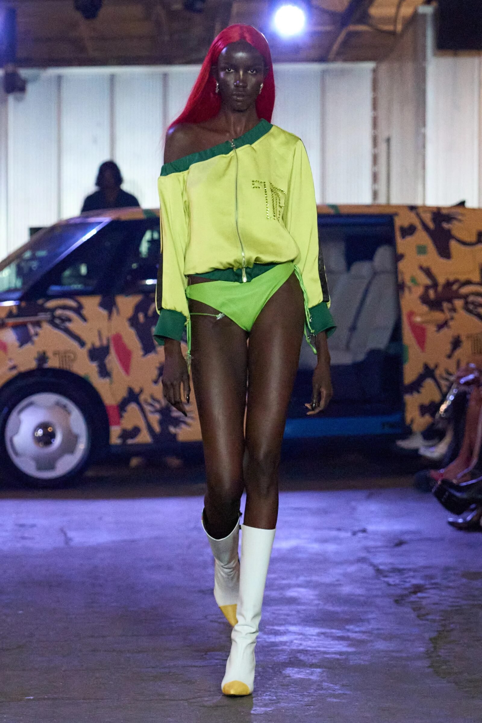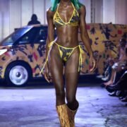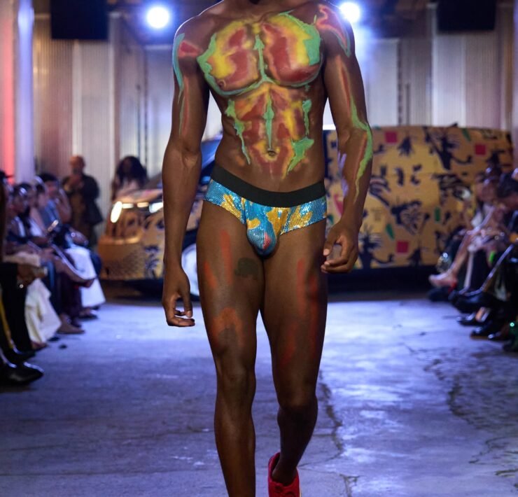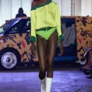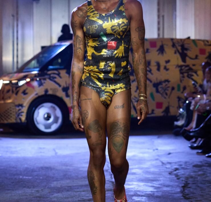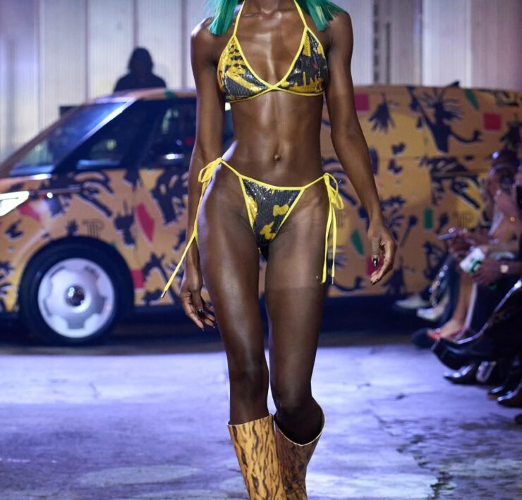 This season’s lineup was skimpy yet spirited — sequined mini dresses, barely-there bikinis, and slinky briefs — designed for bodies of every shape and identity. Highlights included a sequined polo-shirt dress, floral-appliqué separates, and a finale frock pieced together from ruffled, rainbow-hued strips.